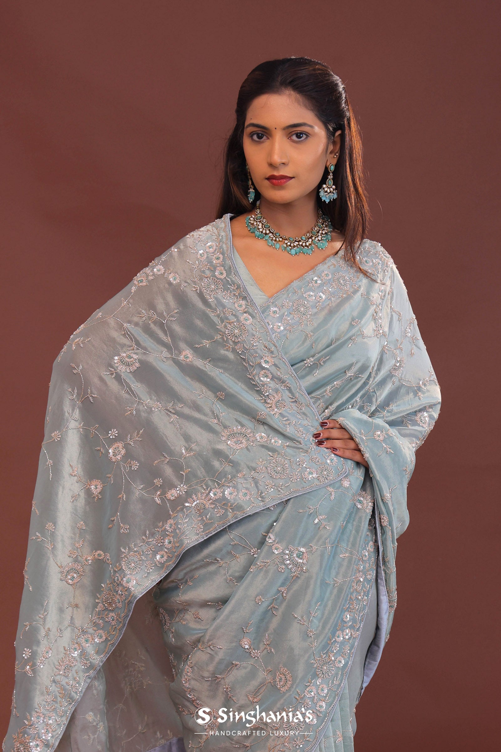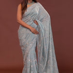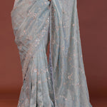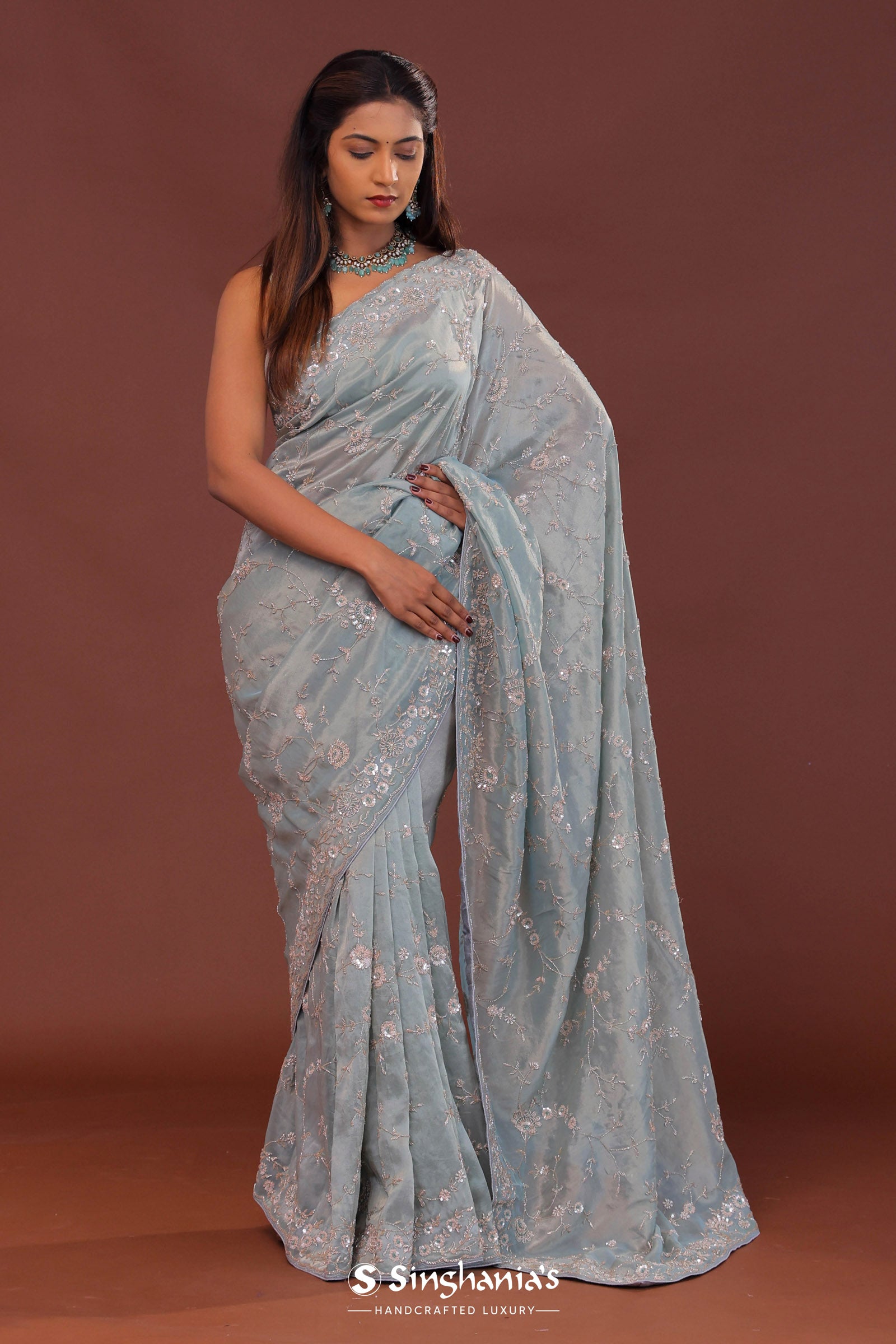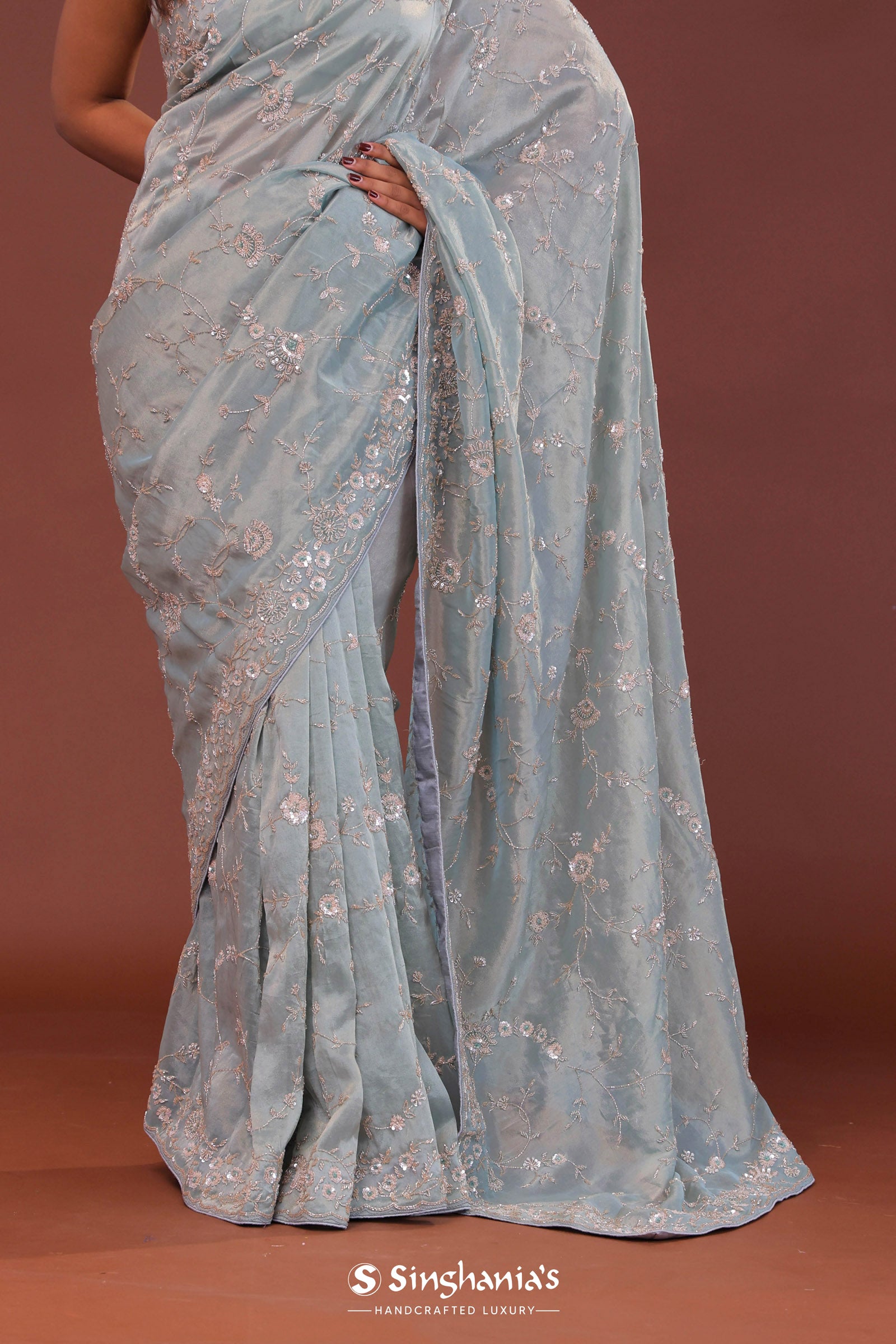 Powder Blue Tissue Embroidery Saree With Scallop Border