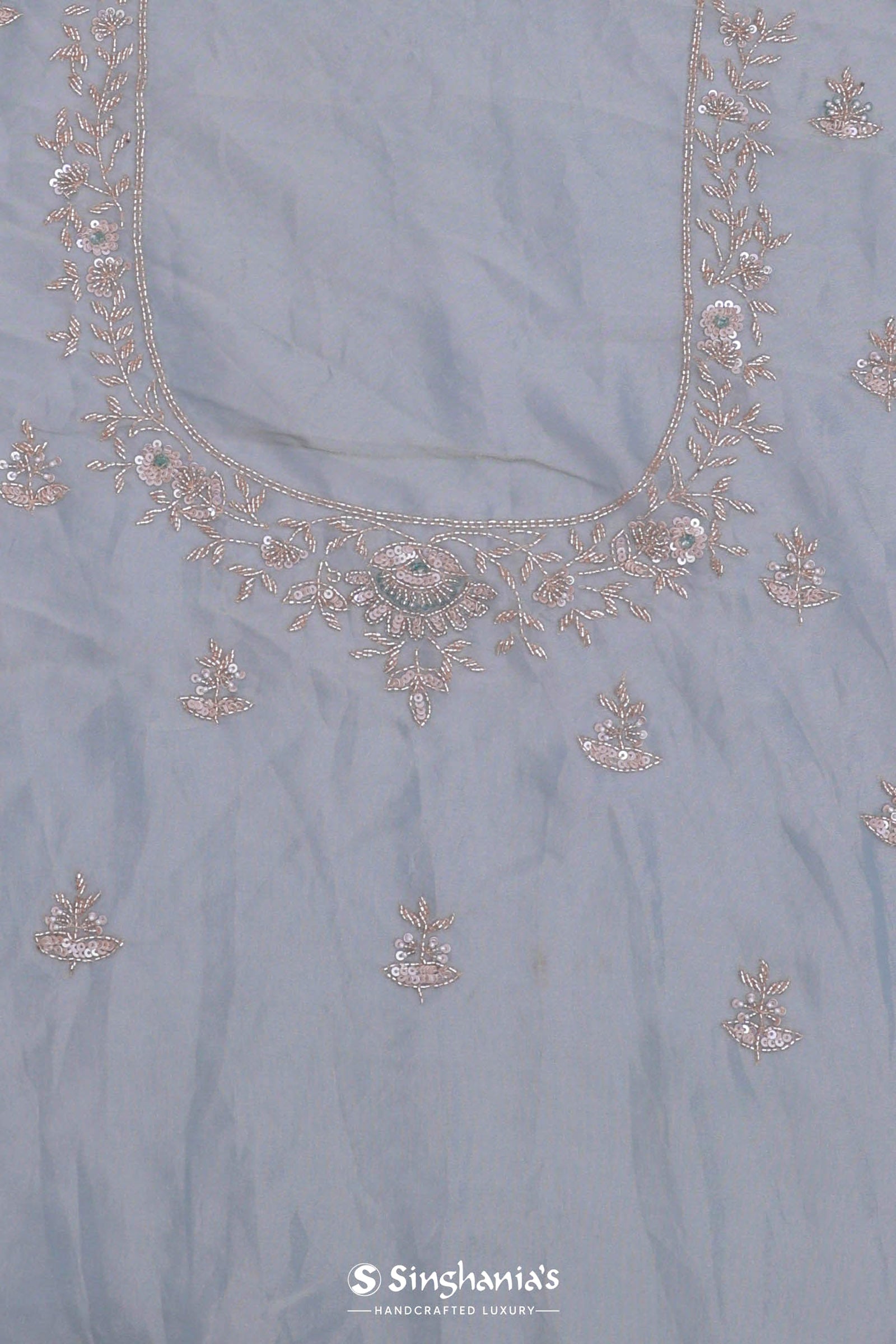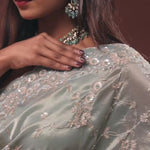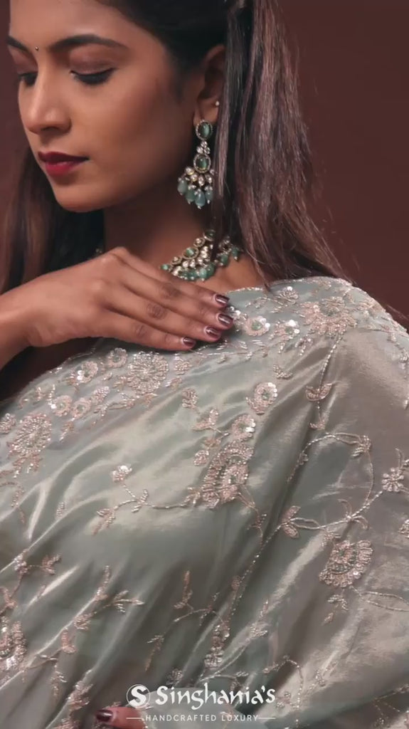 Powder blue embroidery on Tissue kardana and sequin work embellish this saree with a scalloped border. The body has kardana detailing and dyeable sequins, which offer a subtle shine