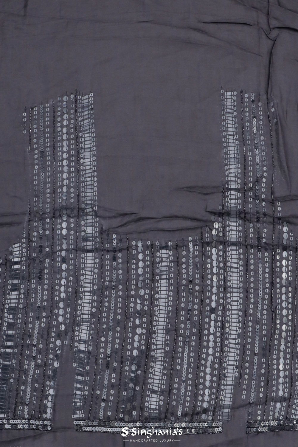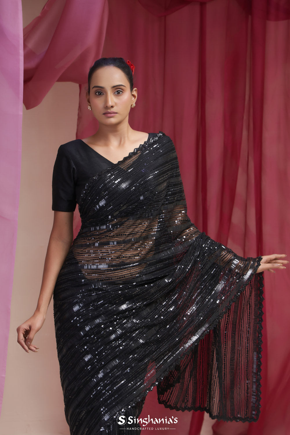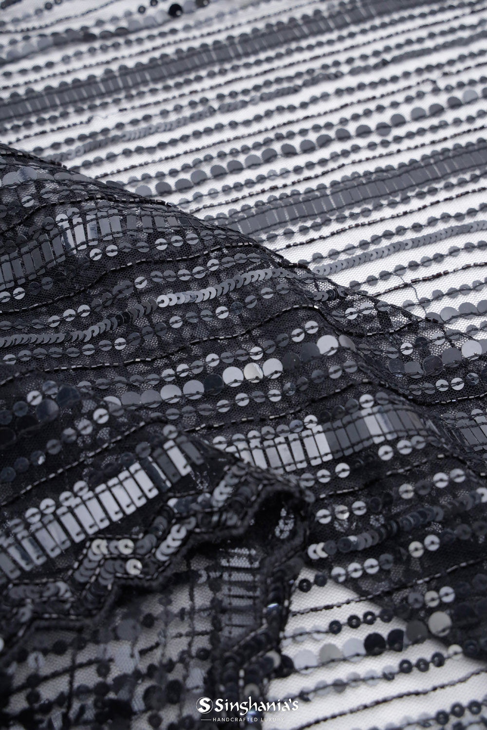 A sophisticated rich black net designer saree with horizontal stripes jaali work all over in sequins, thread work embroidery. Accentuated with small embroidery chevron lace border, this saree is suitable for festive and wedding occasions.
