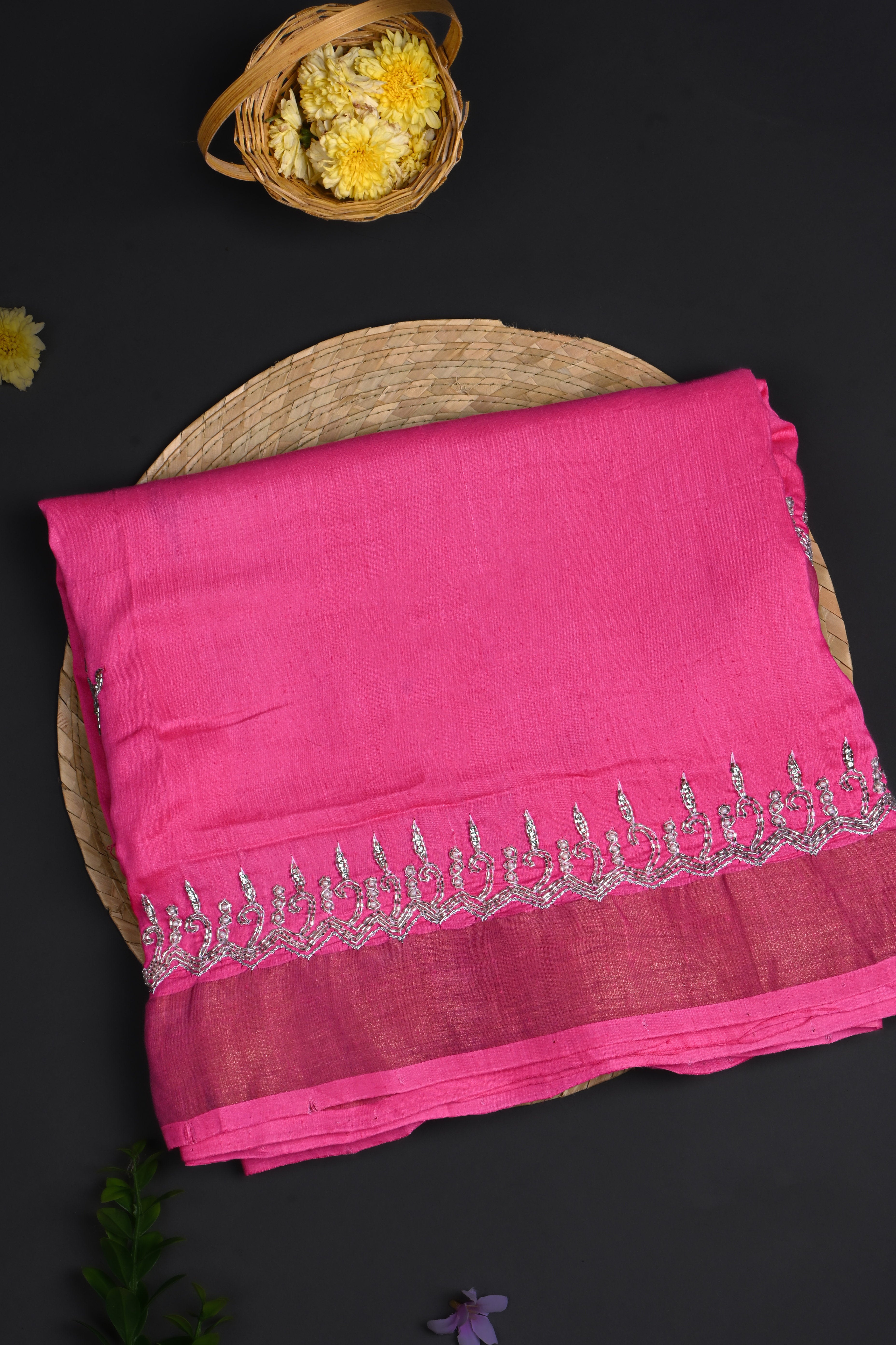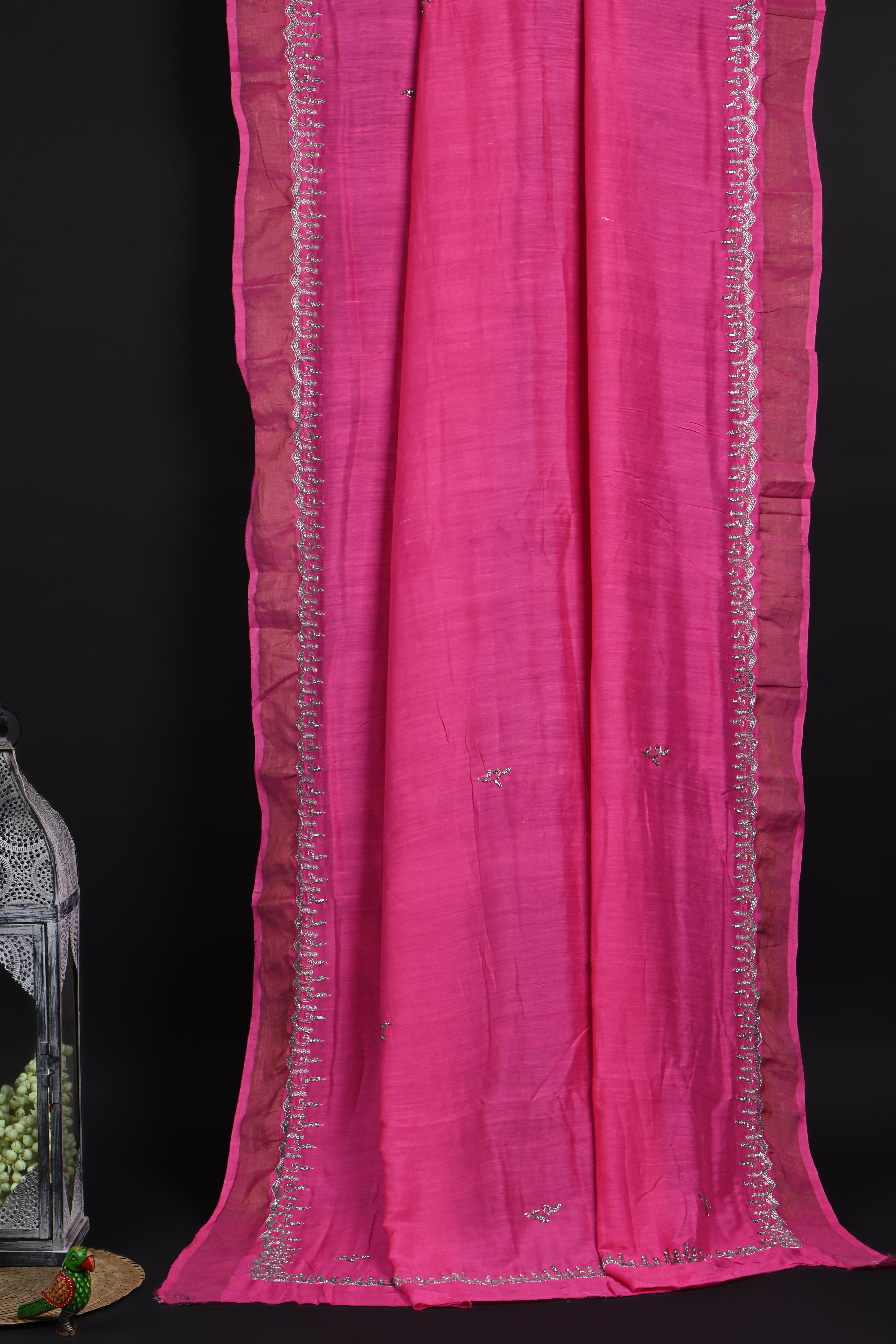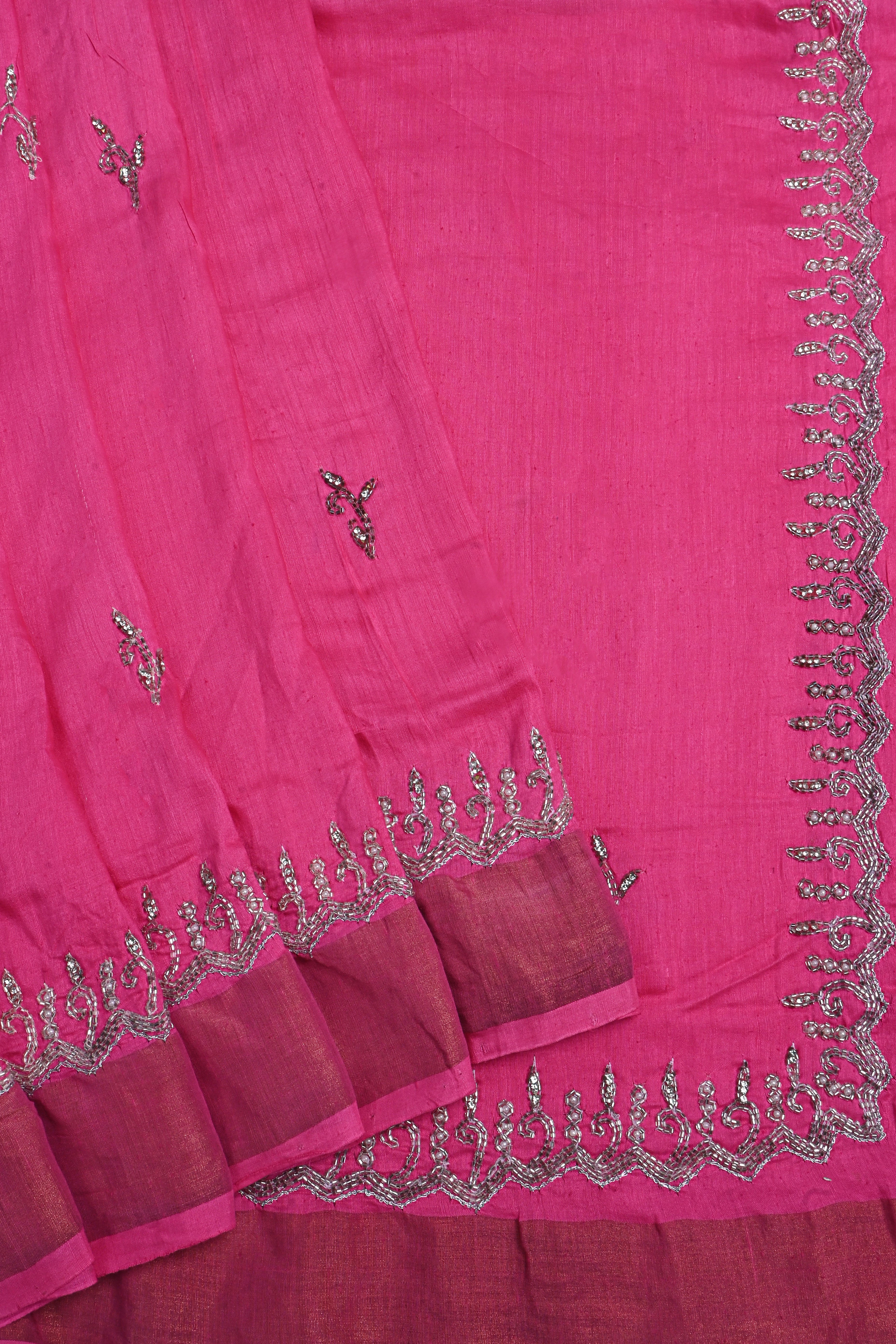 The royal pink floral embroidered silk saree with cutdana embroidered border and blouse for a classy neat ethnic look with grace.