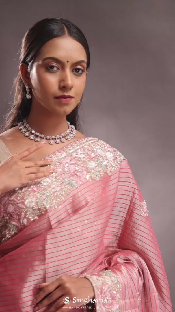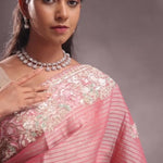 Salmon Pink Organza Embroidery Saree With Pearls And Sequins Detailing