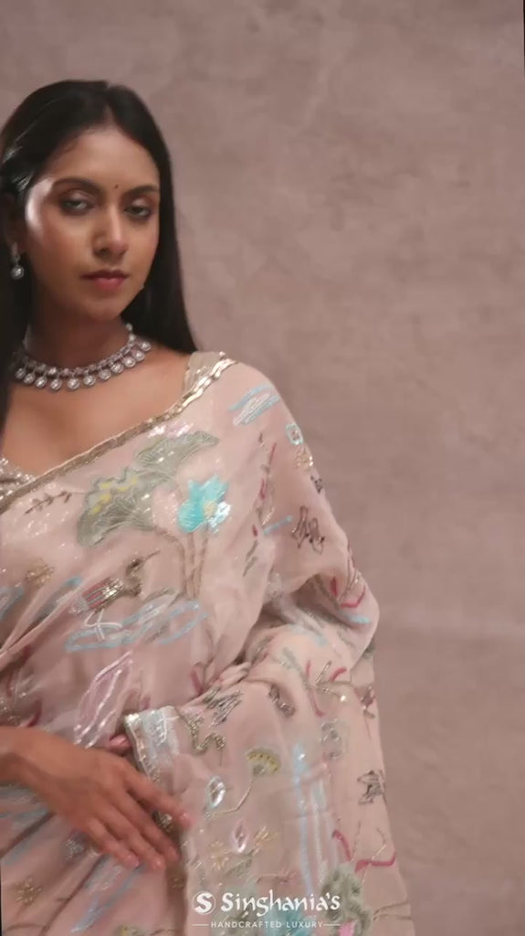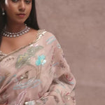 This salmon pink organza saree presents delicate embroidery across the body of the saree and a scallop border with sparkling sequins work, offering a perfect blend of elegance and shine for special occasions.