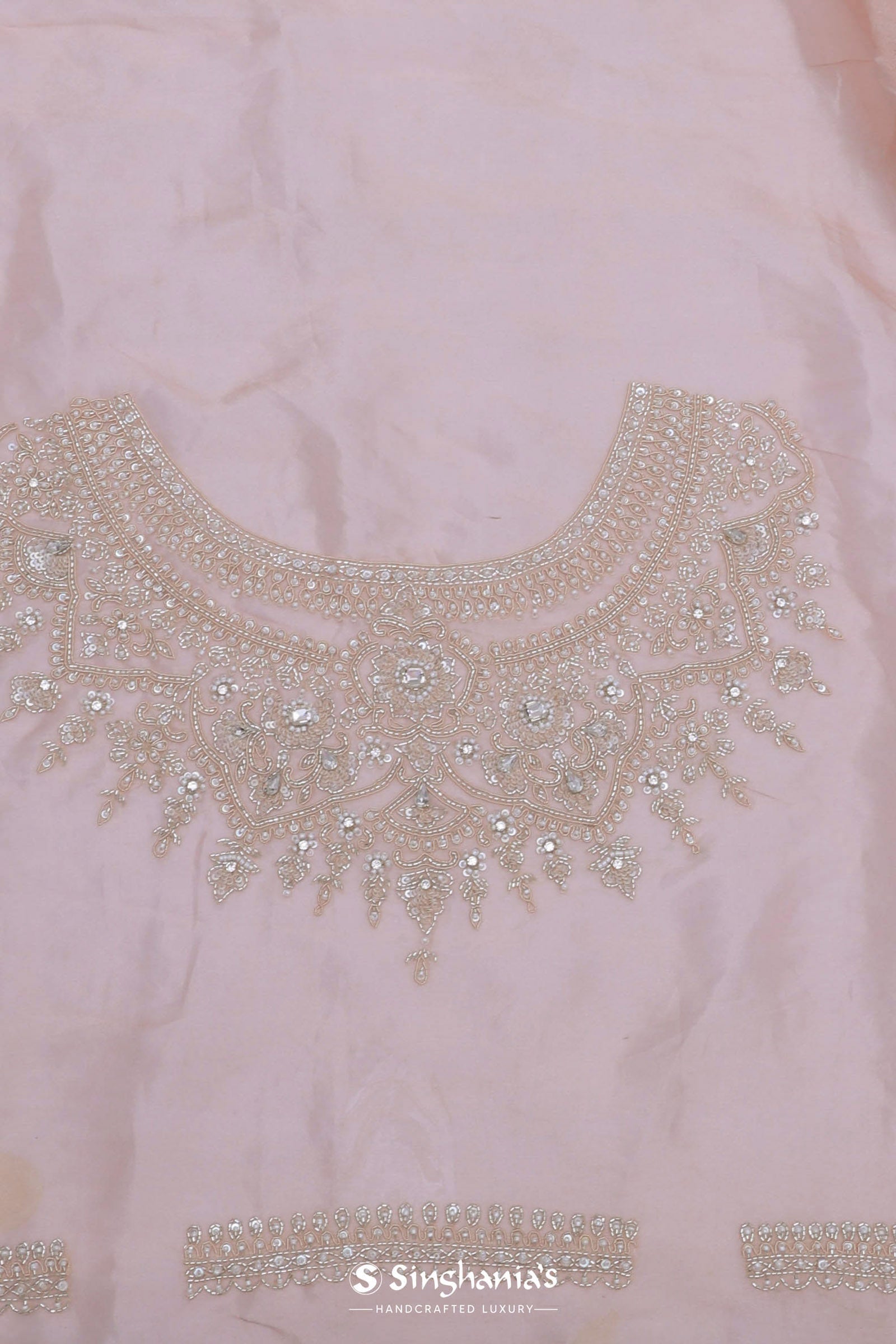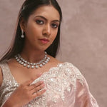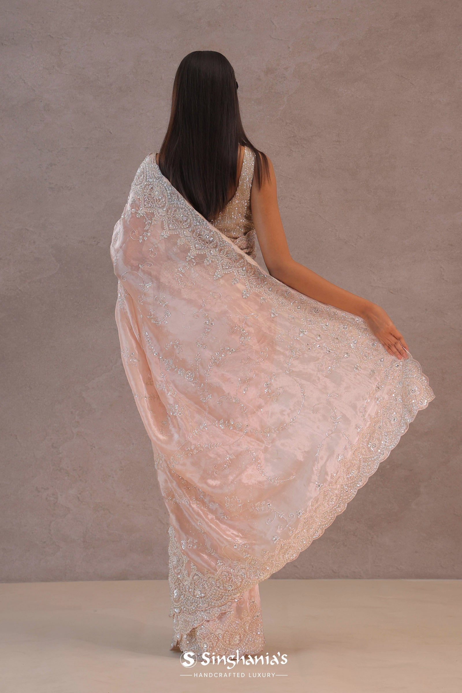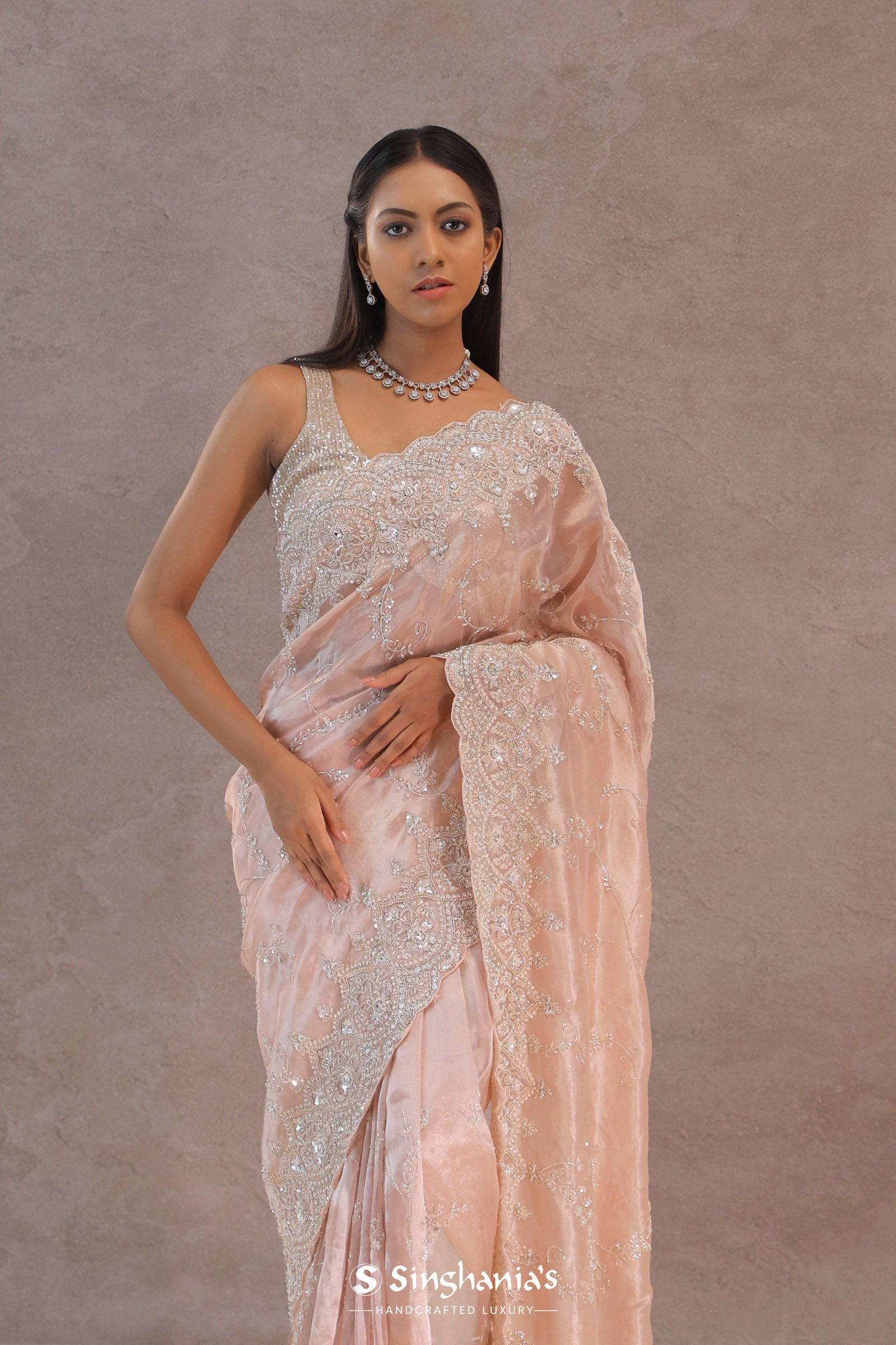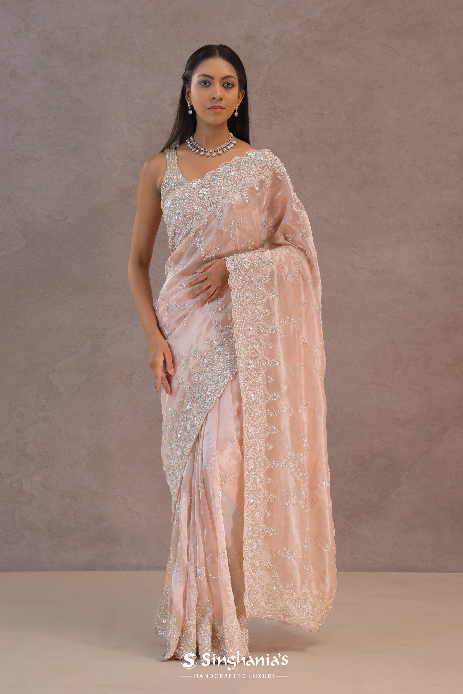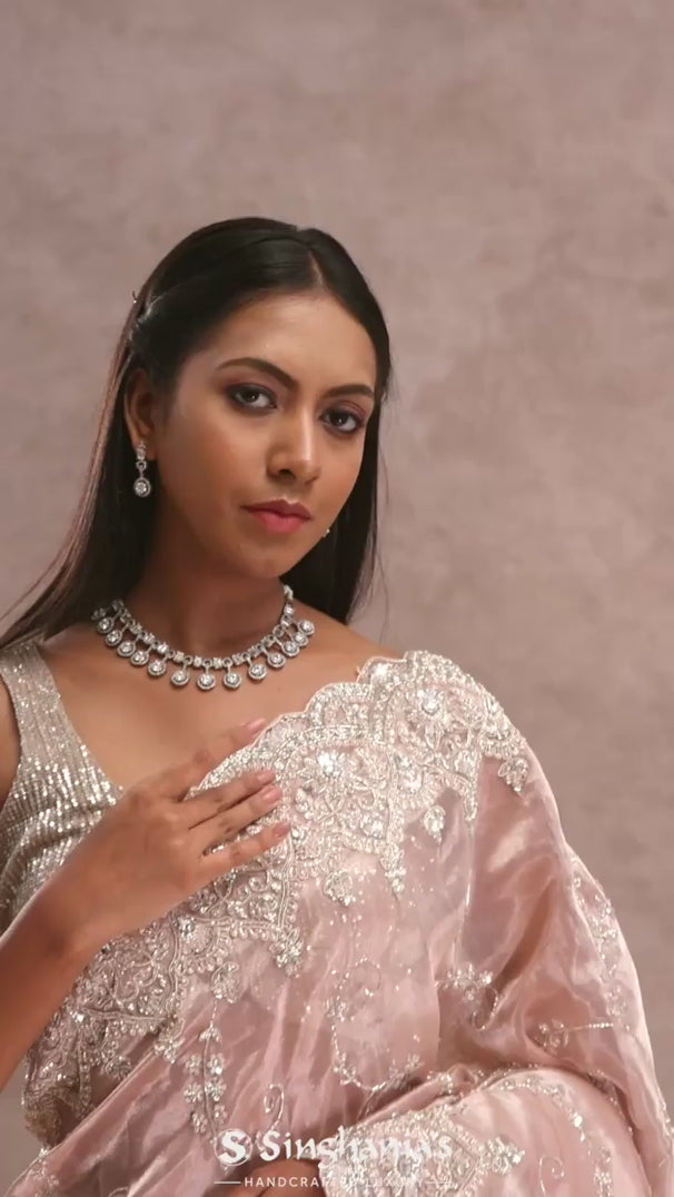This soft peach tissue organza saree features a scalloped border with sequins and delicate floral embroidery across the body, offering a graceful and shimmering look. Perfect for elegant occasions.