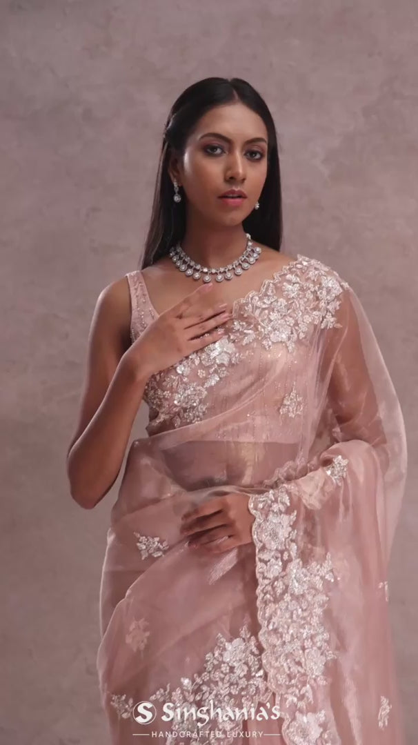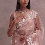 This soft salmon pink organza saree features delicate embroidery with butti motifs and a scalloped border, both embellished with subtle sequins work. Lightweight and graceful, it’s perfect for festive and special occasions.