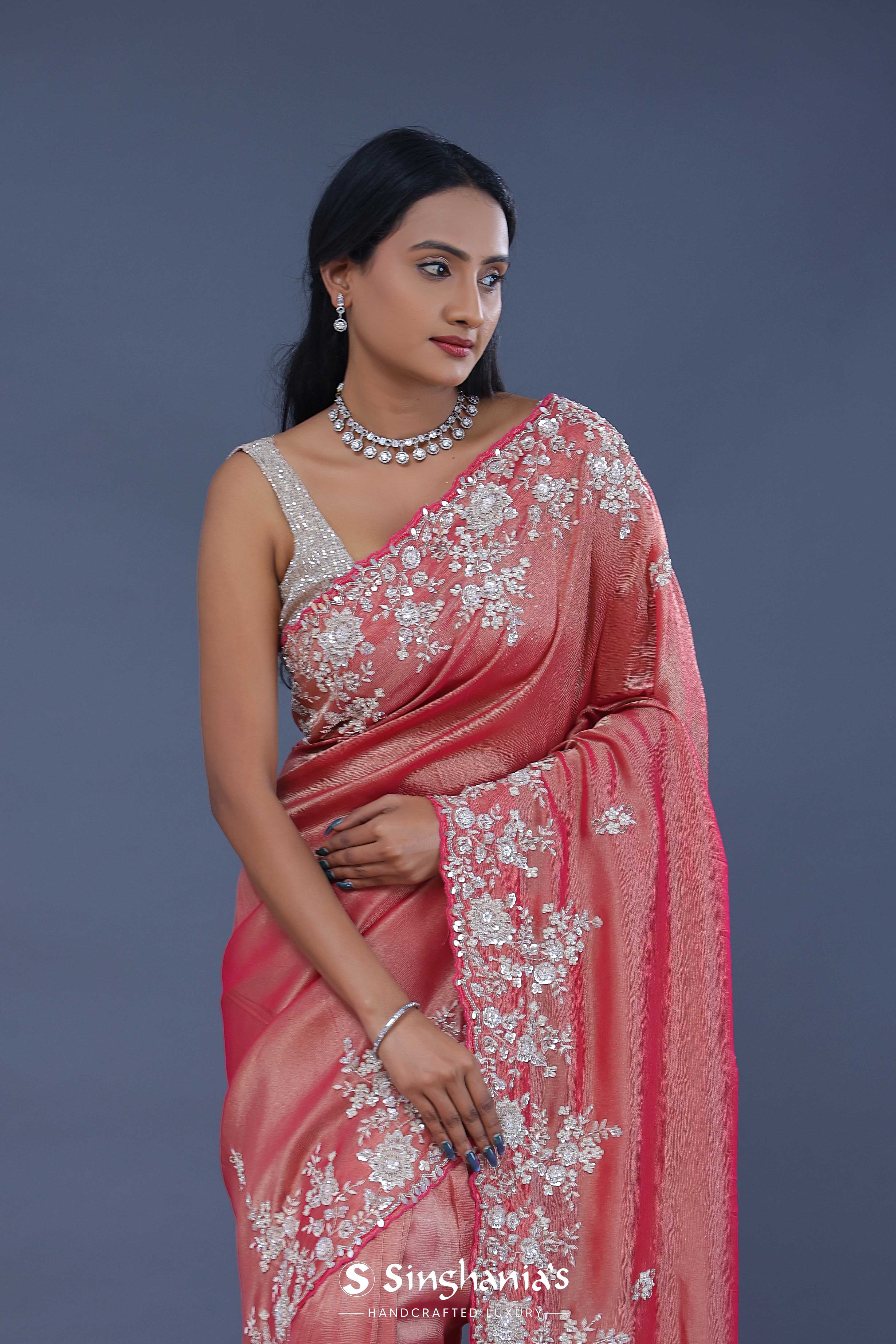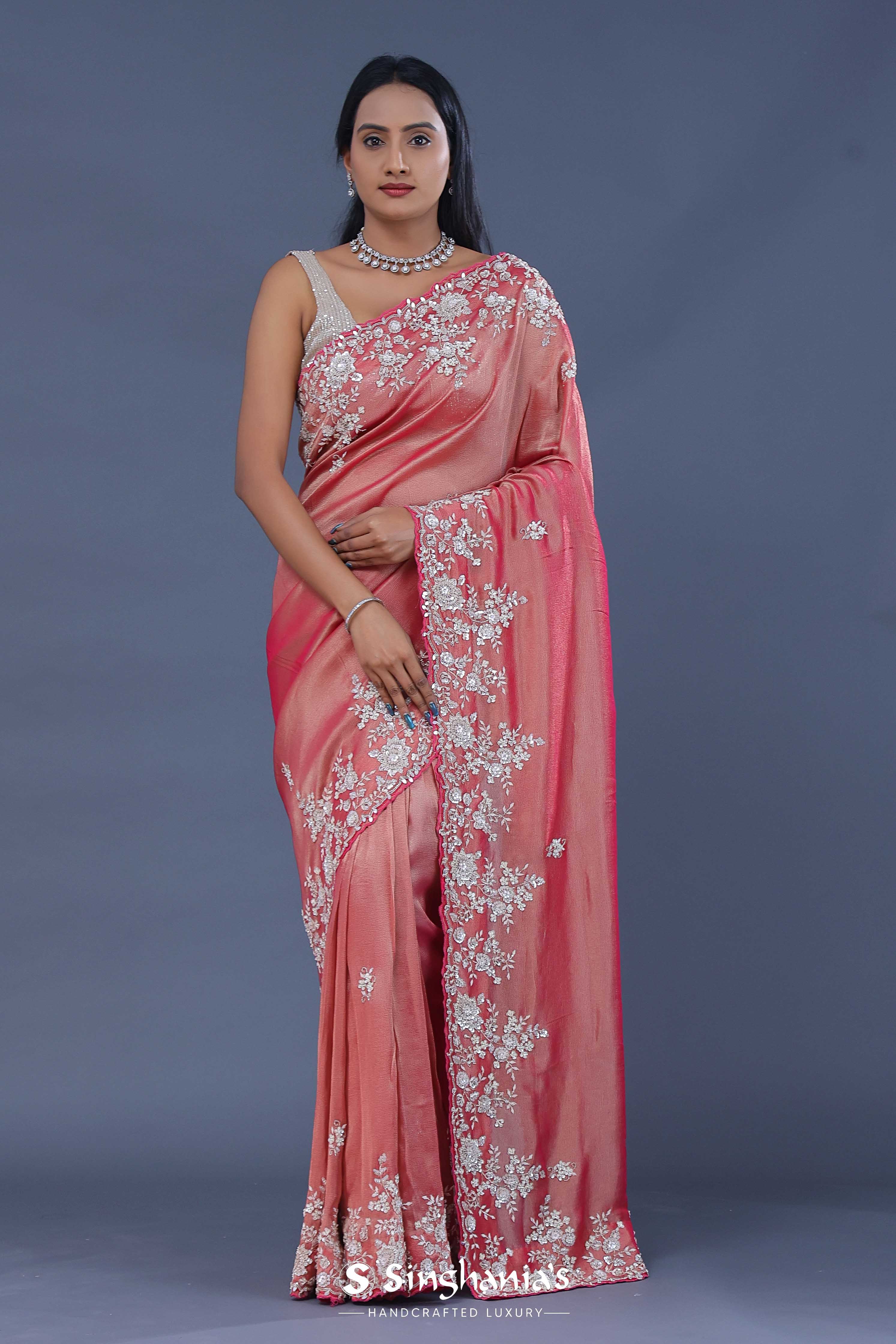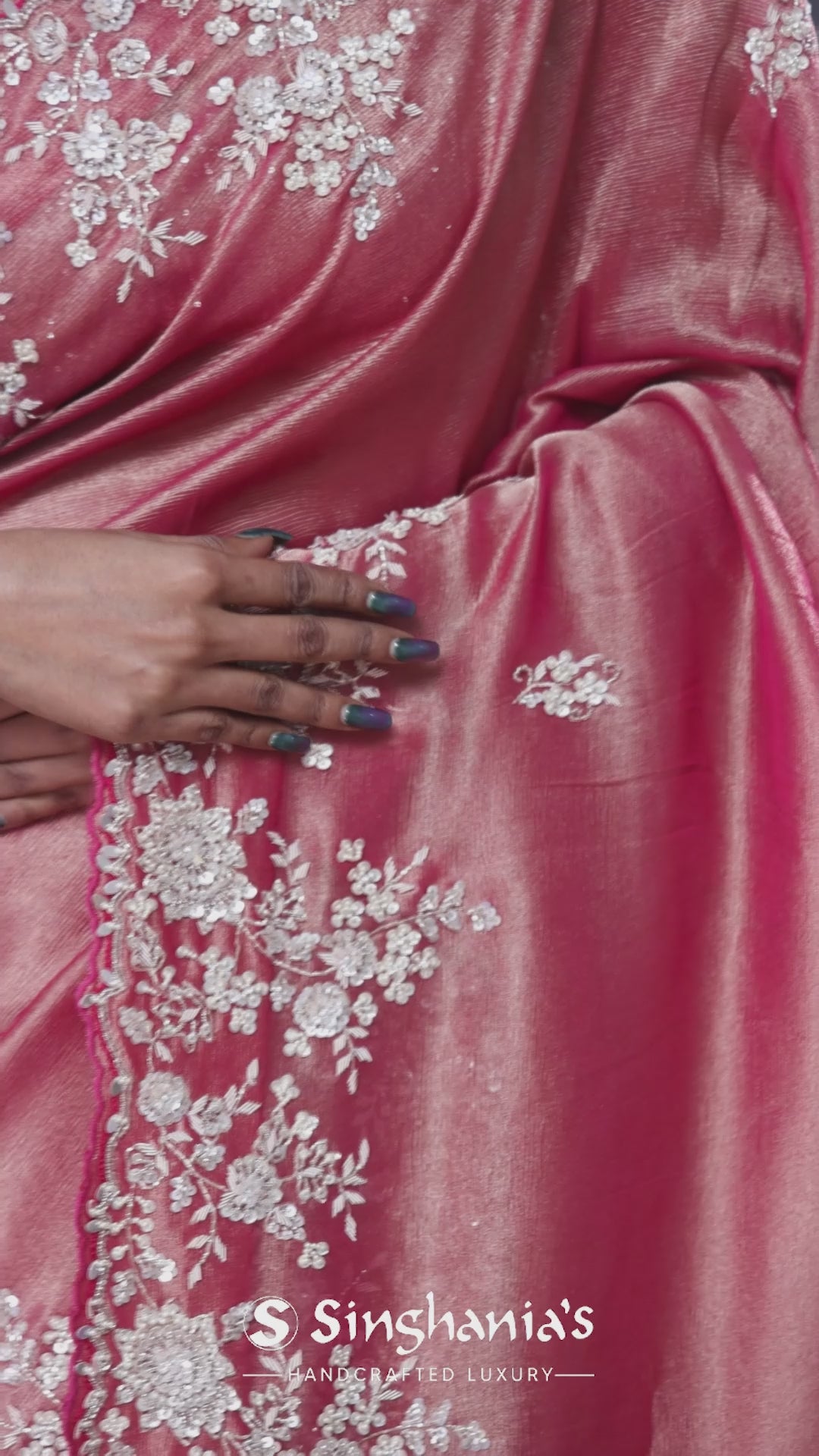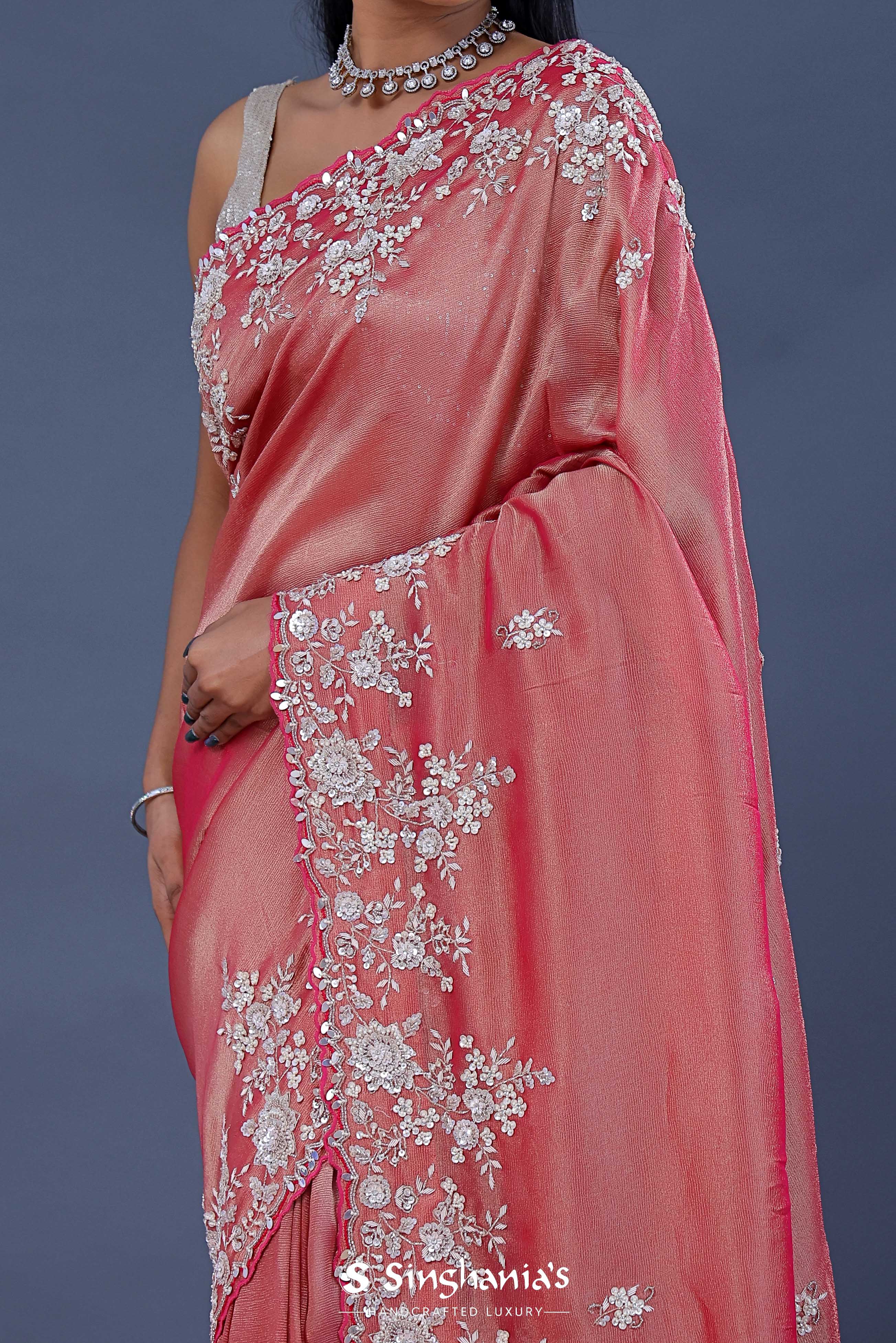 This sequins and zardosi work is forming a floral design on Thulian pink crushed tissue saree at scallop border with floral butti's scattered on the body of entire saree is a ideal choice for any occasion by making you look classy