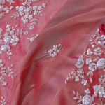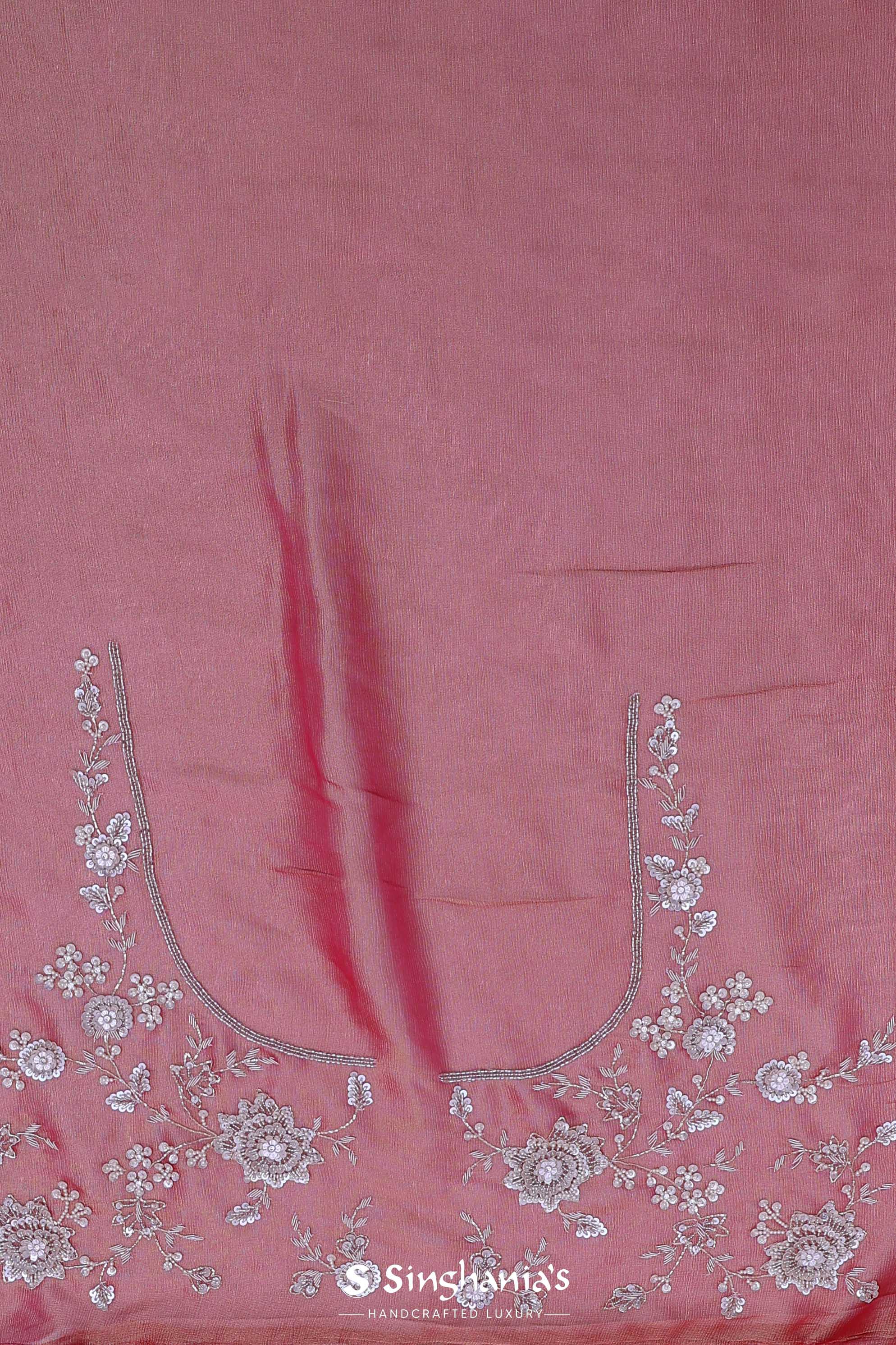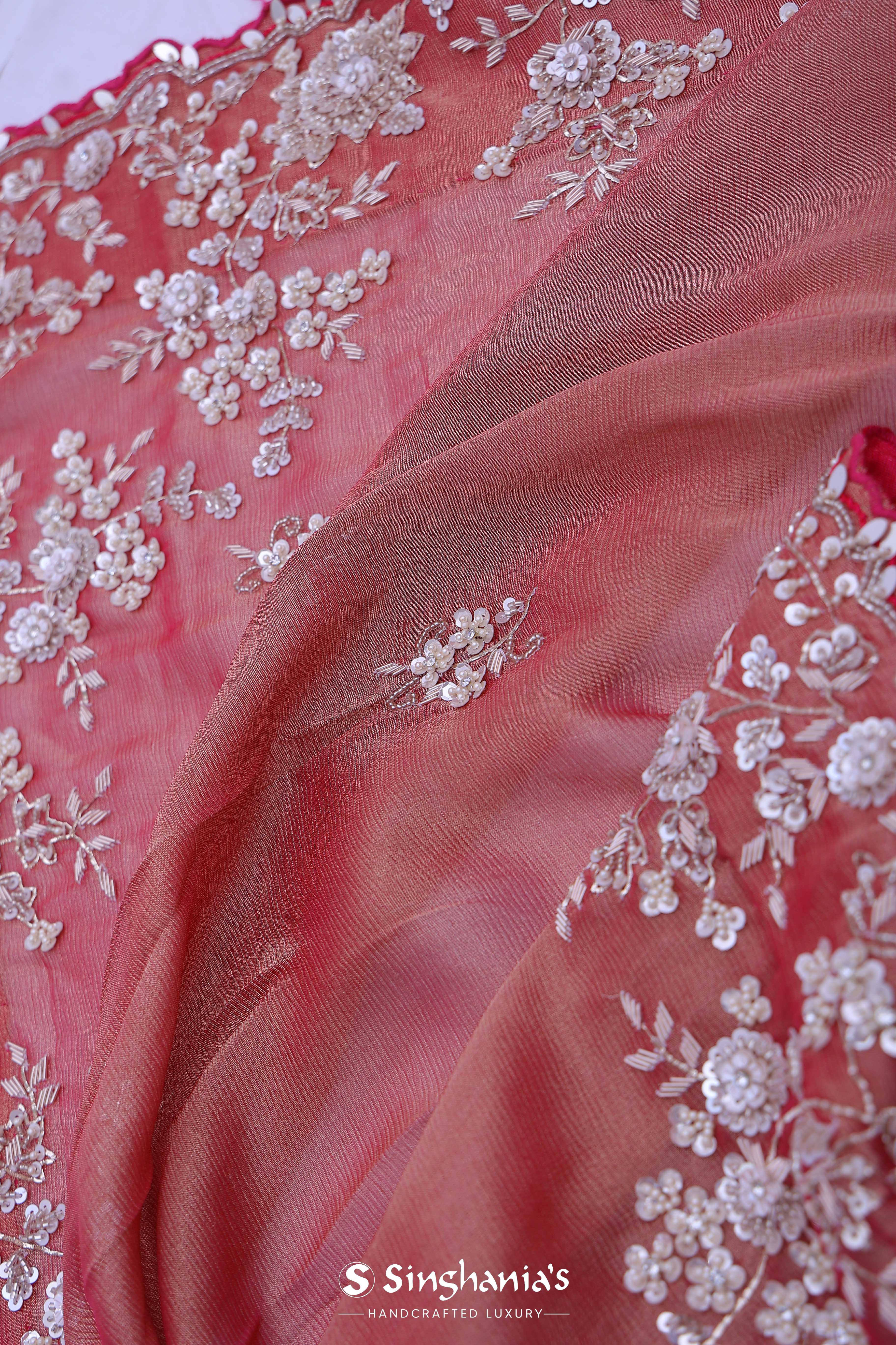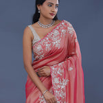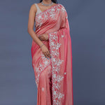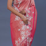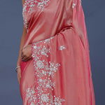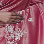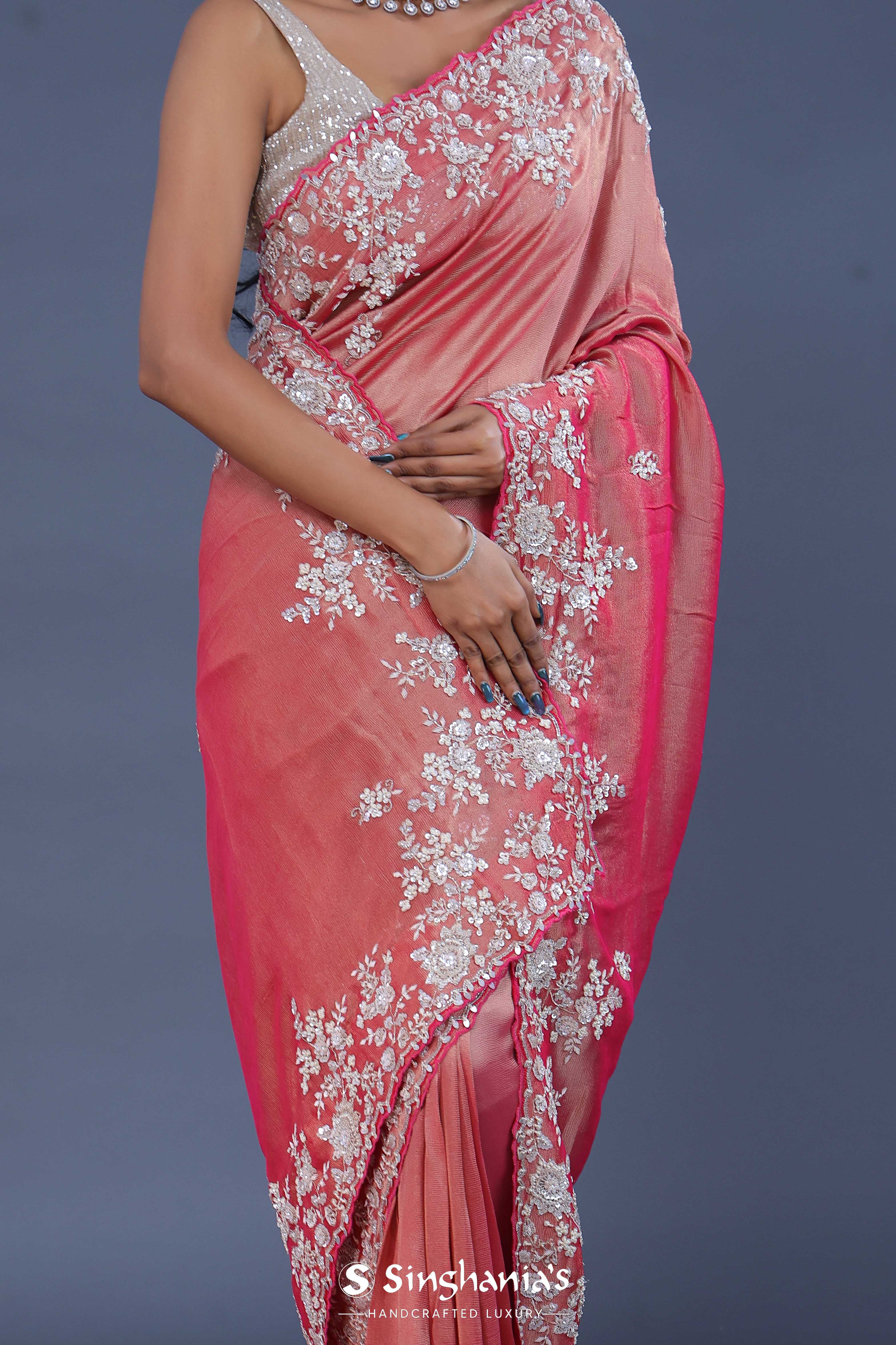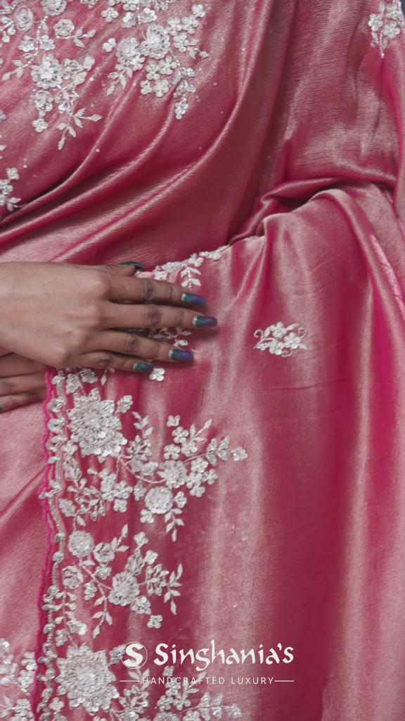 This sequins and zardosi work is forming a floral design on Thulian pink crushed tissue saree at scallop border with floral butti's scattered on the body of entire saree is a ideal choice for any occasion by making you look classy