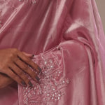 A pastel hued valentine pink saree with a tissue base, which features plain body with no embroidery. Added with floral embroidered scalloped border and pallu, crafted with self-colour pearl, sequins and glass beads. Suitable for festive wear, and wedding parties.