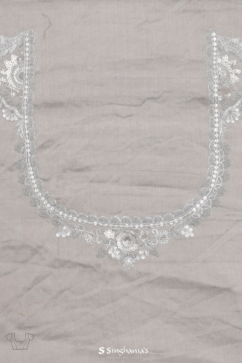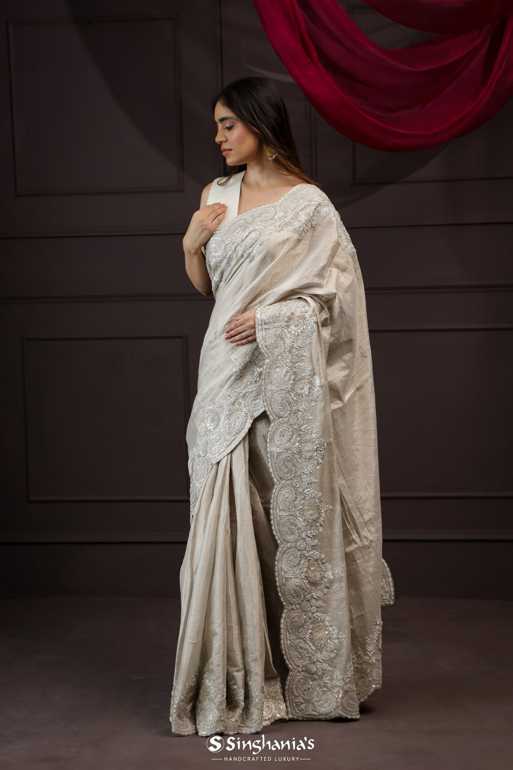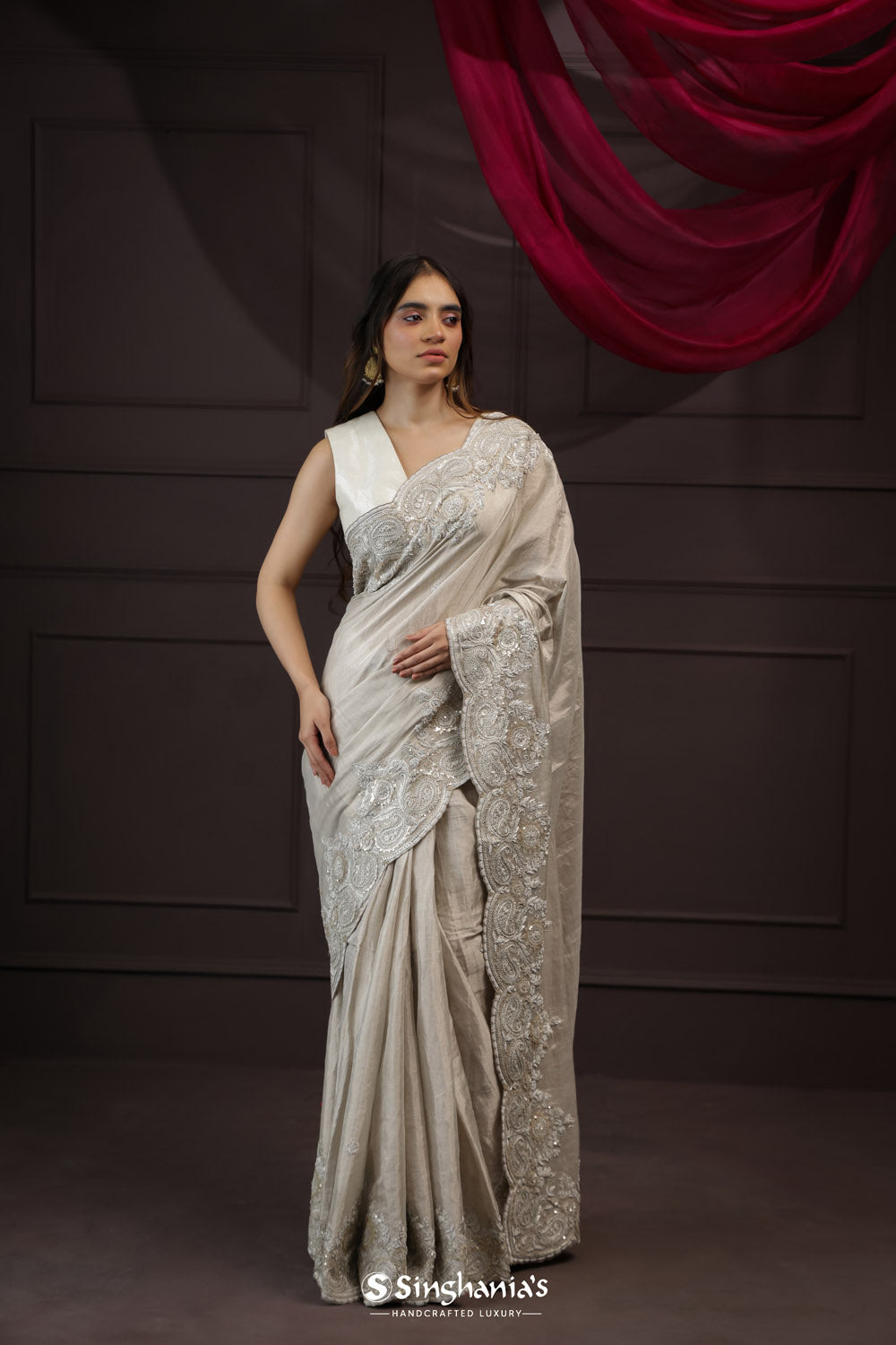 This White Grey Tissue Designer Saree with floral embroidery pattern, in sequins and zari work, is a splendid choice. The small border with colourful floral pattern enhances its charm, making it ideal for festive, or wedding events.