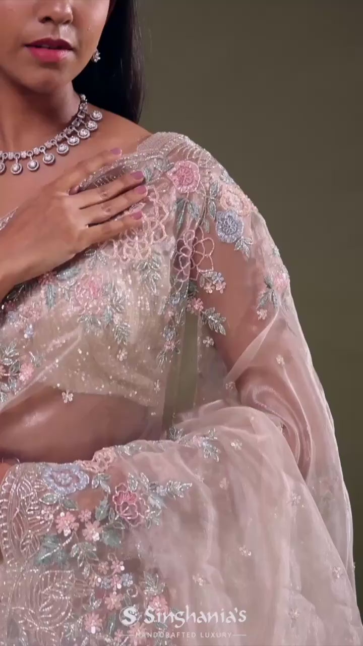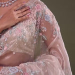 This very beautiful white tissue organza saree has a scalloped border and elaborate embroidery on the body. A delicate shine and beauty are added by the pearl work, kardana, and sequins that embellish the border.