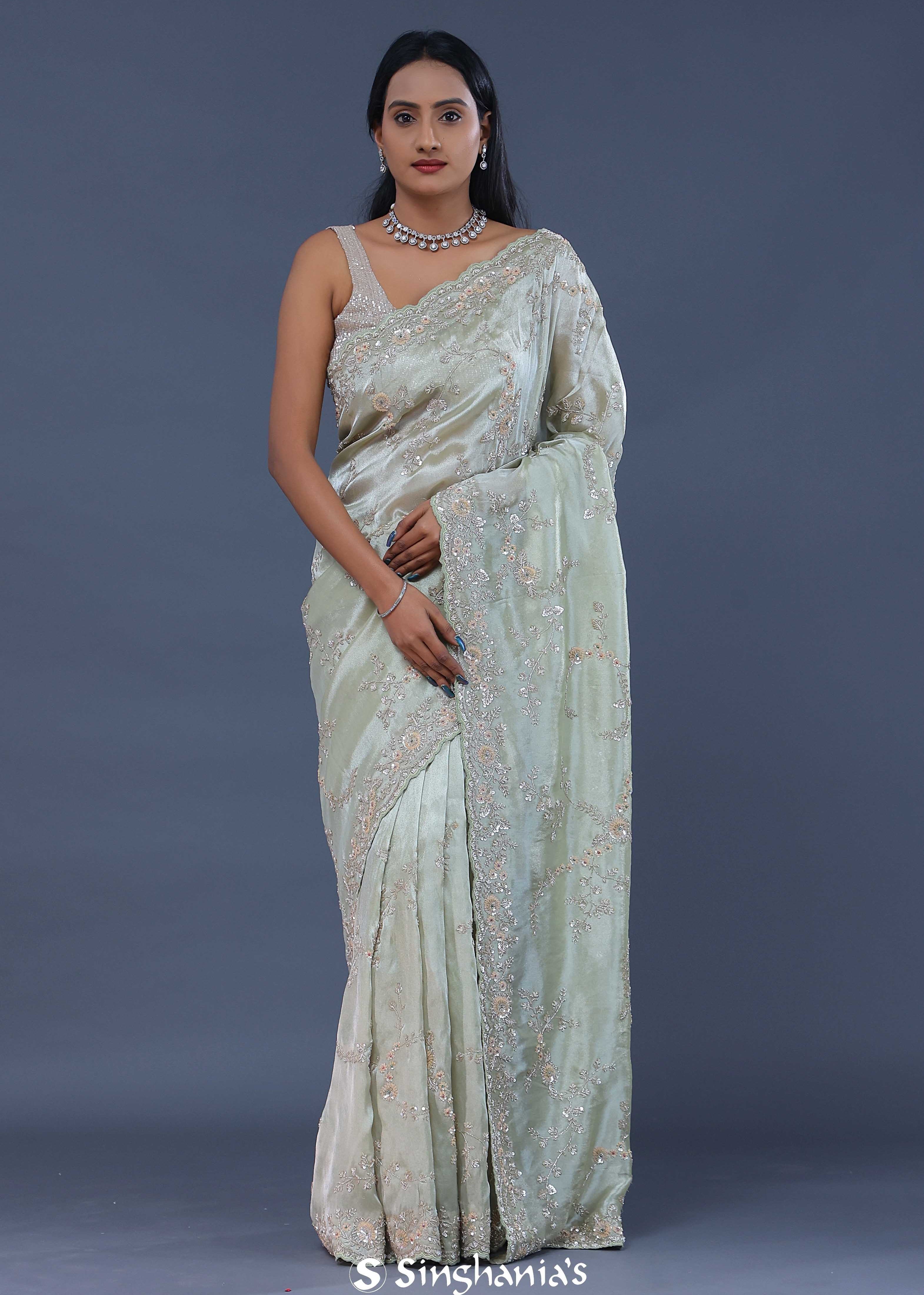 Pale Pista Green Tissue Saree With Embroidery Work