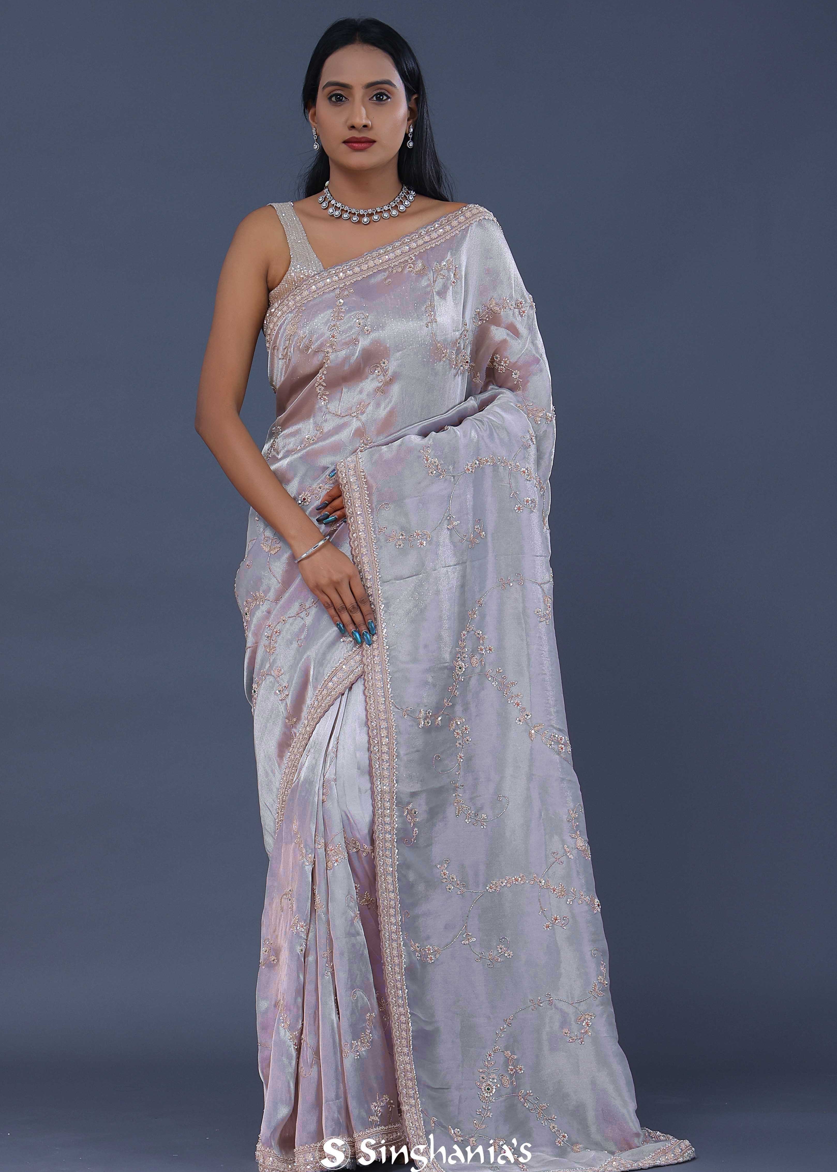 Blueish Silver Tissue Saree With Scallop Border