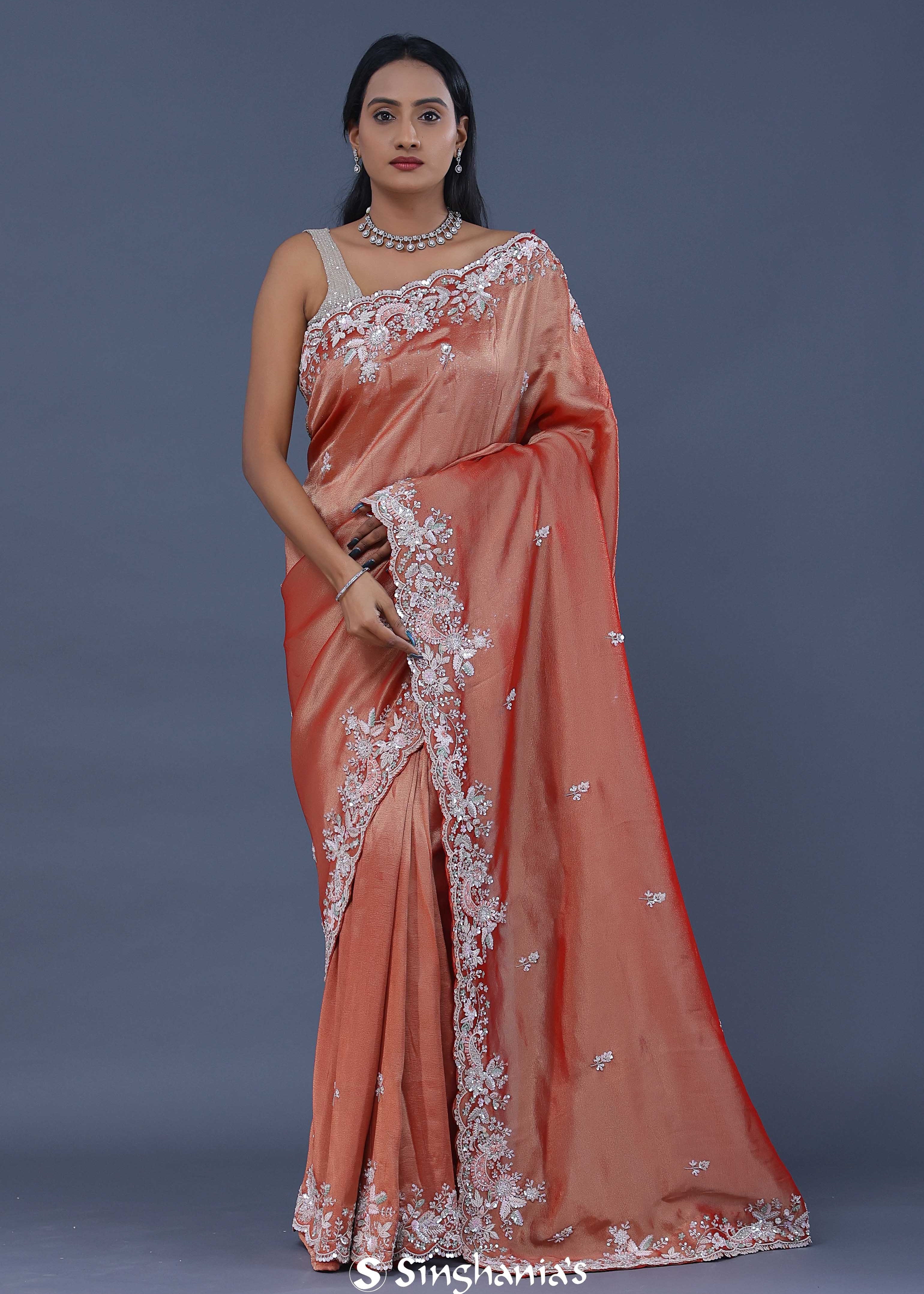 Dark Peach Tissue Embroidery Saree