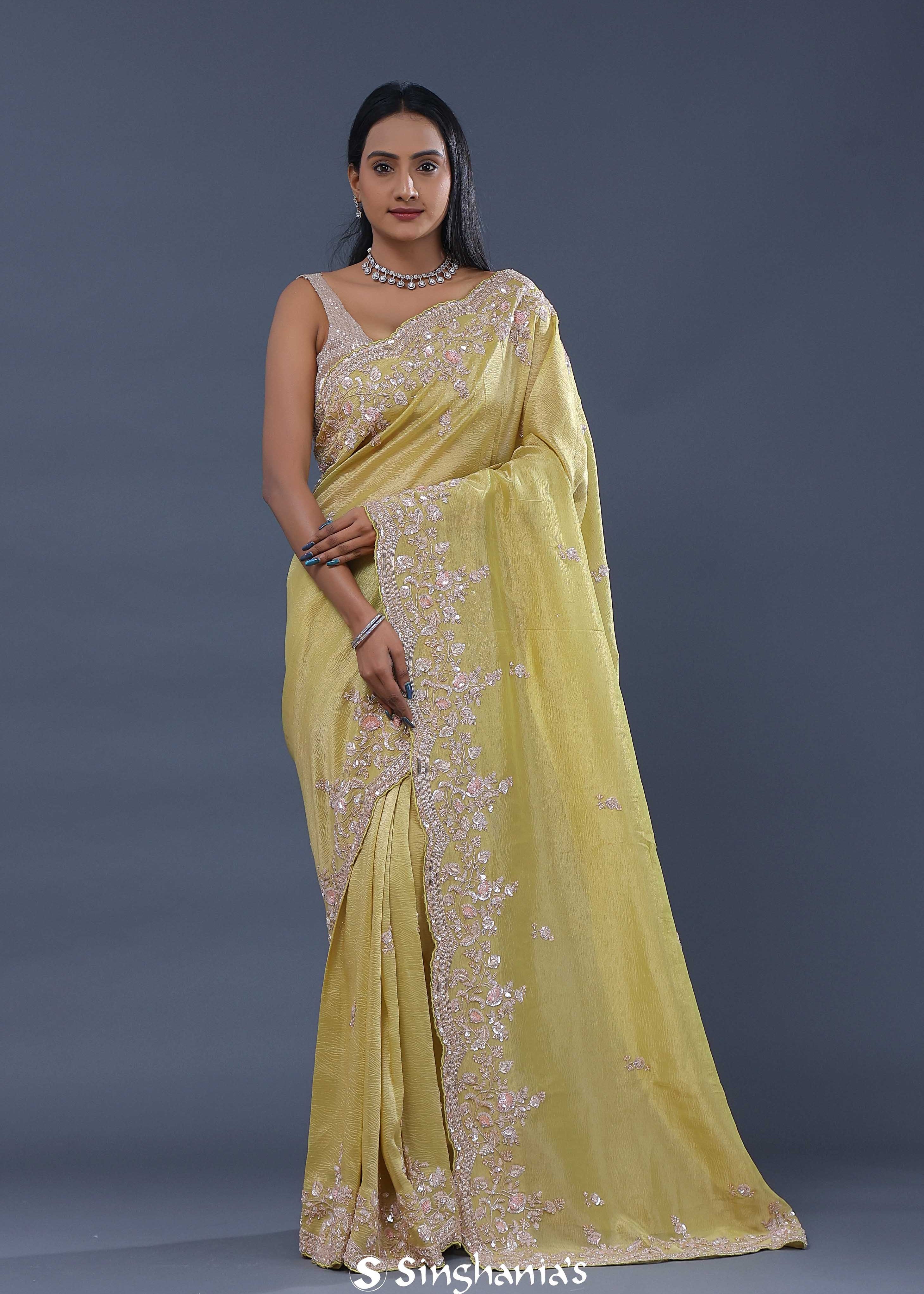 Light Lime Green Crushed Tissue Saree With Scallop Border