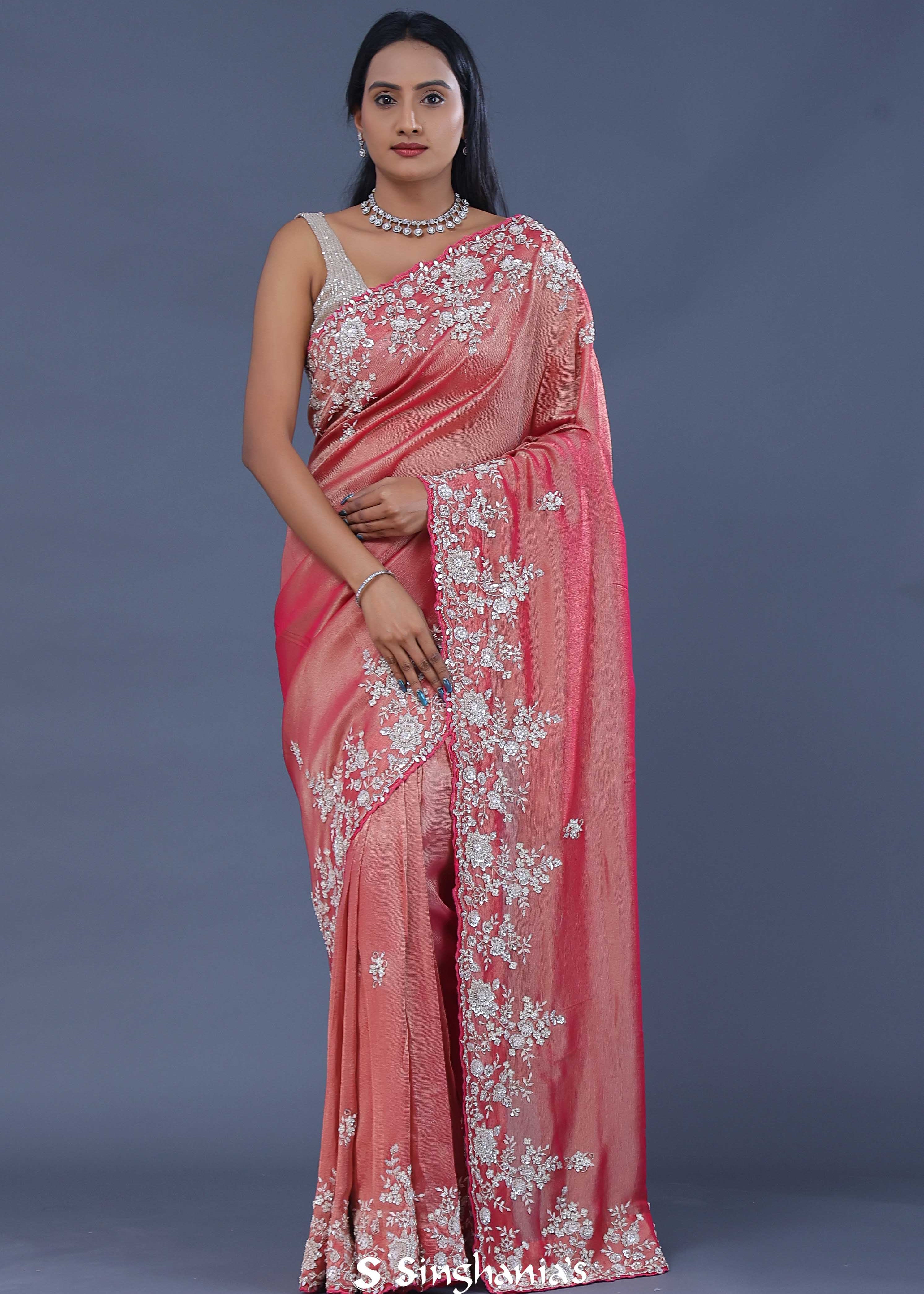 Peachy Pink Embroidery Saree With Scallop Border