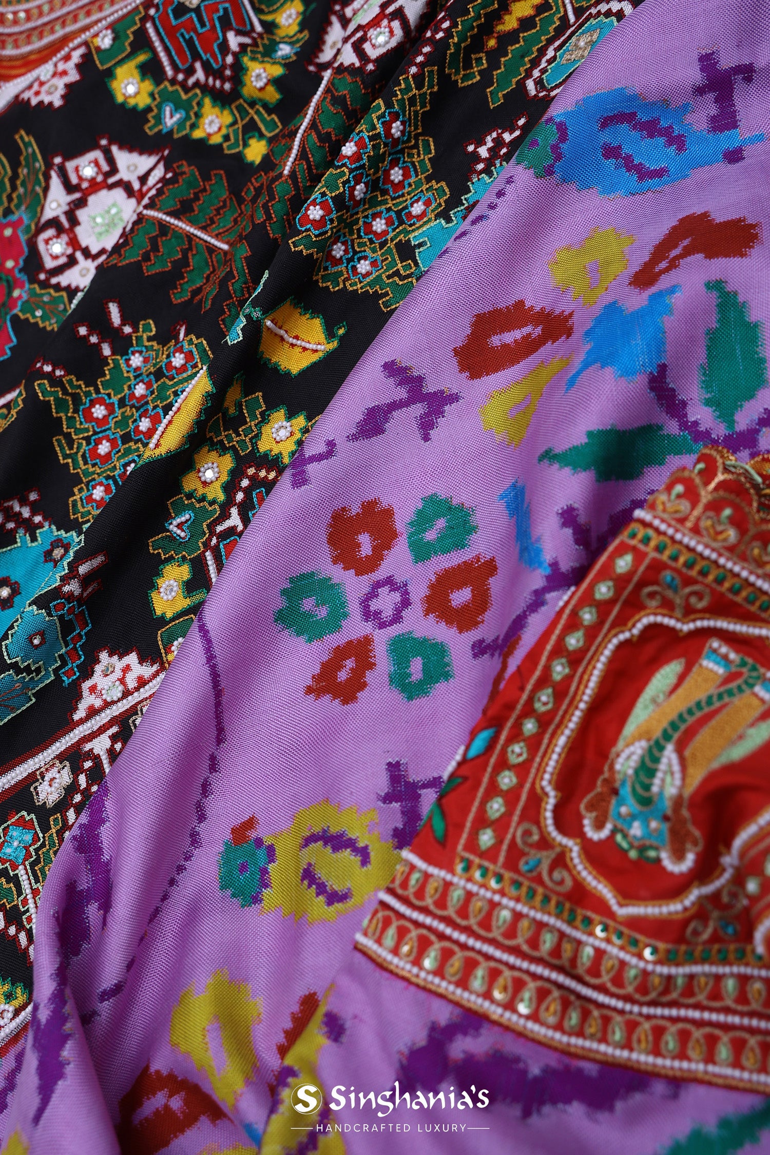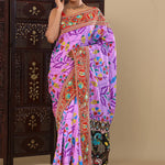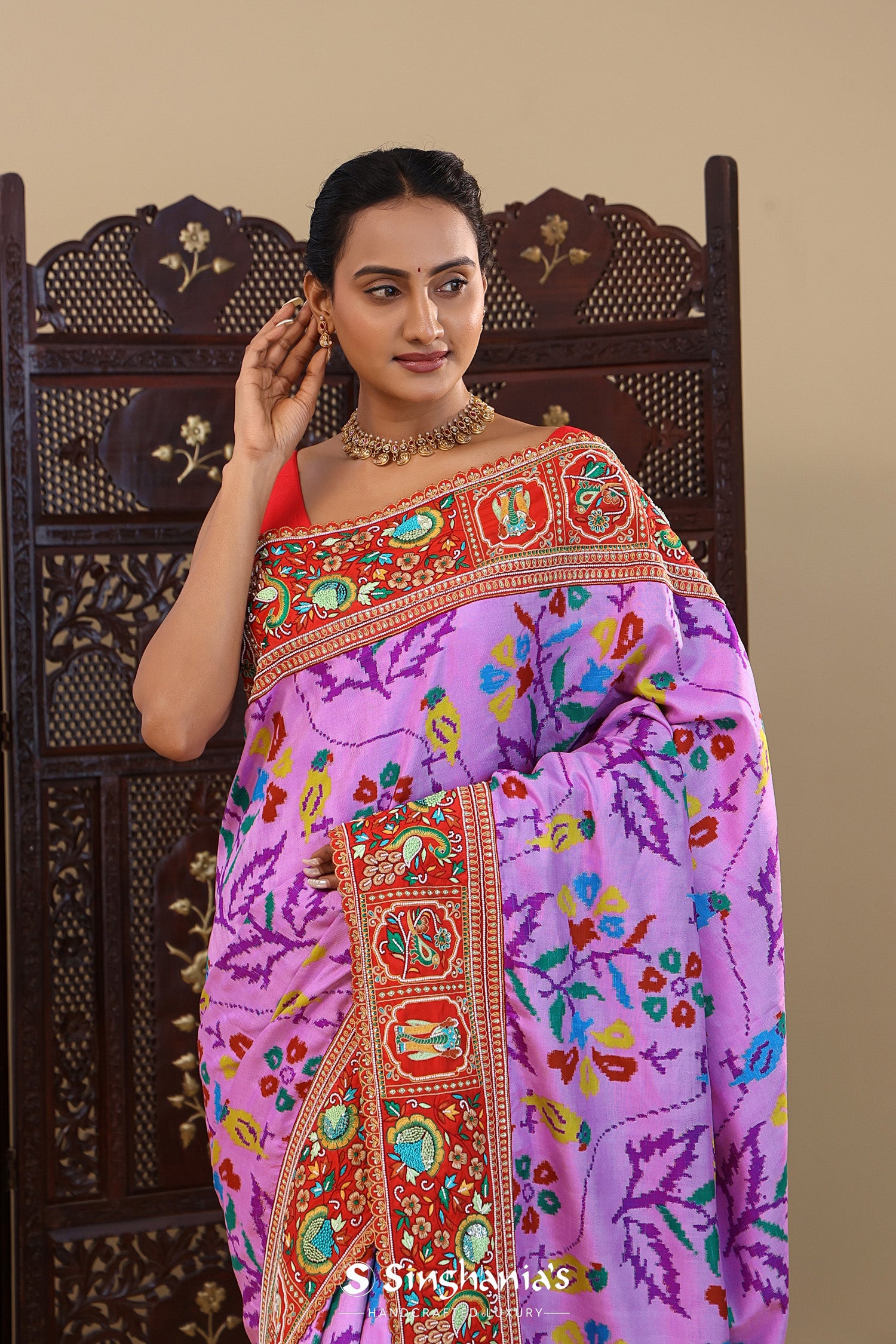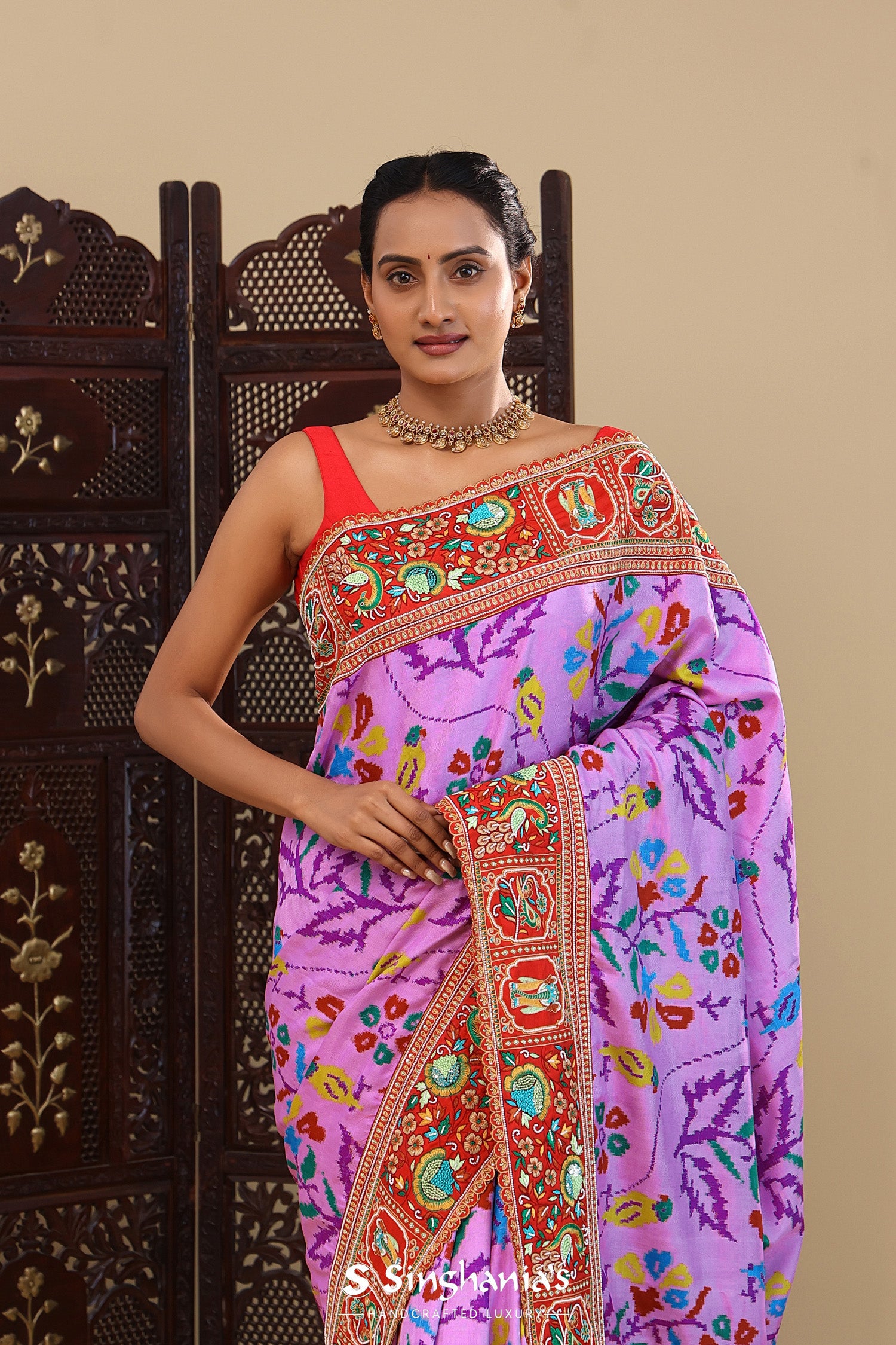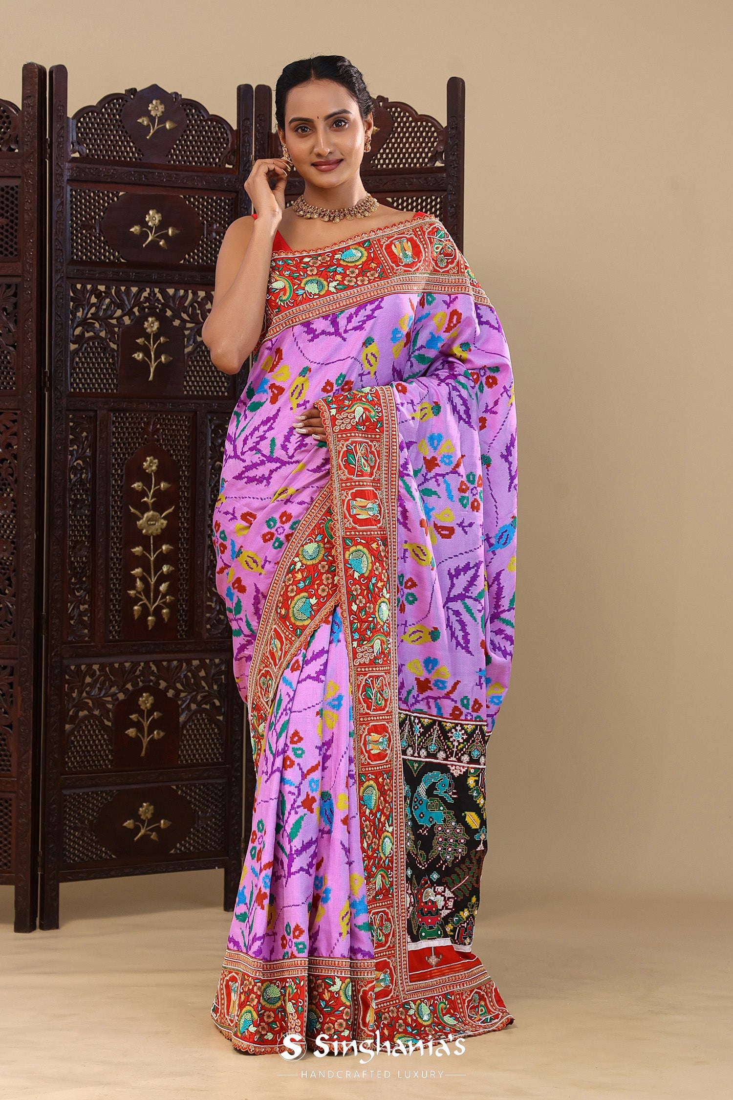 Dark lilac patola silk saree features avian design woven with light color complemented with contrast scallop border