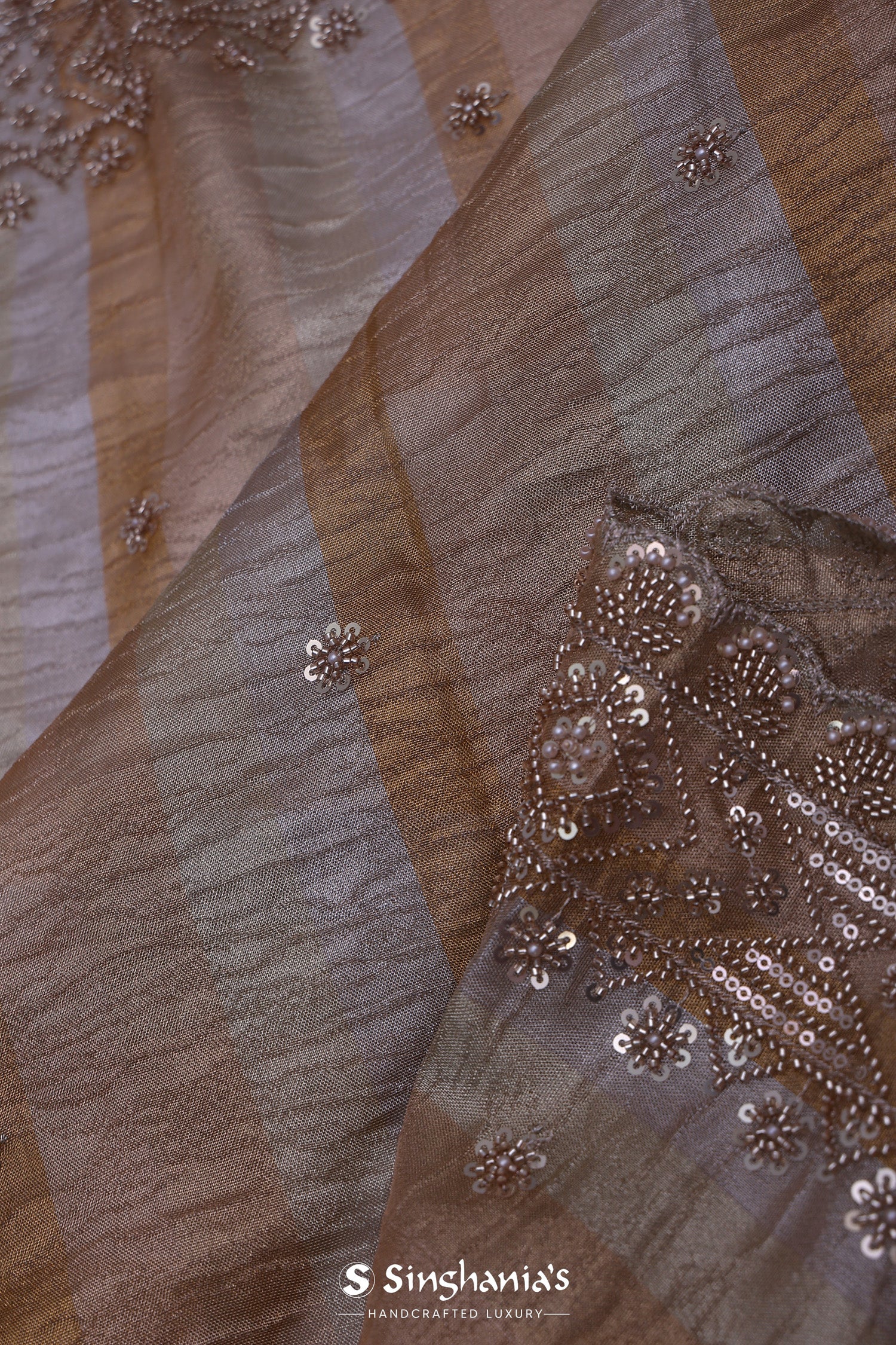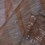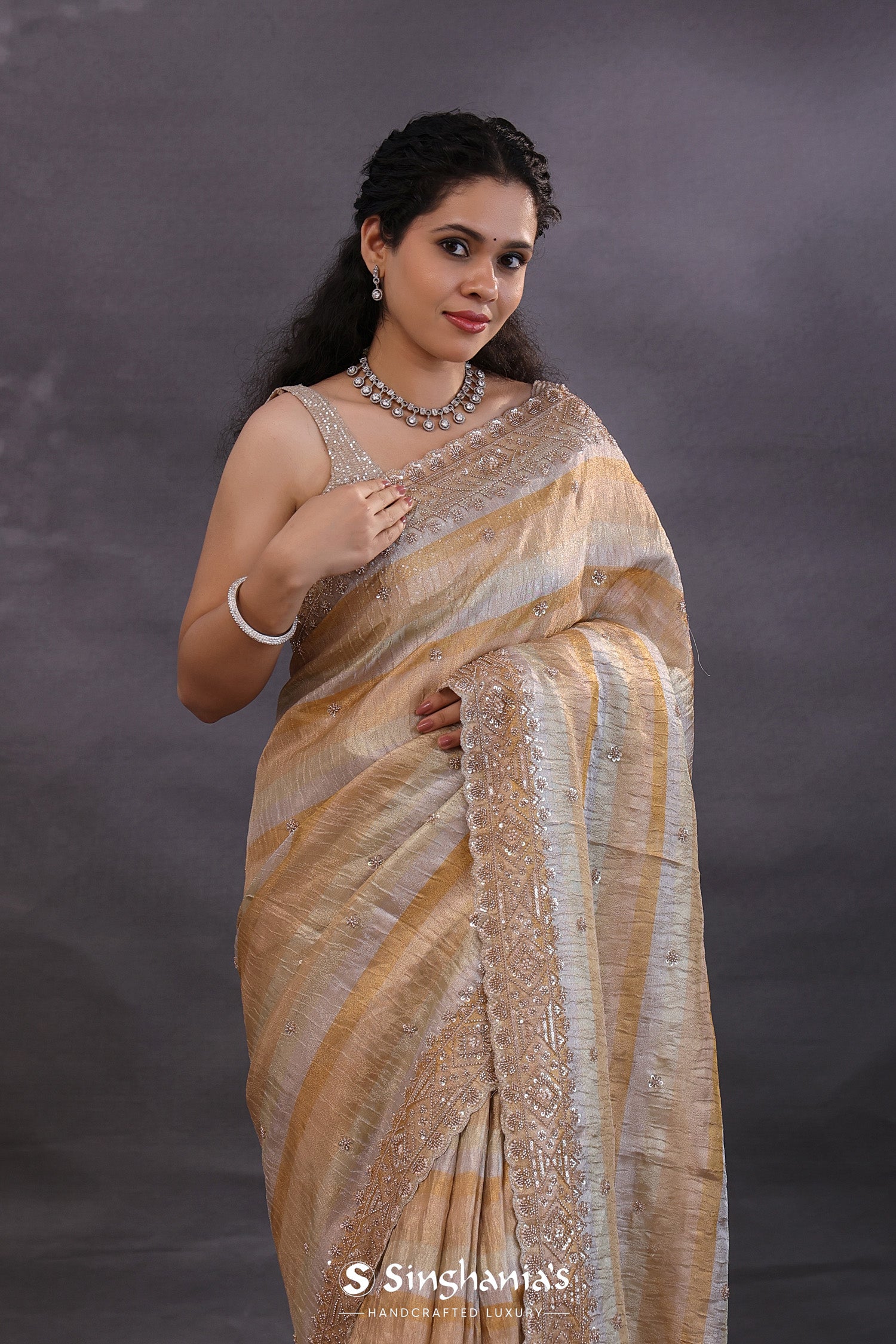 The dual tone fancy tissue saree with floral cutdana embroidery and a scallop border for a decent and classy look with charm.