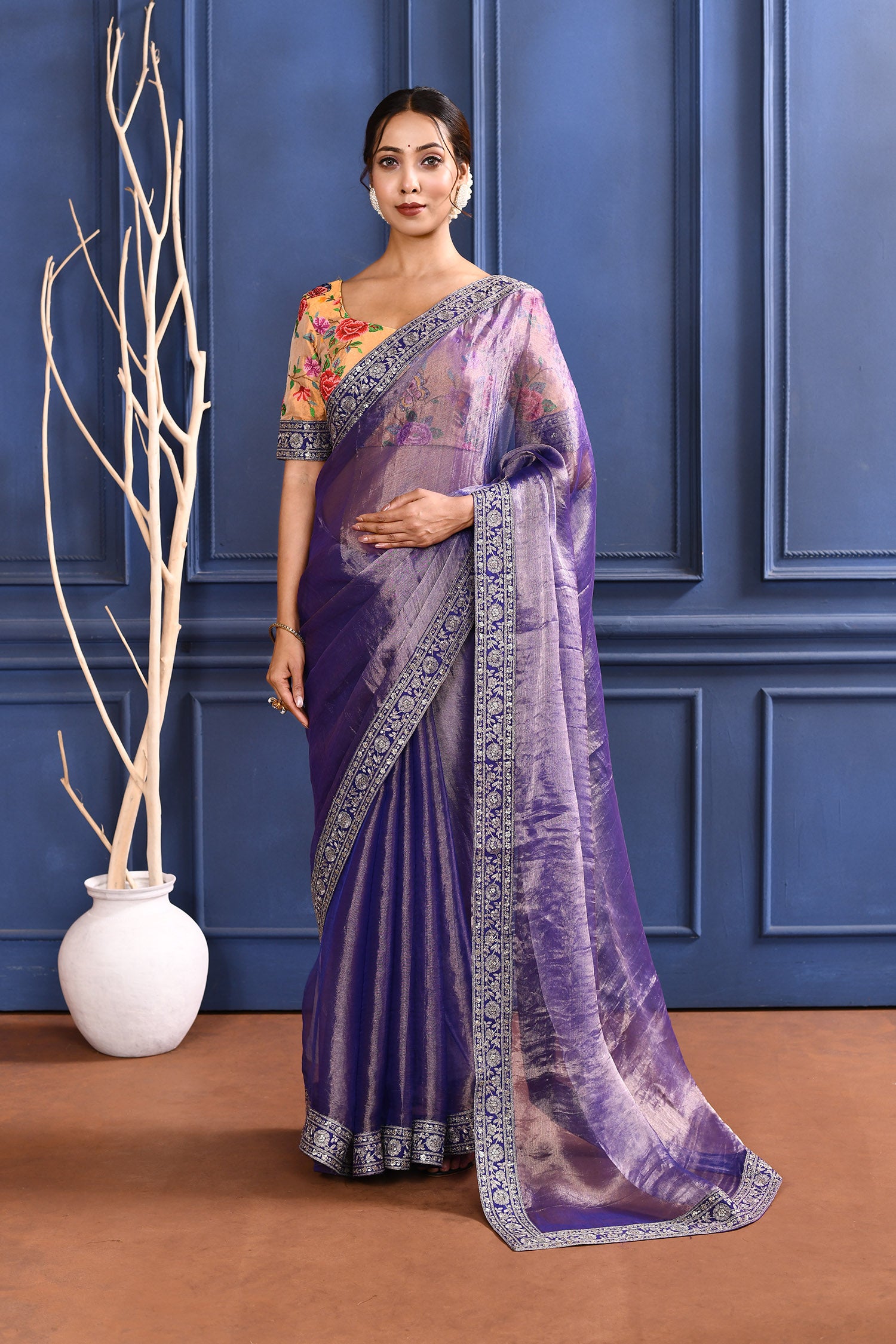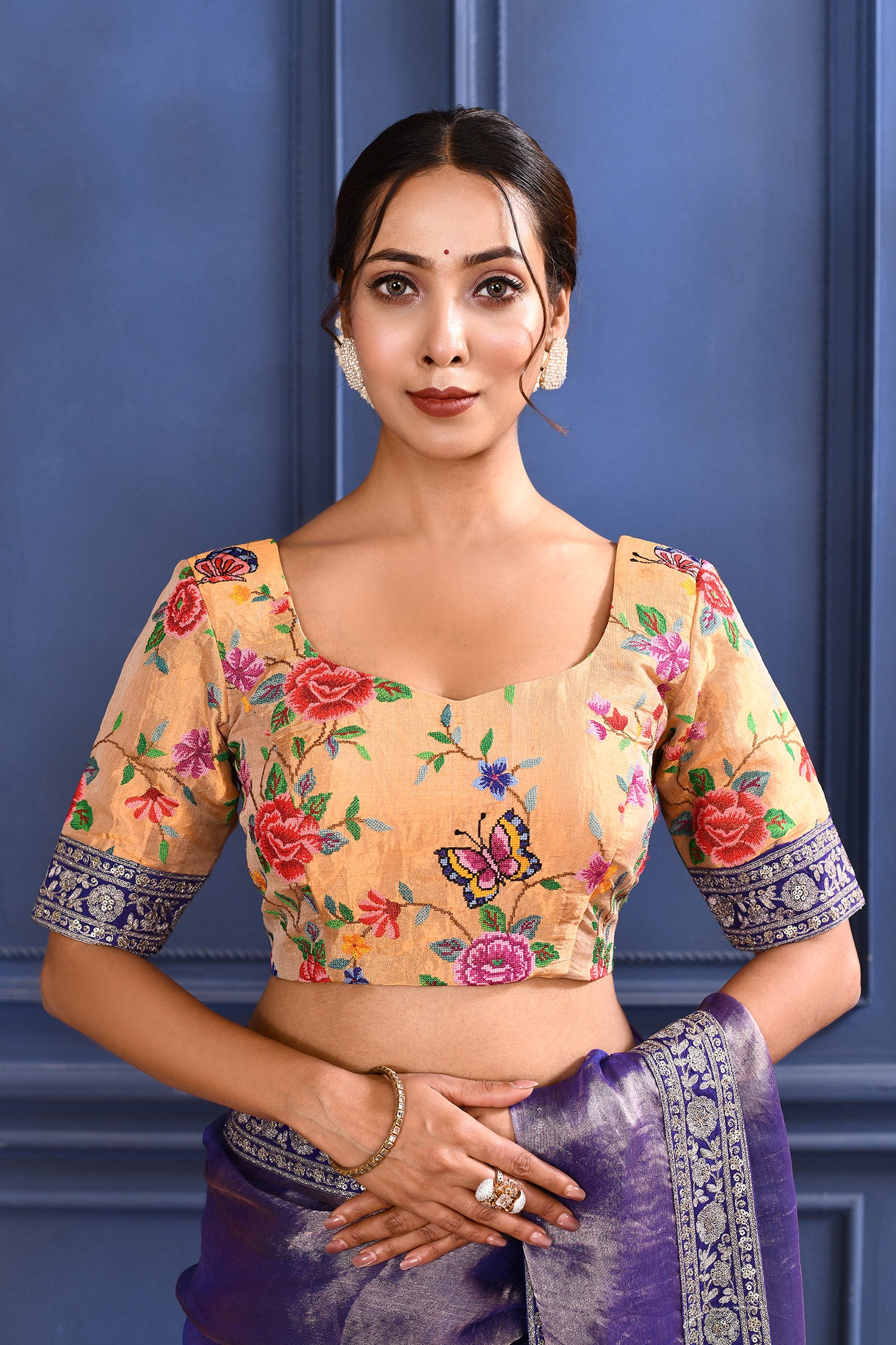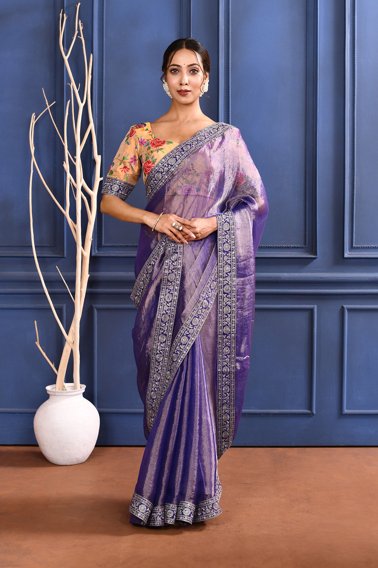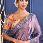 The rich pink tissue saree with stripes and embroidered border along with stitched embroidered beige blouse for a stylish look with traditional elegance.