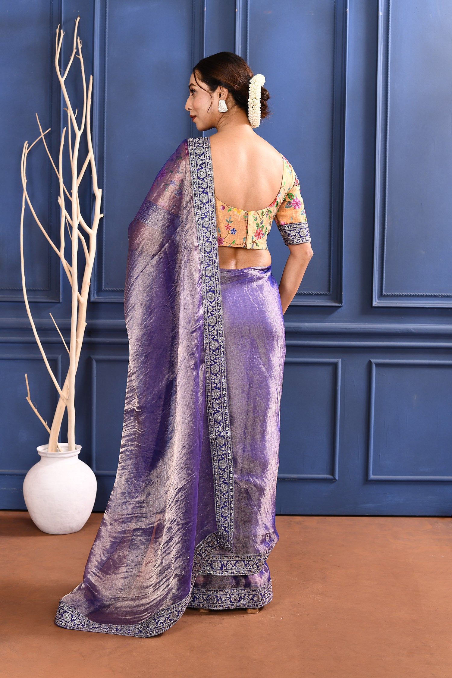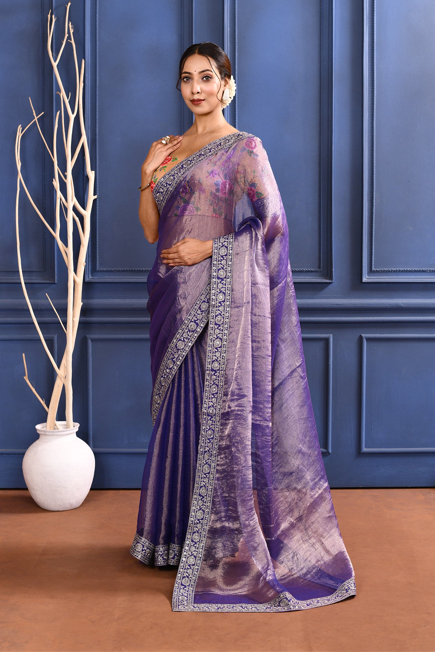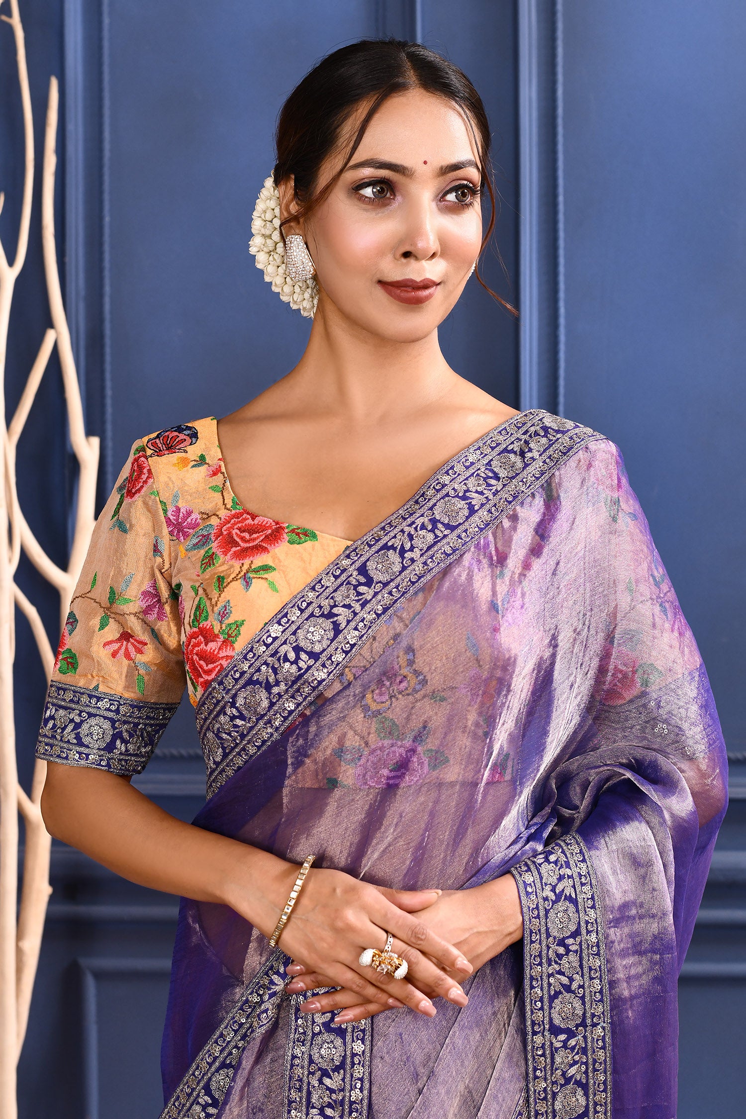The rich pink tissue saree with stripes and embroidered border along with stitched embroidered beige blouse for a stylish look with traditional elegance.