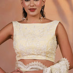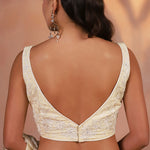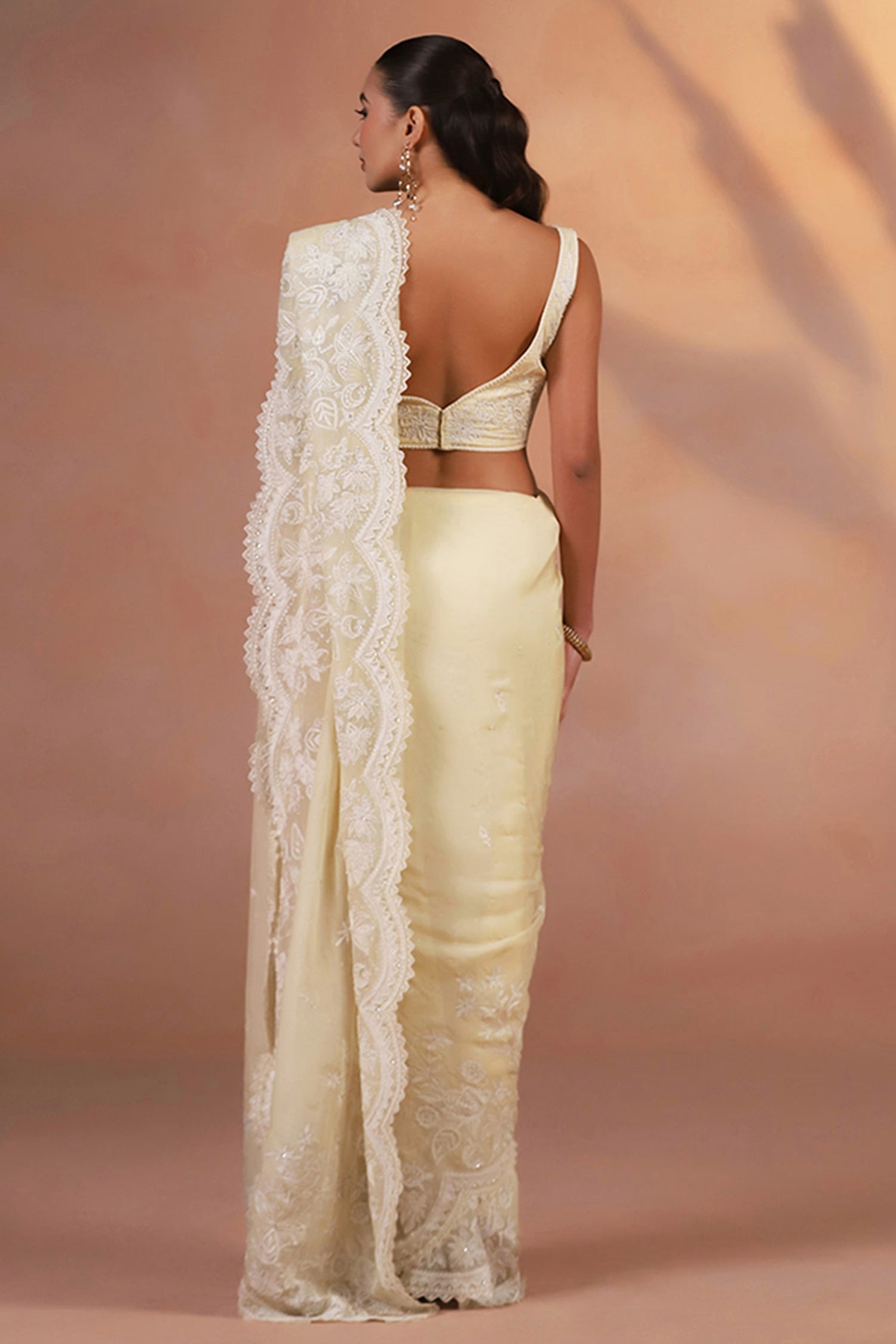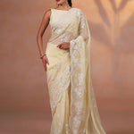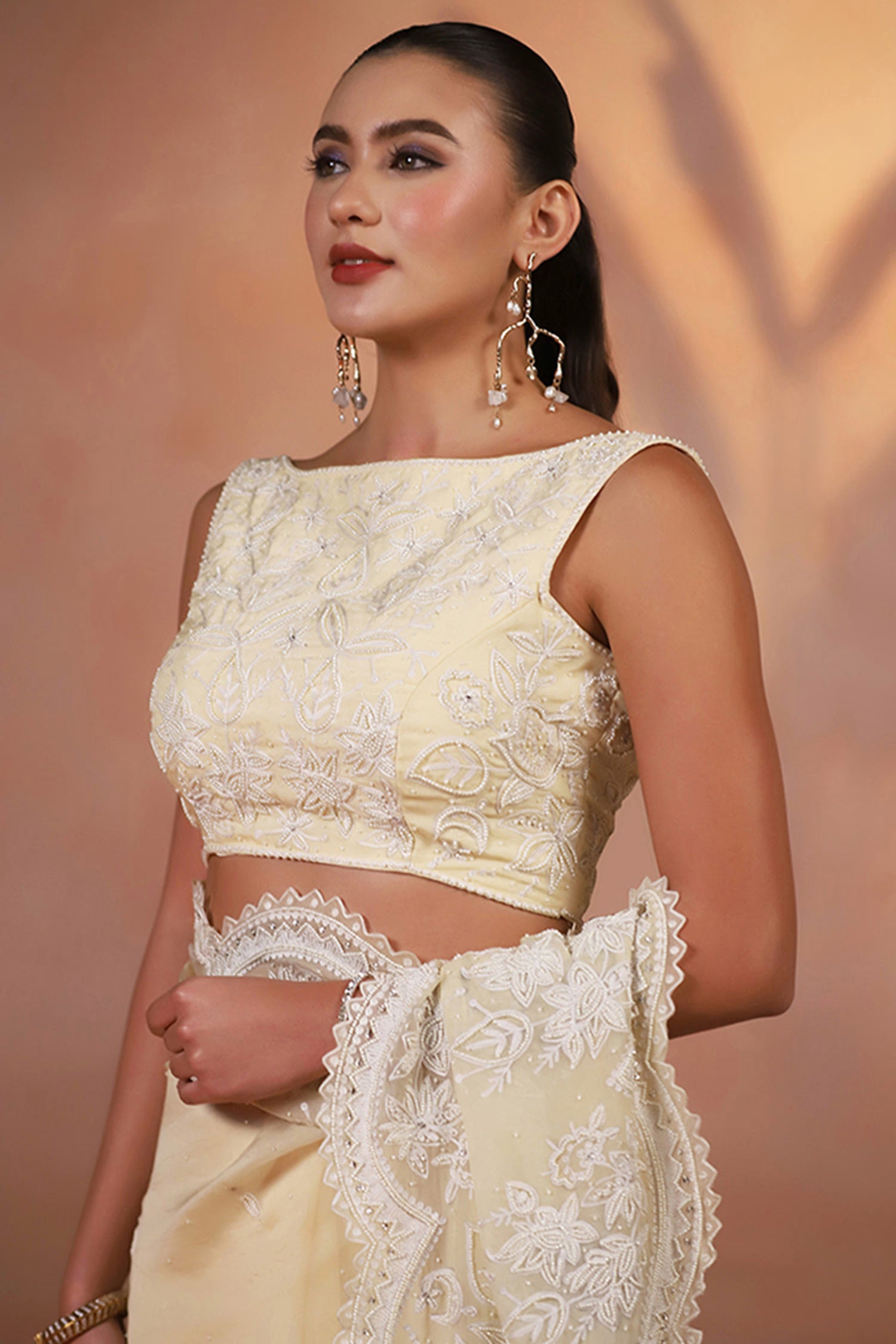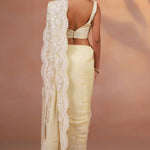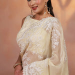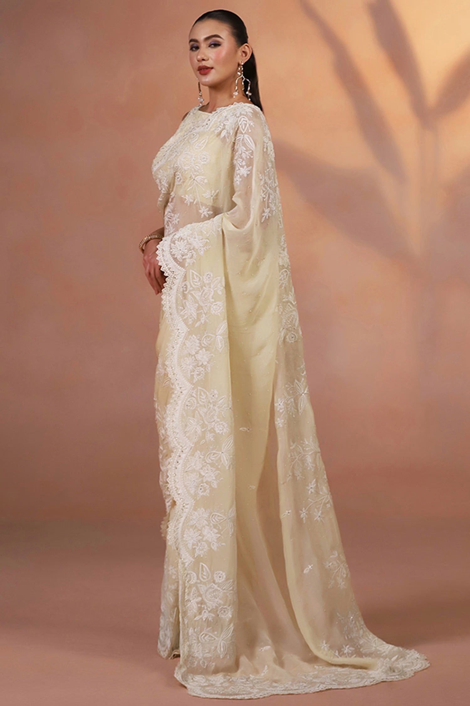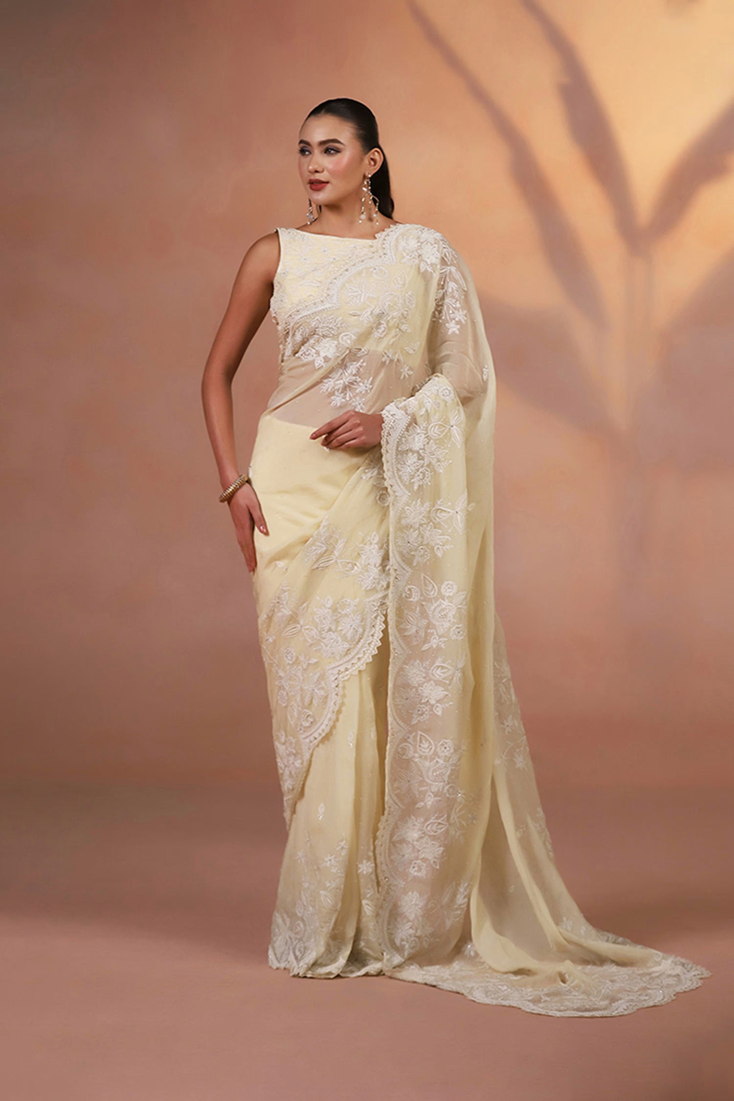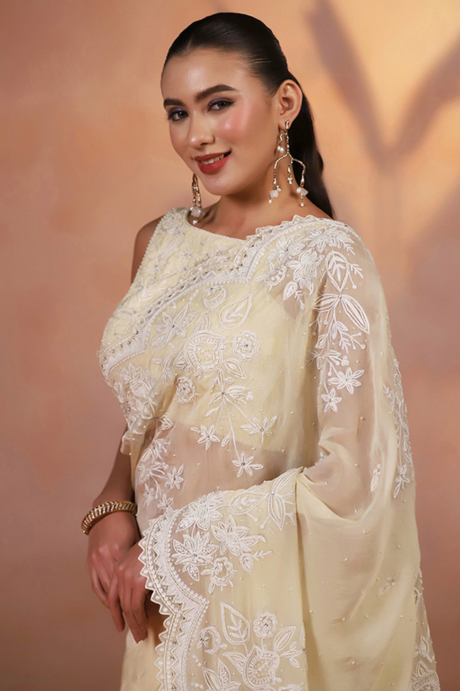 The soft beige thread embroidered saree with scallop border and stitched blouse for a stunning stylish look with graceful touch.