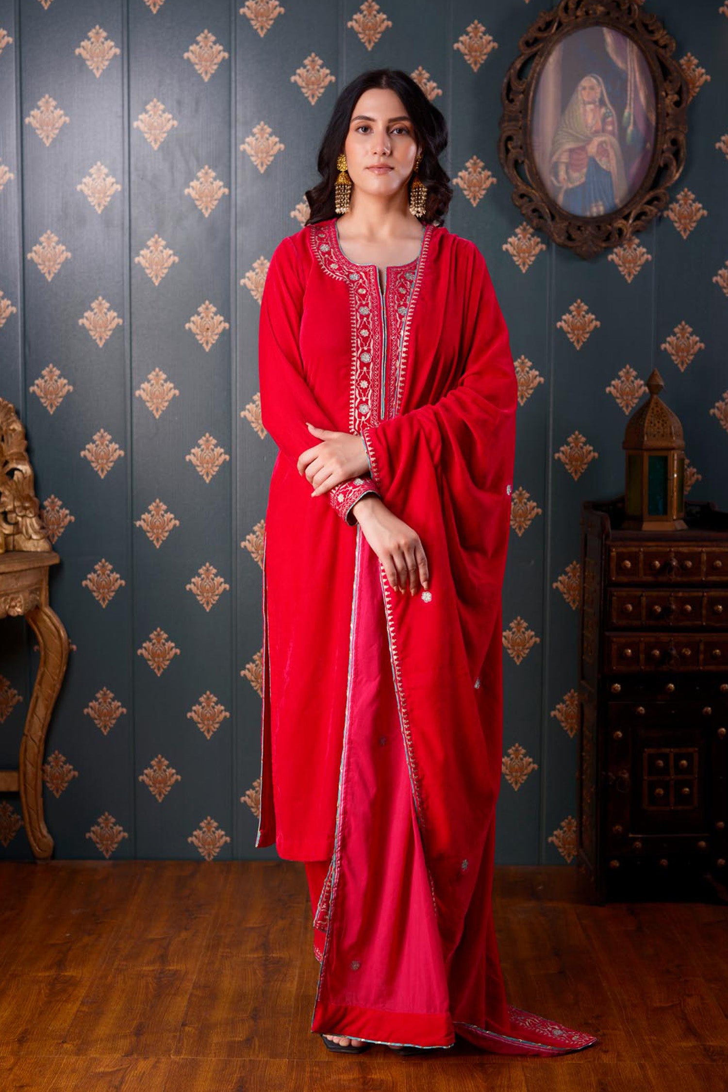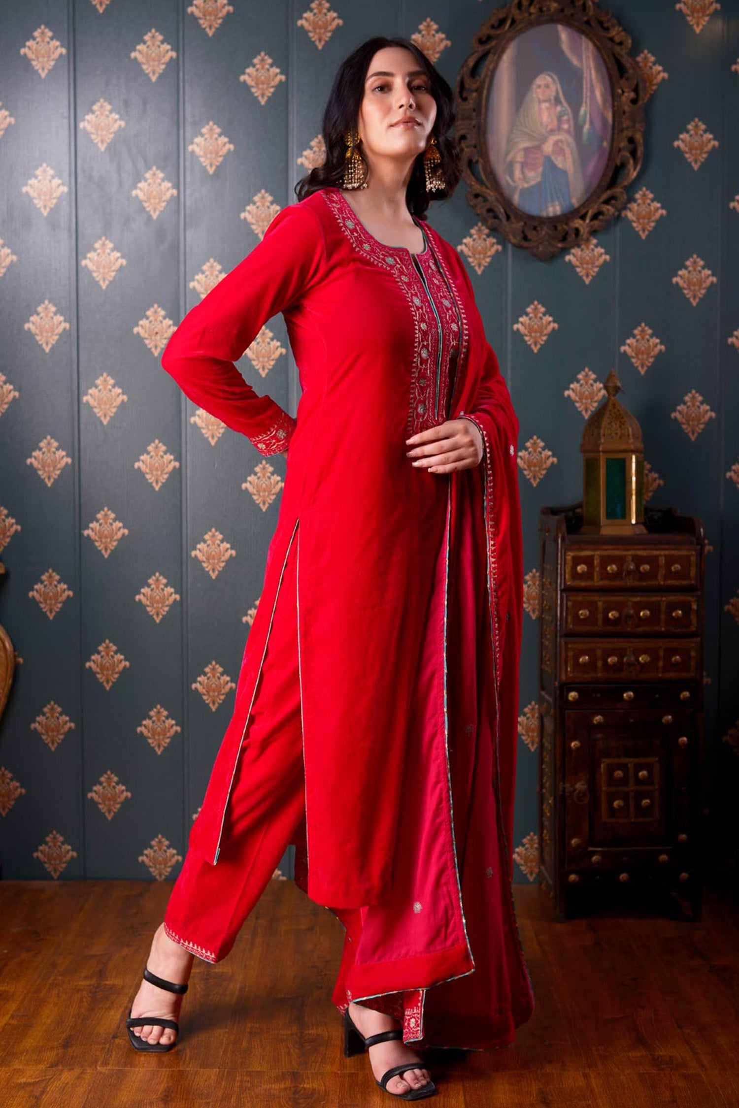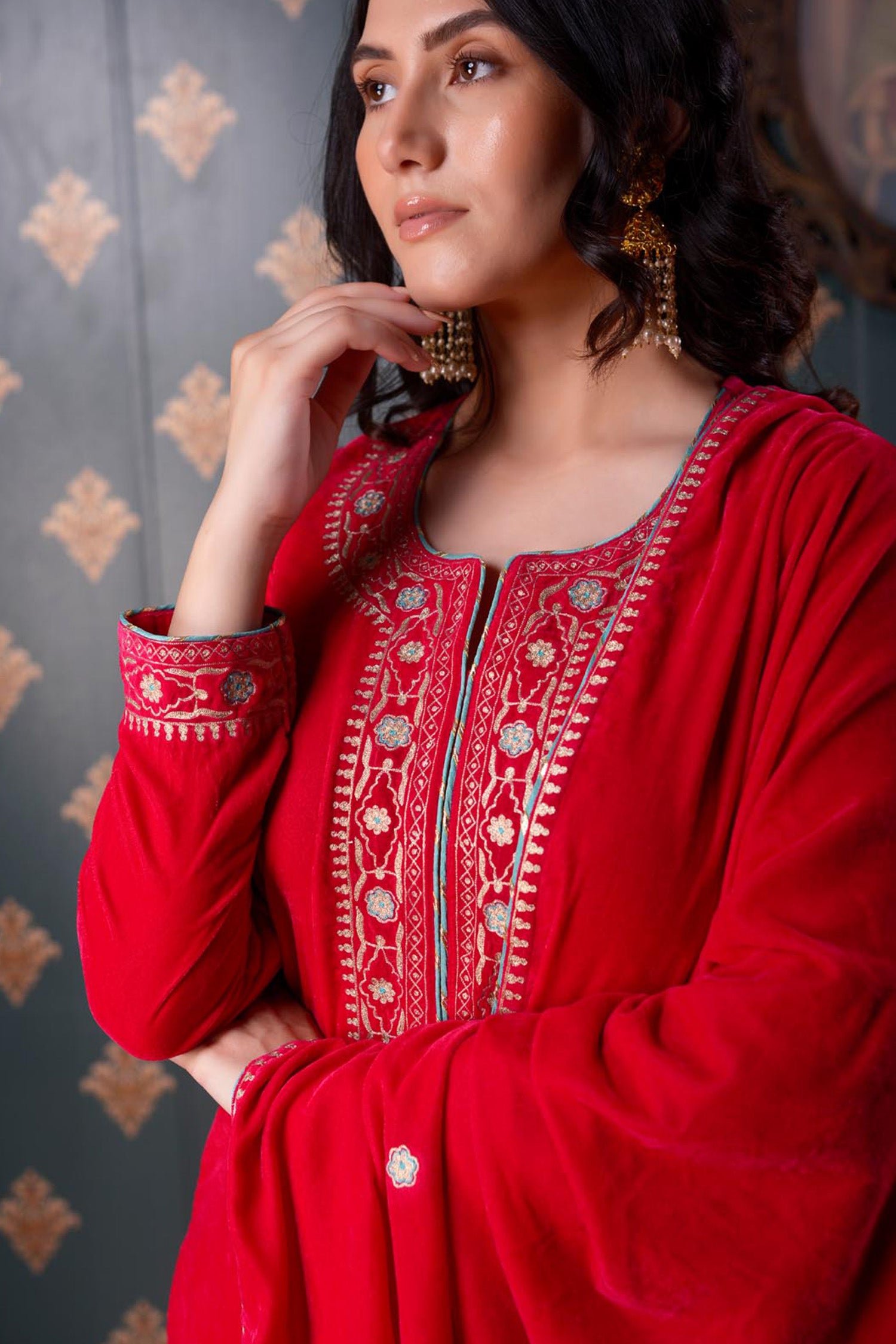 The three piece Velvet set includes Dark Red Embroidered Neck Kurta ,Pant And Dupatta With Lace Finish for a rich and beautiful look with elegance.