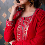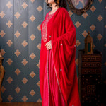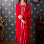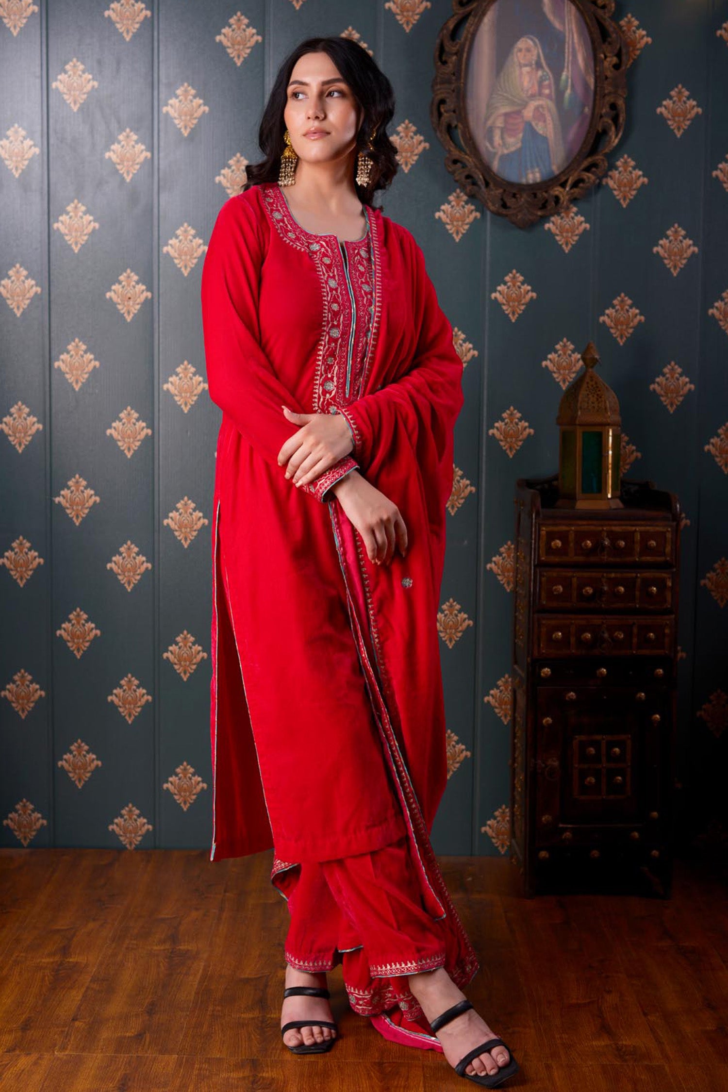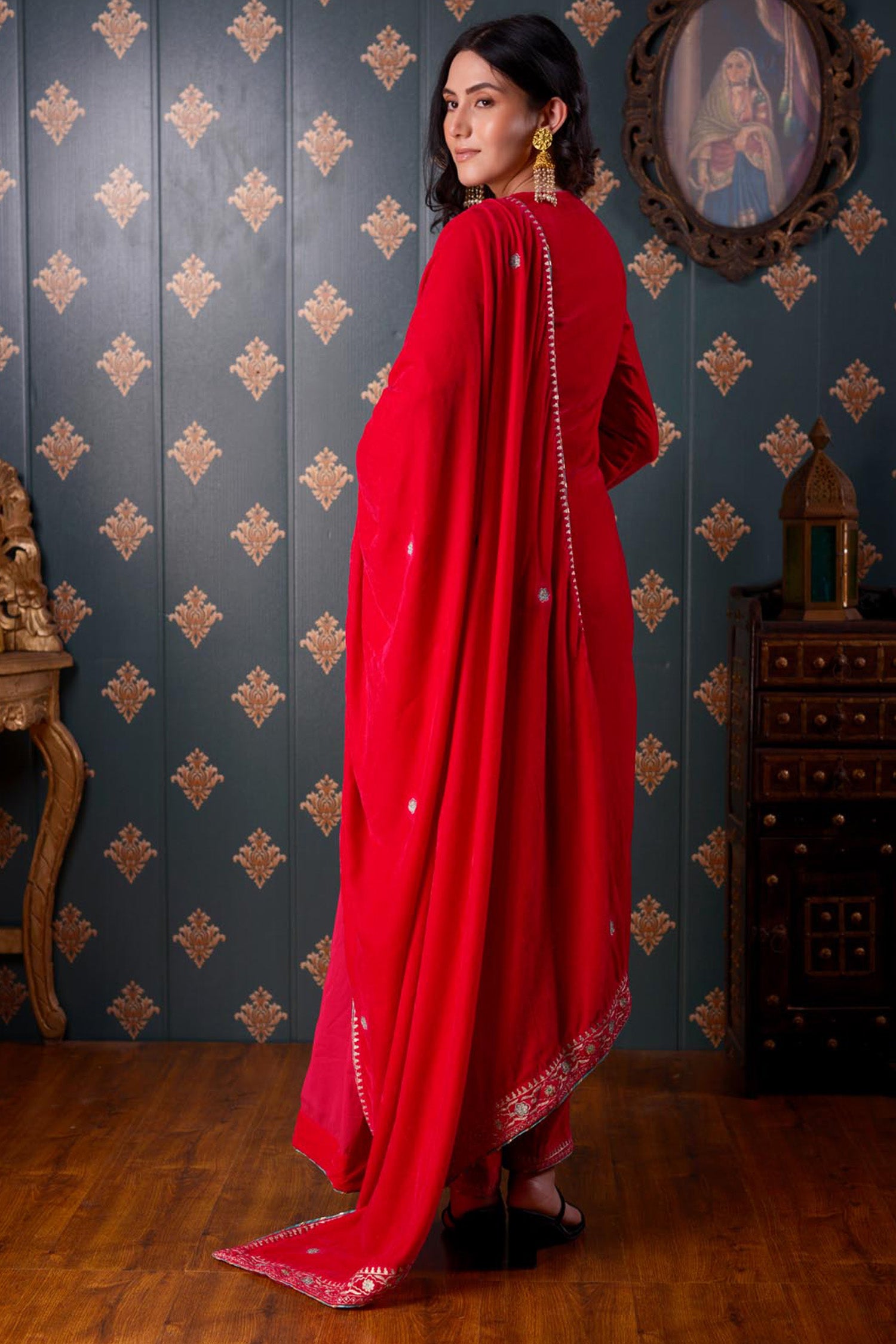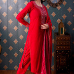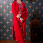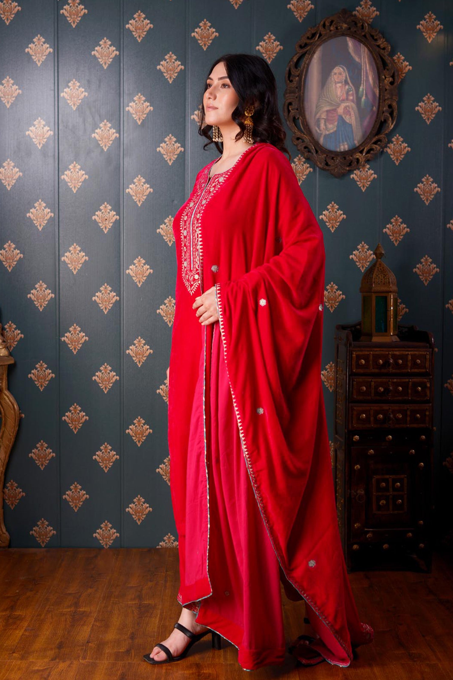 The three piece Velvet set includes Dark Red Embroidered Neck Kurta ,Pant And Dupatta With Lace Finish for a rich and beautiful look with elegance.
