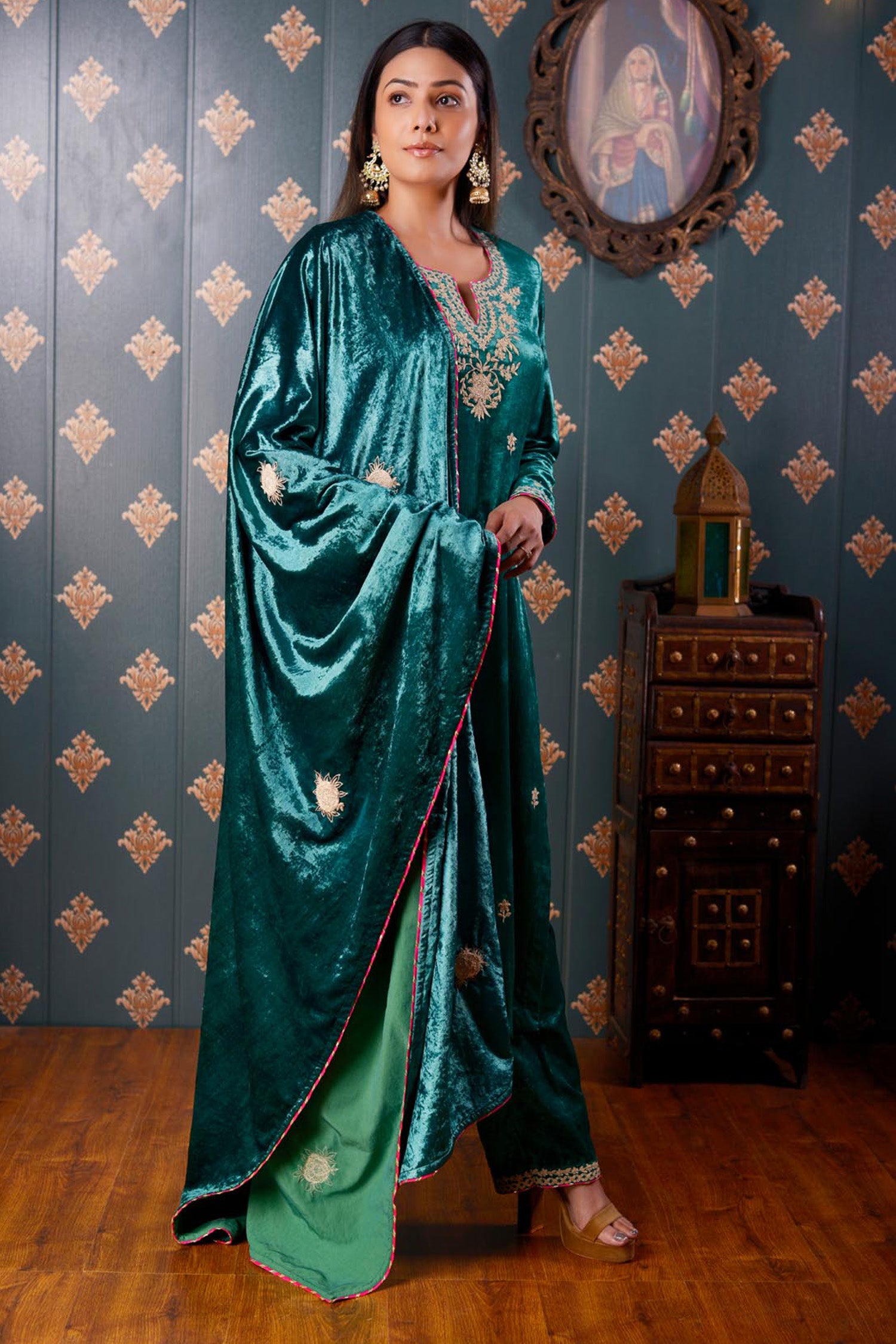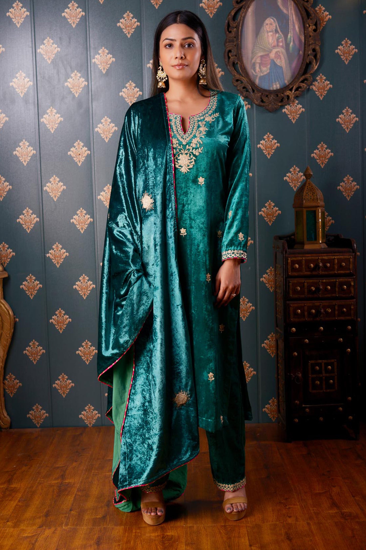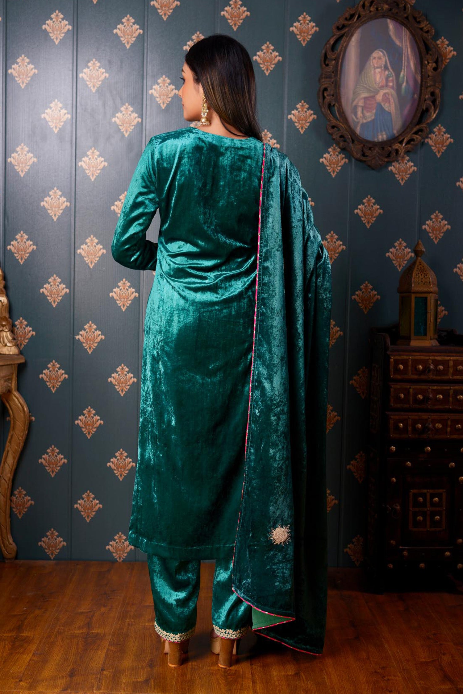 The three piece Velvet set includes Emerald Green Embroidered Neck Kurta ,Pant And Dupatta With Lace Finish for a rich and beautiful look with elegance.