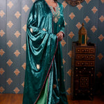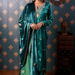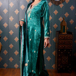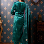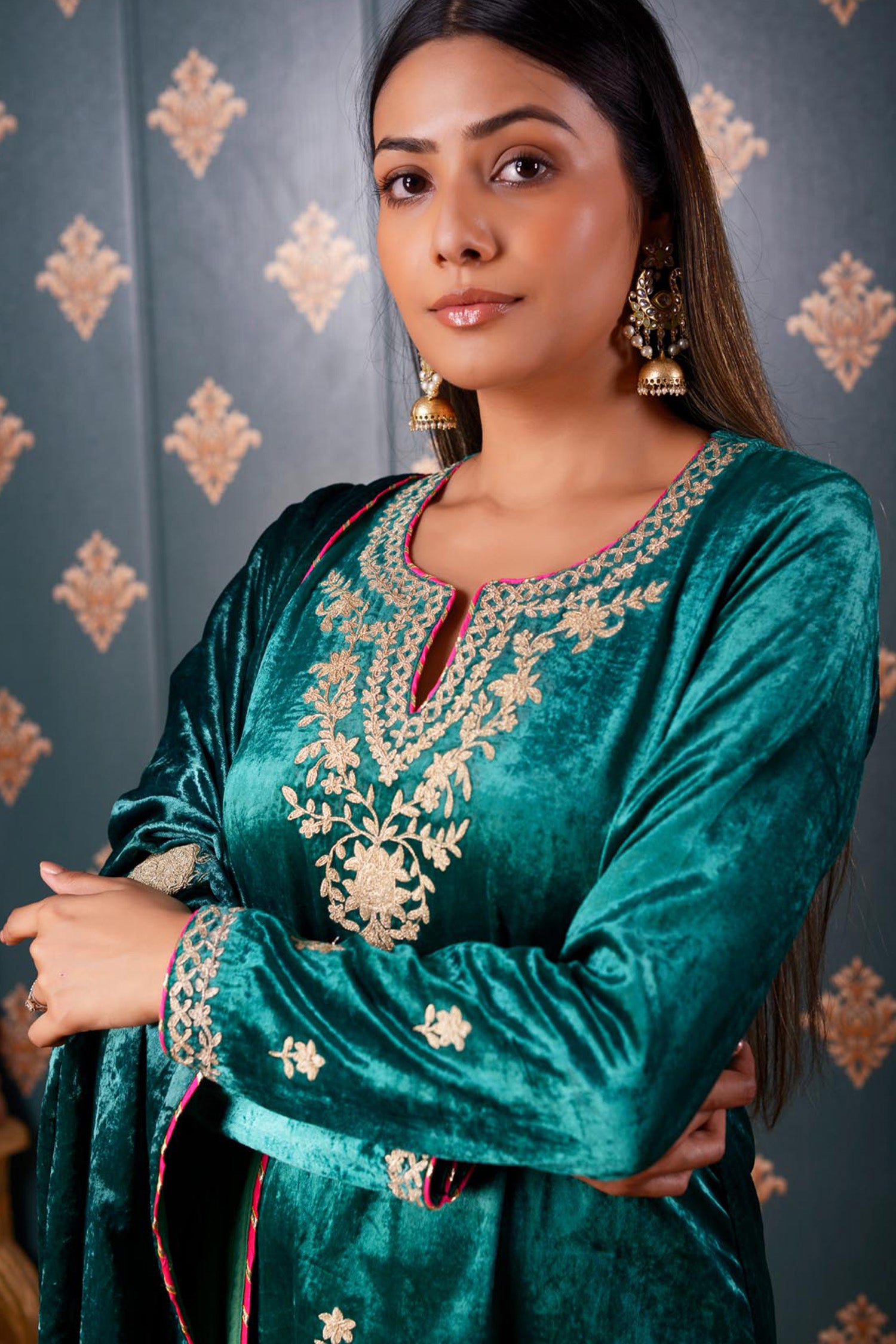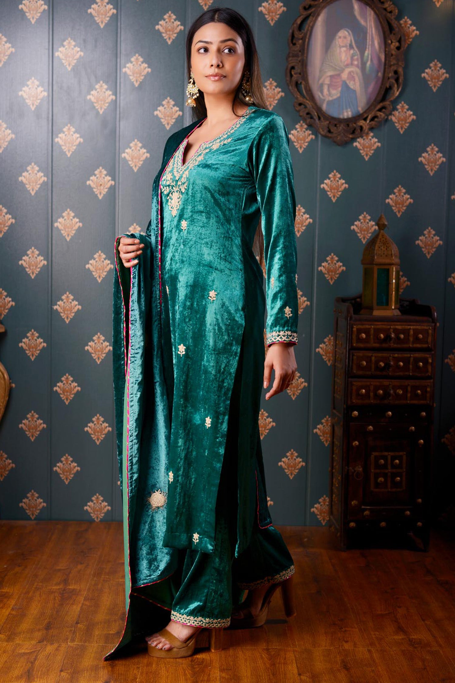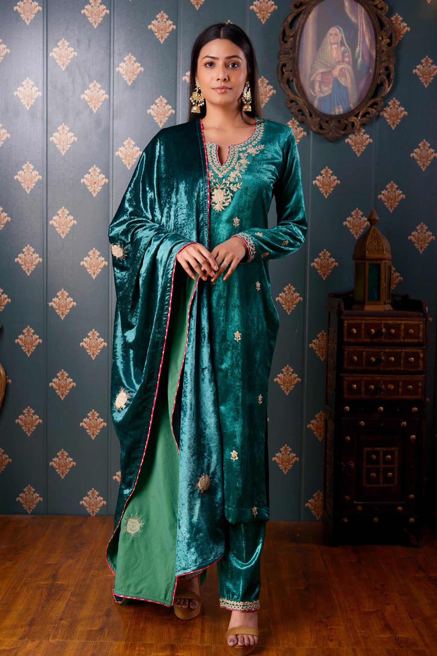 The three piece Velvet set includes Emerald Green Embroidered Neck Kurta ,Pant And Dupatta With Lace Finish for a rich and beautiful look with elegance.