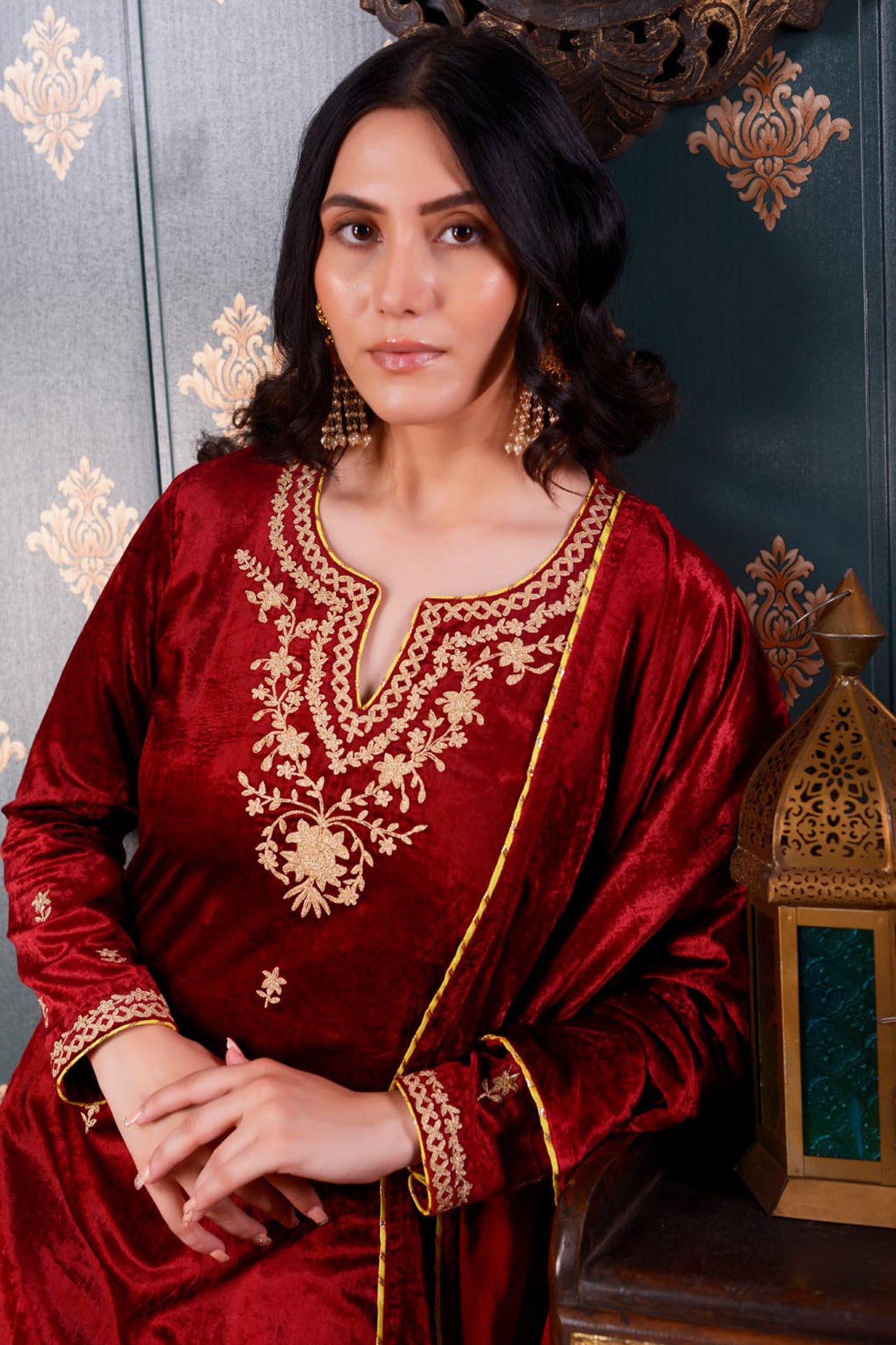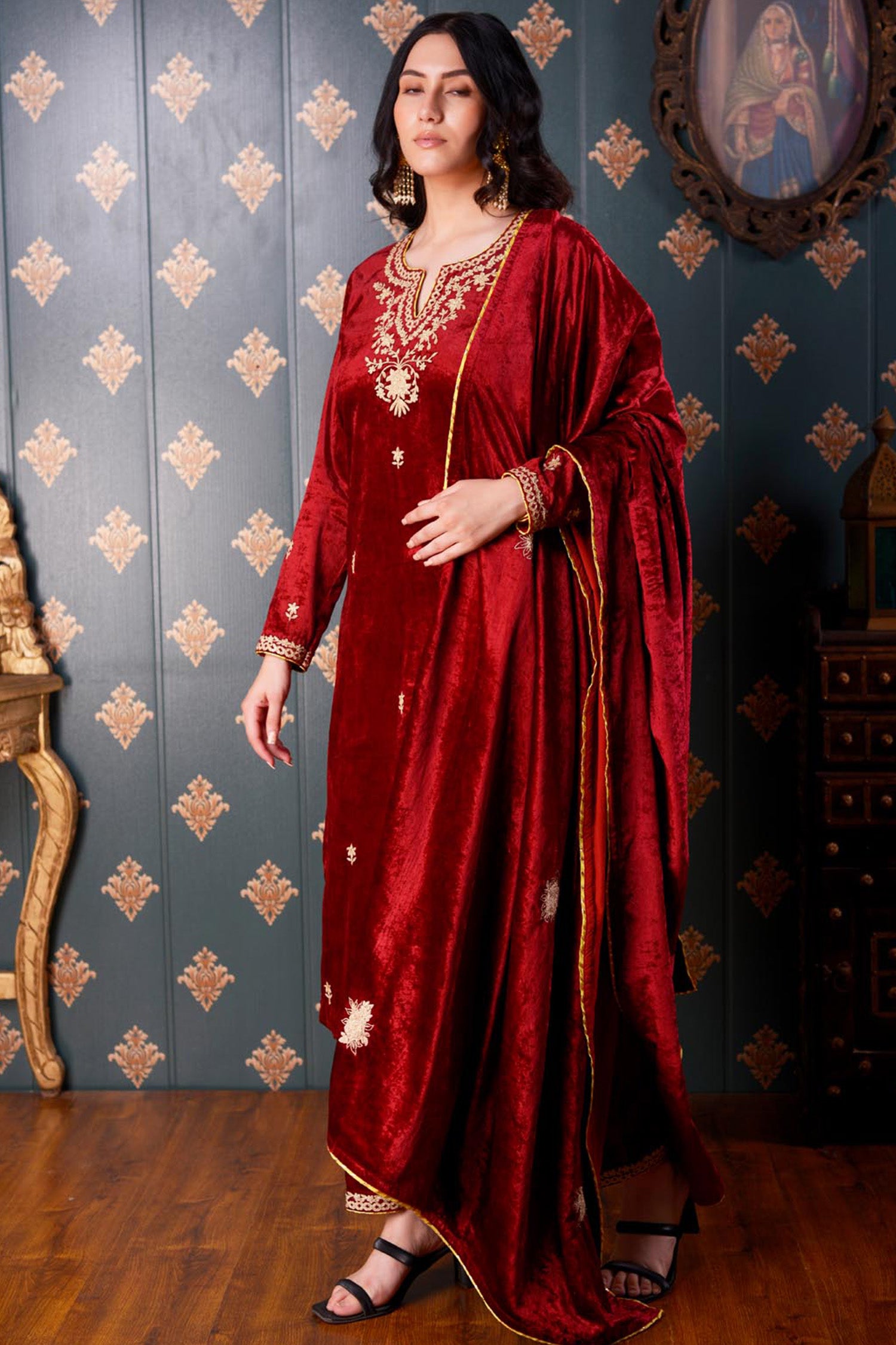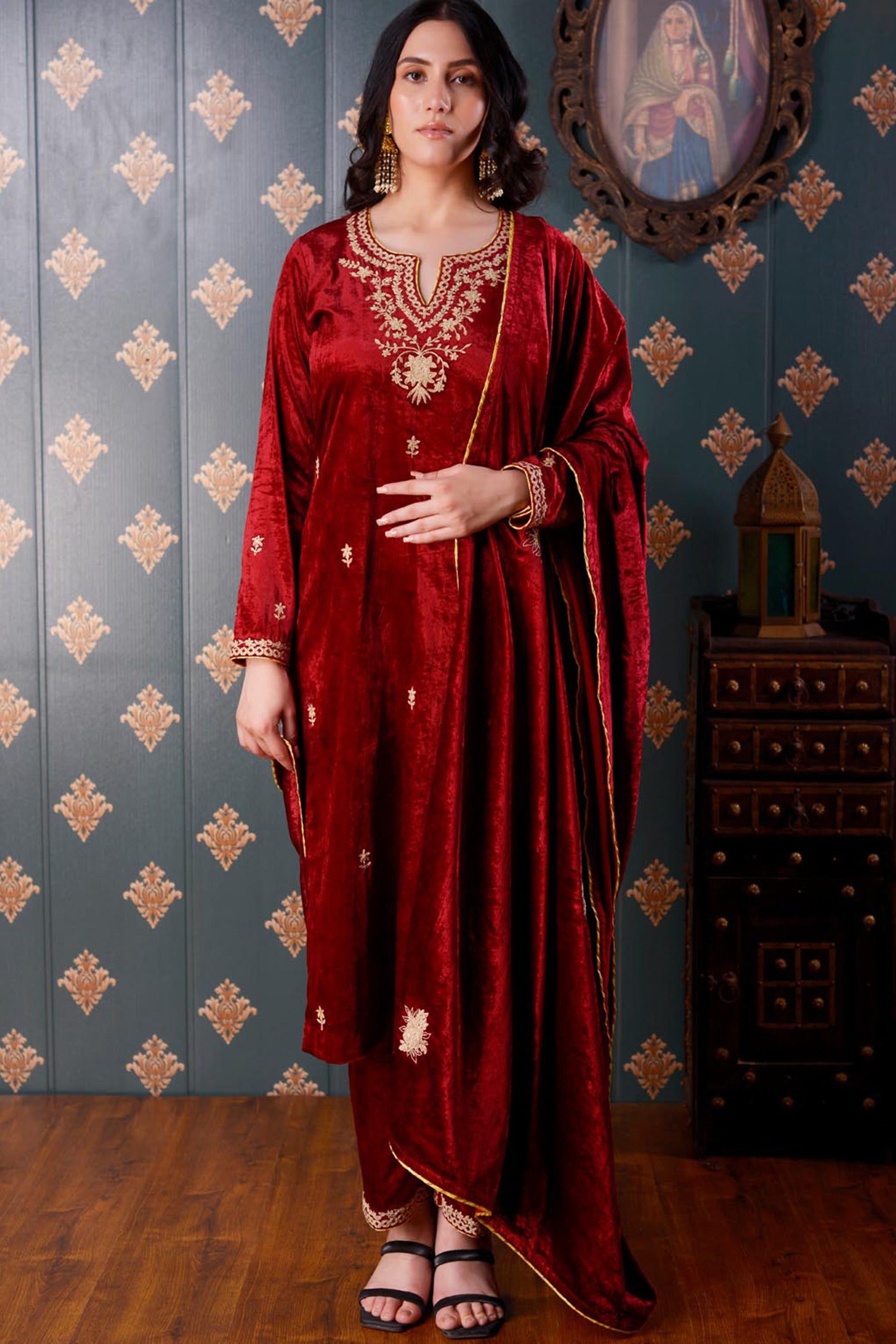 The three piece Velvet set includes Maroon Embroidered Neck Kurta ,Pant And Dupatta With Lace Finish for a rich and beautiful look with elegance.