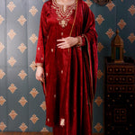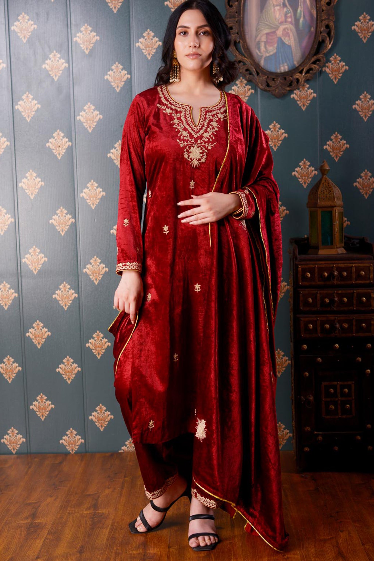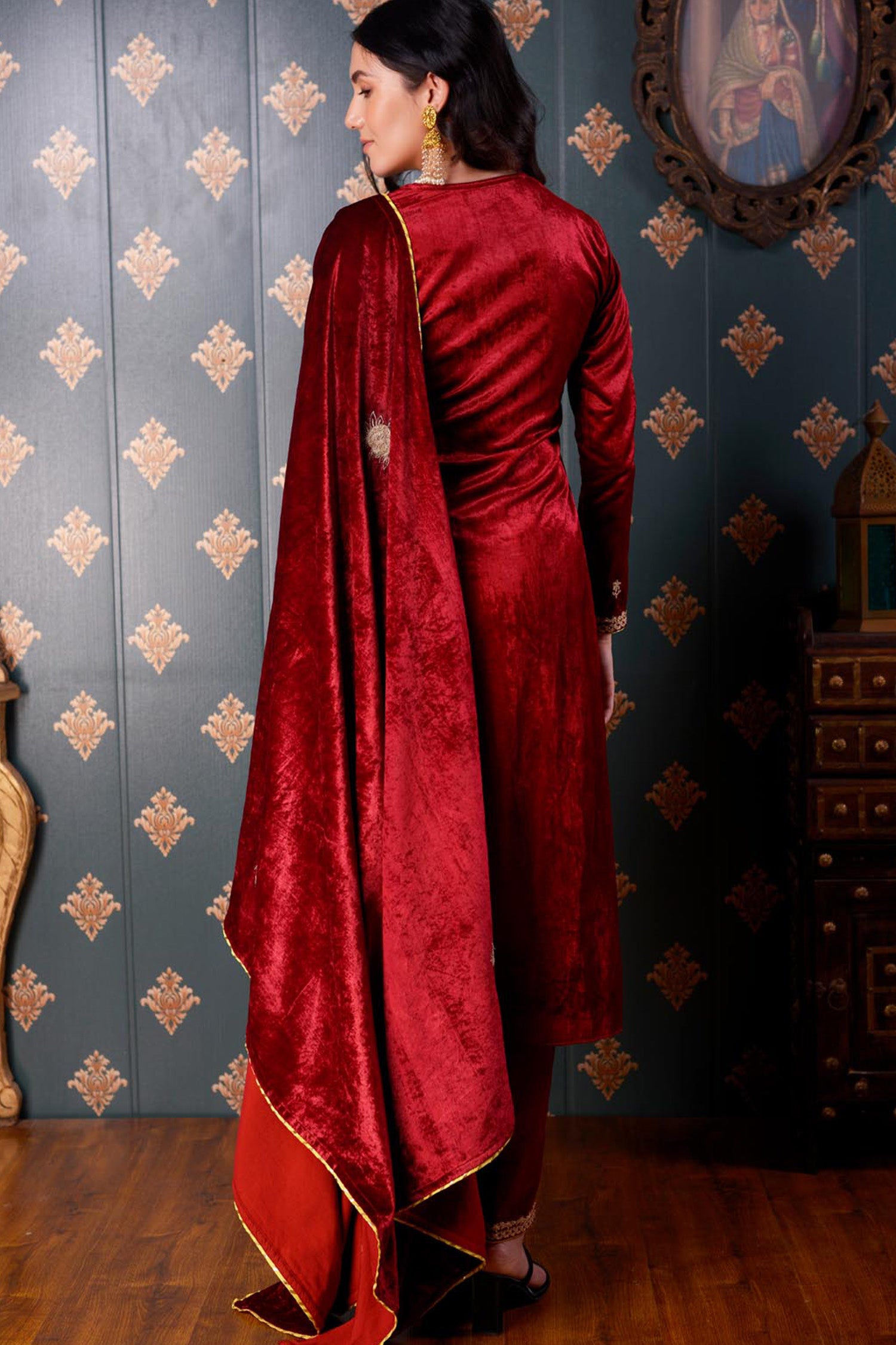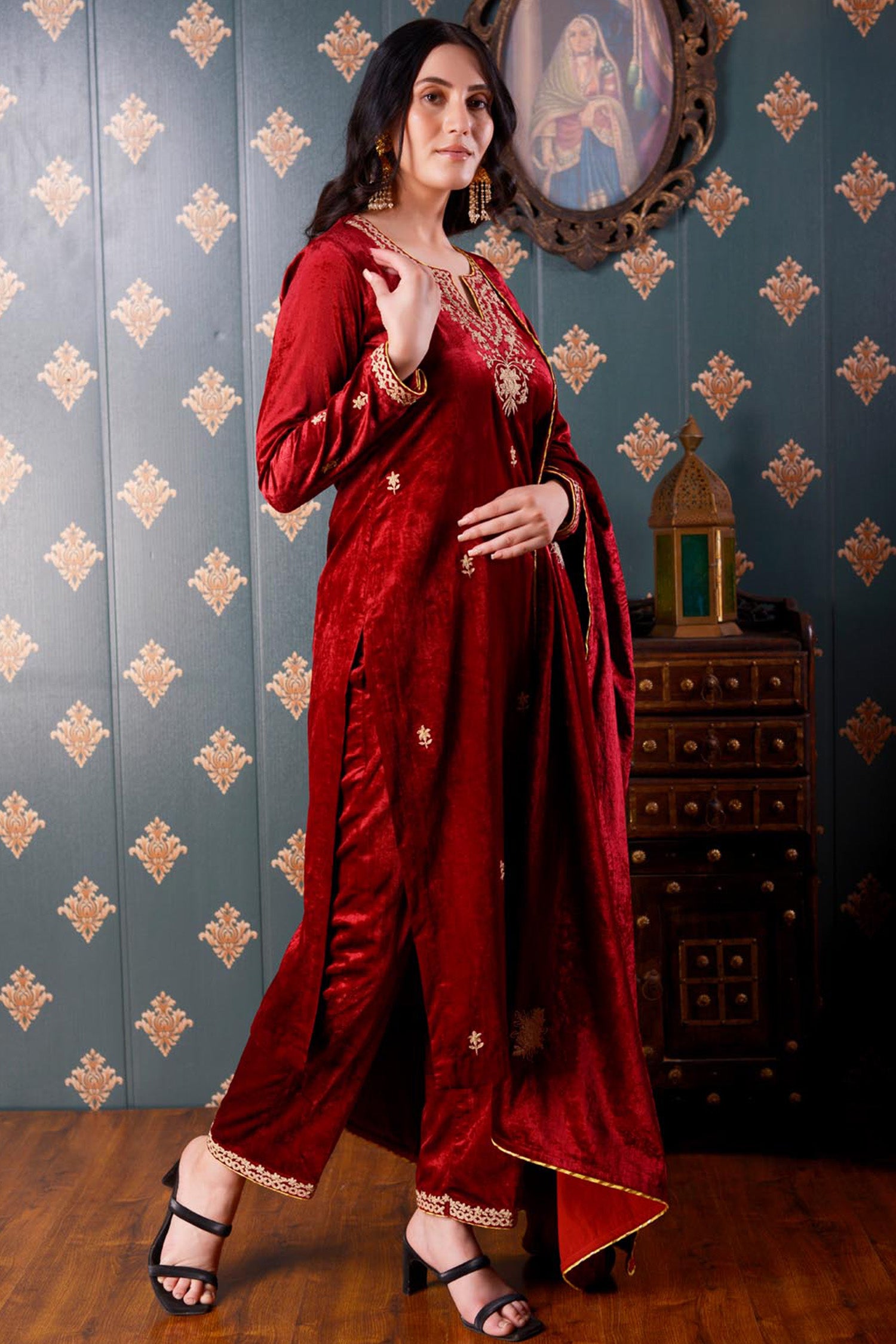 The three piece Velvet set includes Maroon Embroidered Neck Kurta ,Pant And Dupatta With Lace Finish for a rich and beautiful look with elegance.