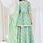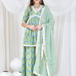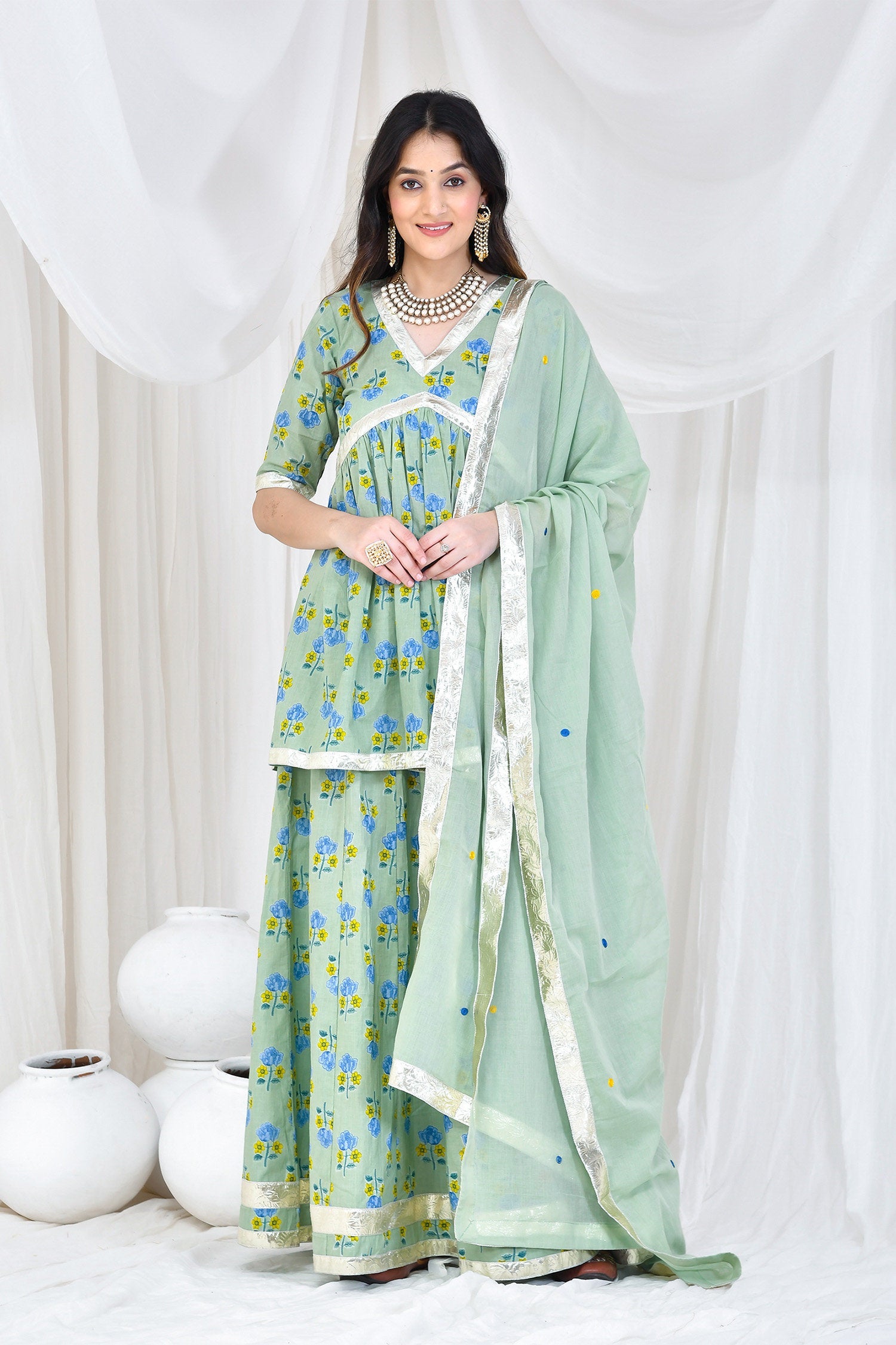 Own yourself this understated luxury of Greenish grey cotton kurta skirt set adorned with handblock prints and accompanied with dupatta adorned aari embroidery to give a finishing touch.