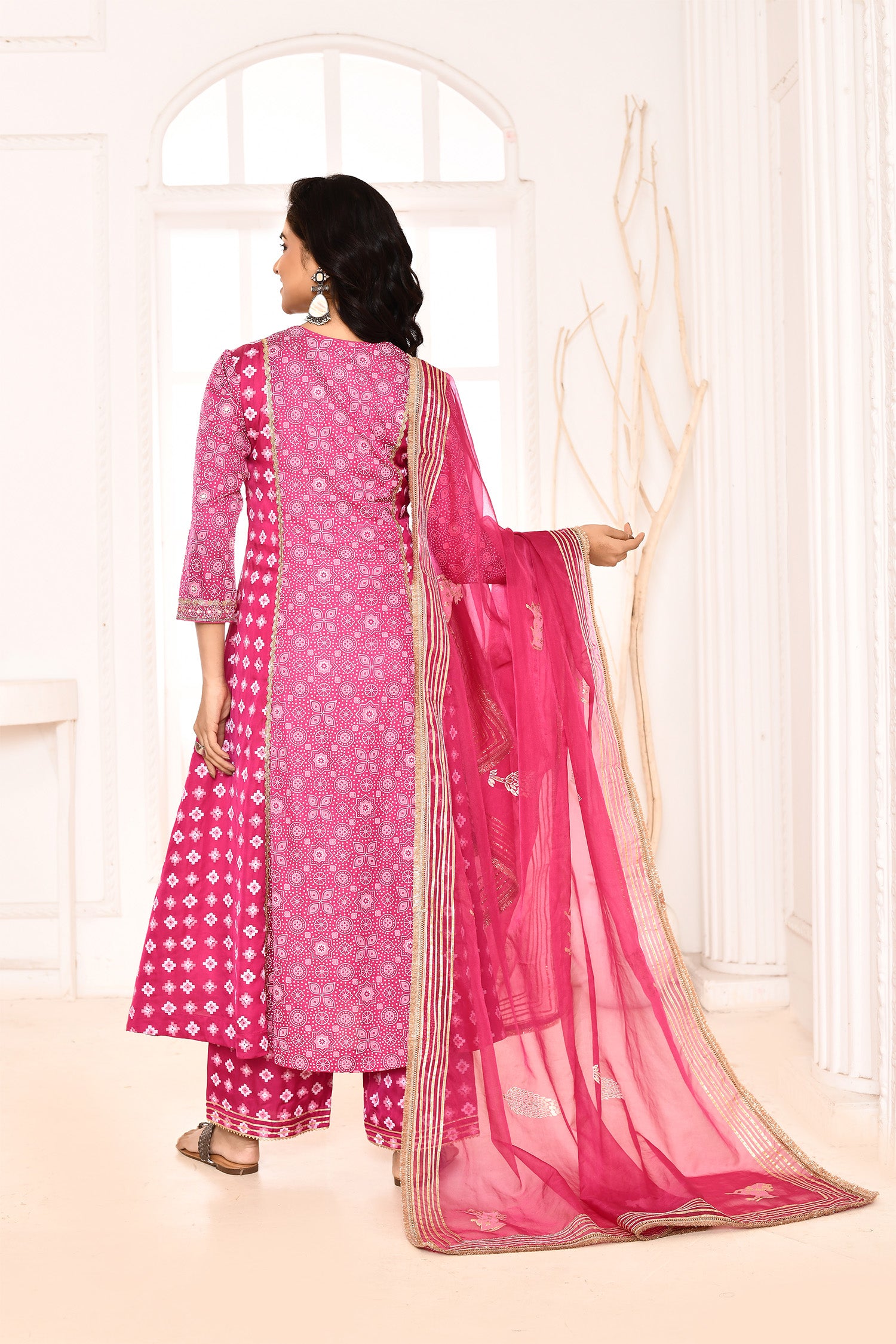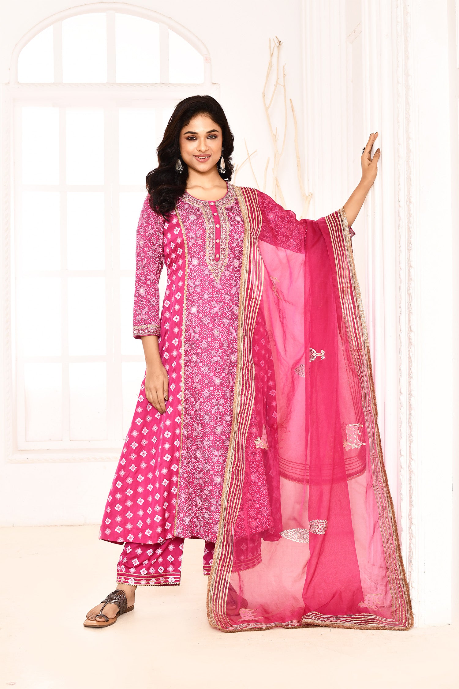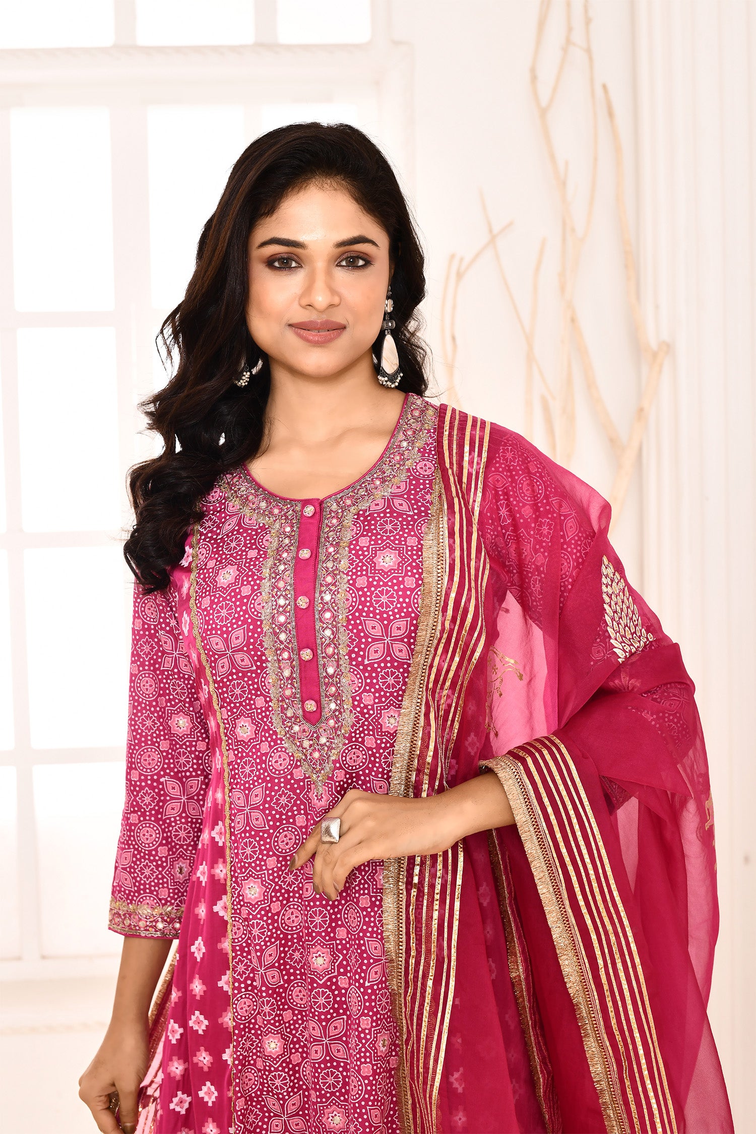 Magenta Hand Embroidery With Block Printed A-Line Kurta And Palazzo