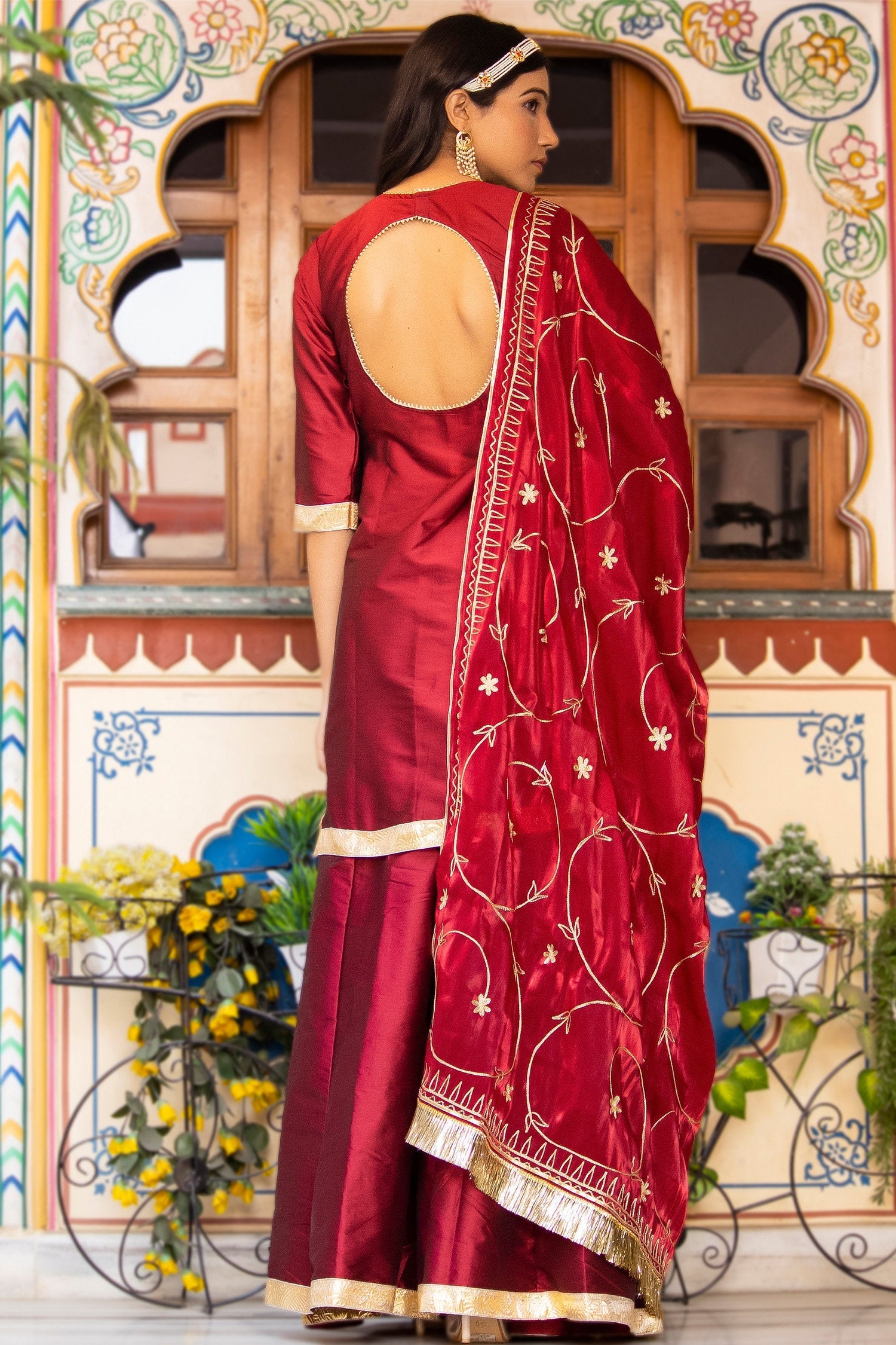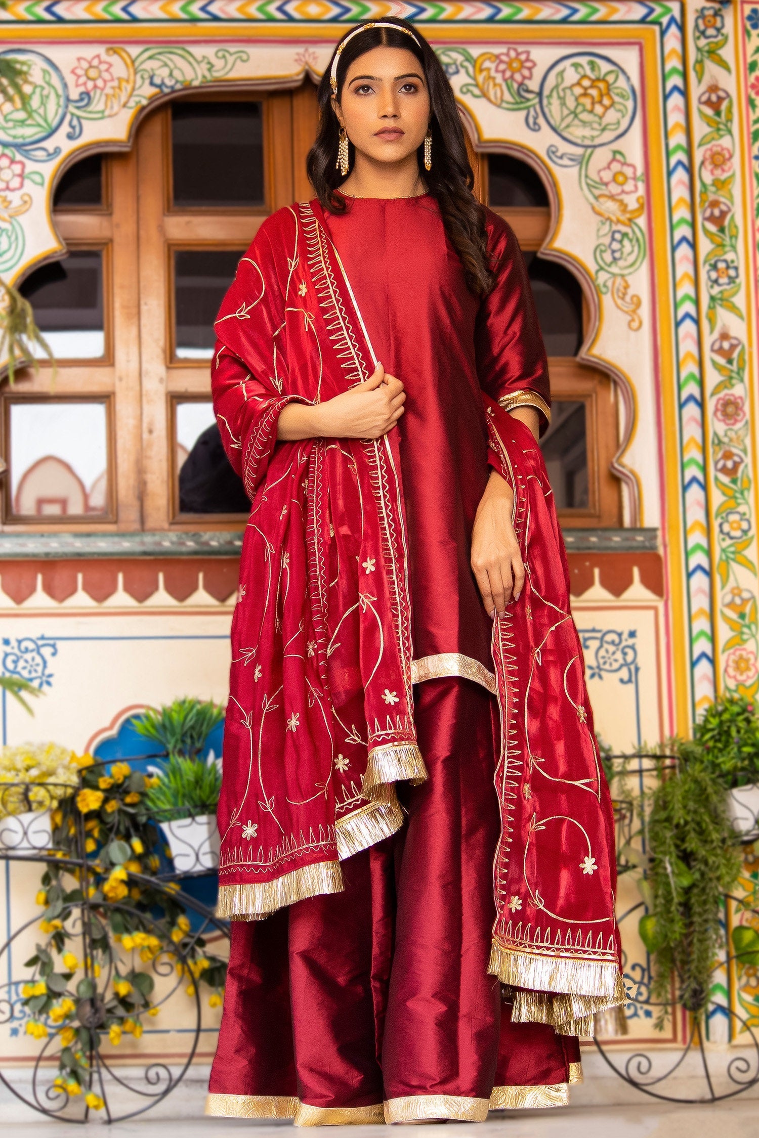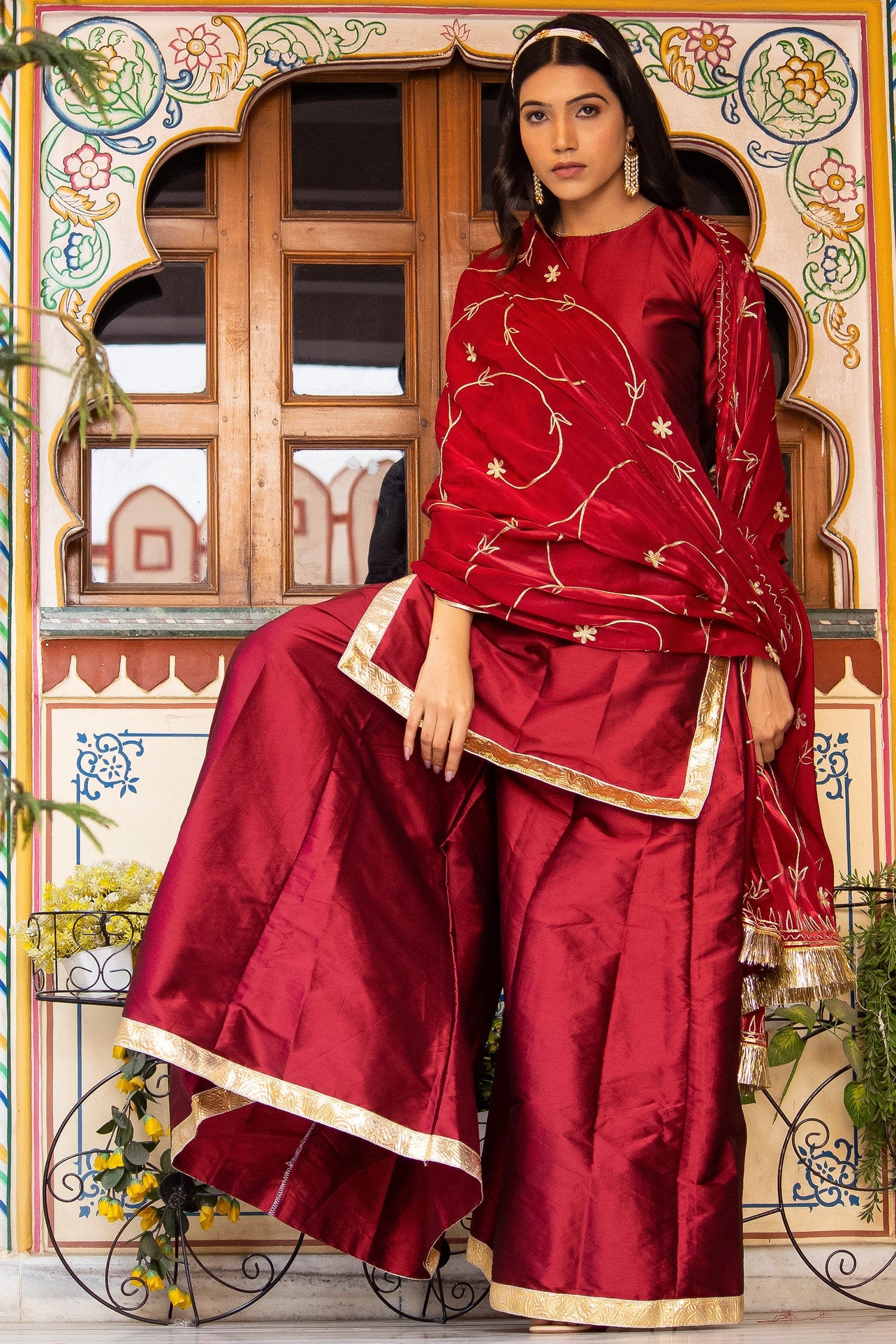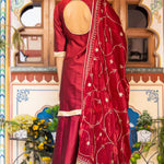 Maroon pure silk kurta set adorned with gold lace, paired with matching pants and embroidered organza dupatta , adds a refined , modern finish to classic design.