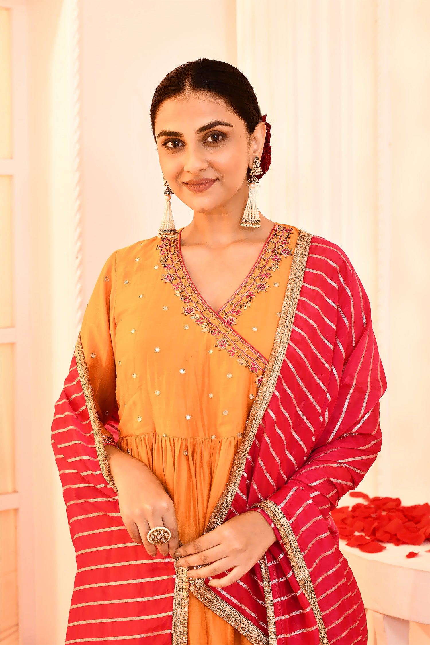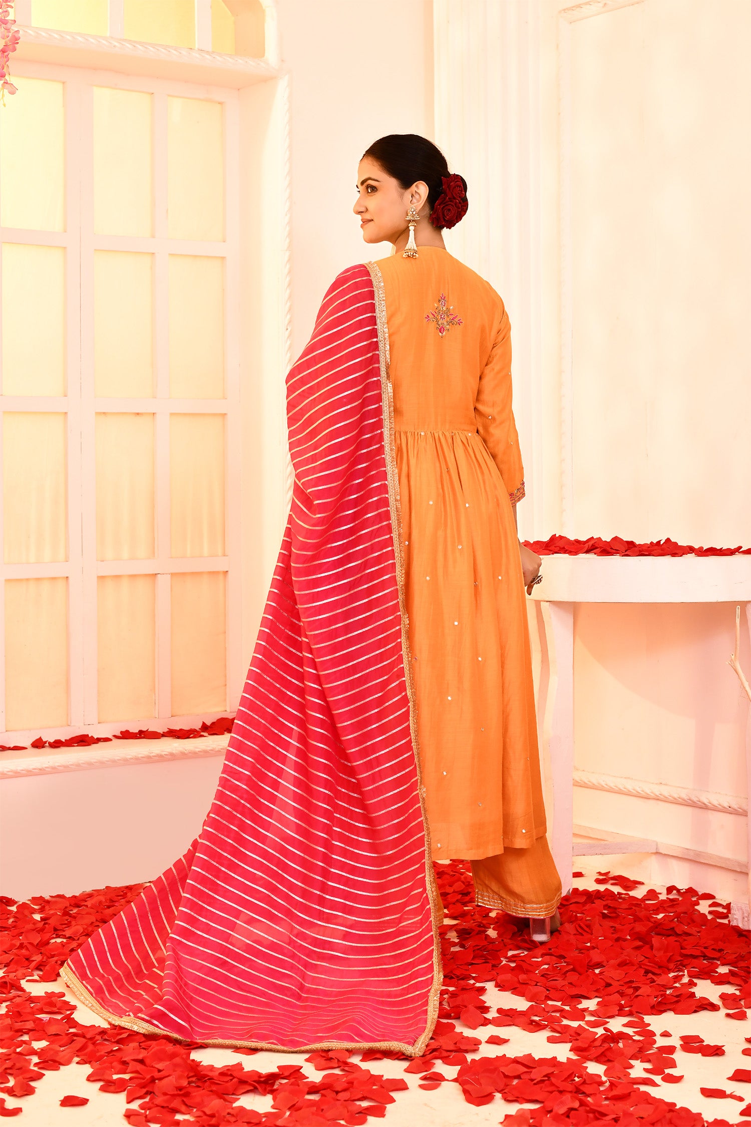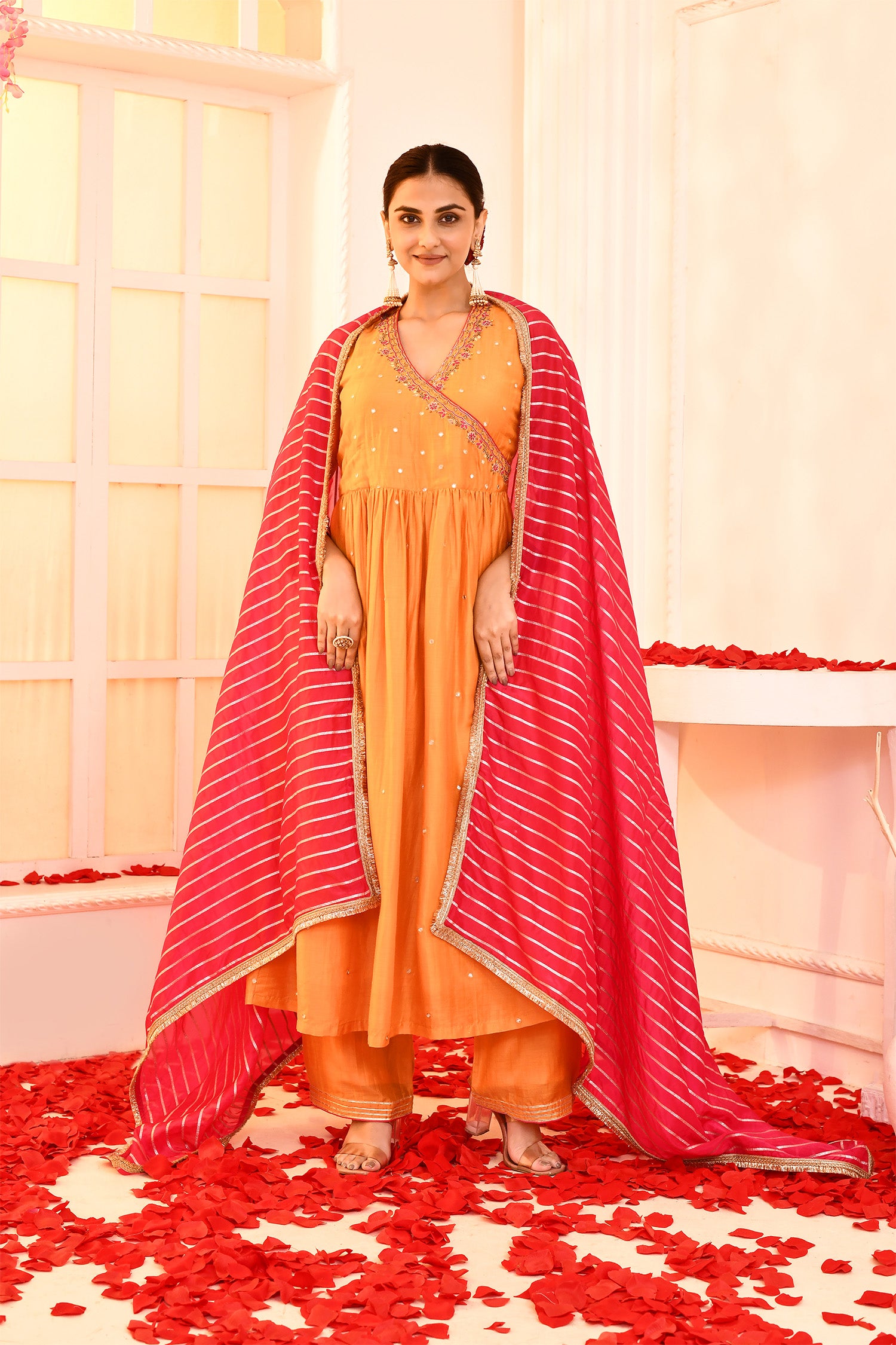 The Cotton Silk Hand Embroidered Angrakha Kurta And Cotton Silk Gotta Finish Palazzo With Golden Strip Gotta Lace Finish Dupatta for a casual yet dignified look along with the stylish comfort.