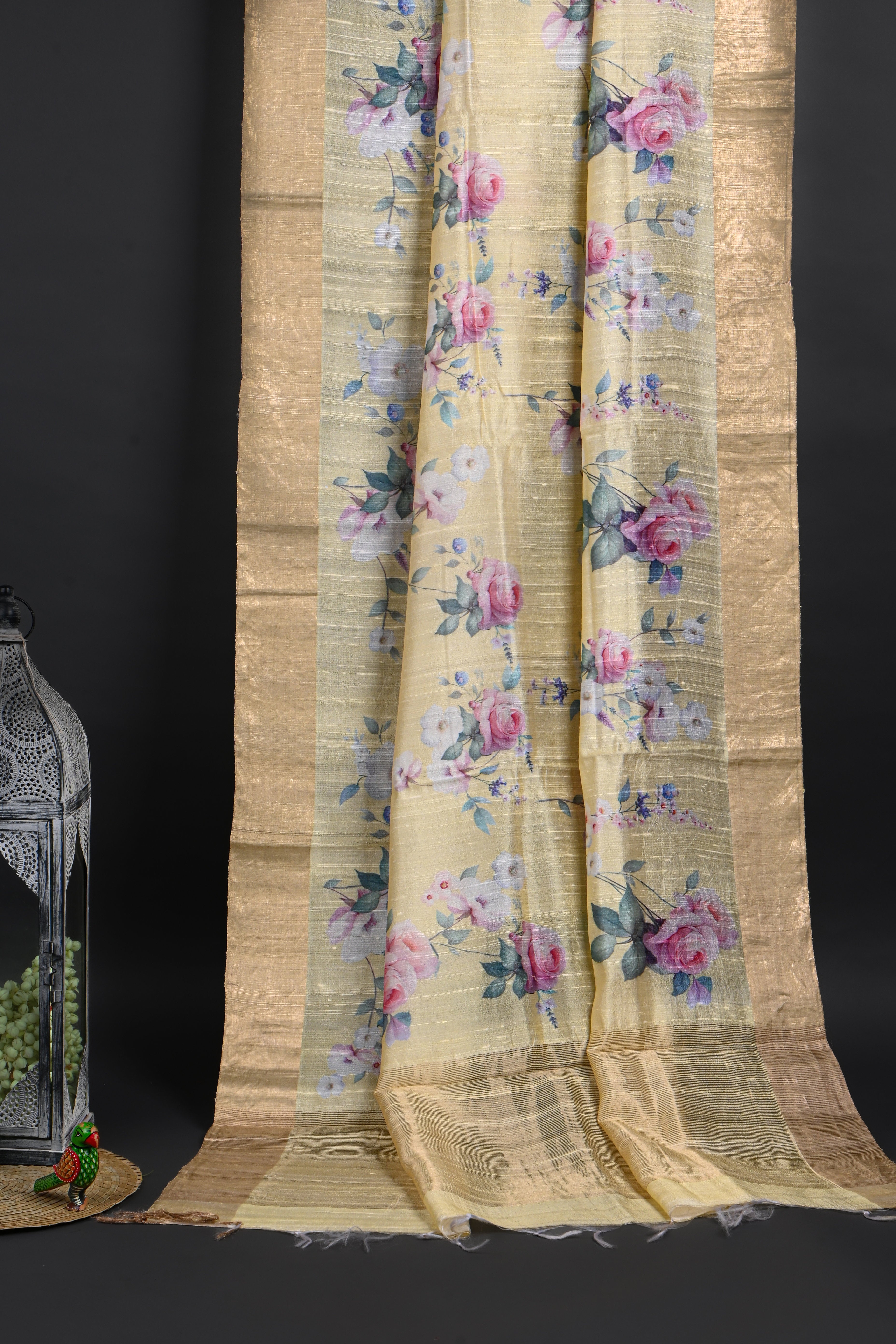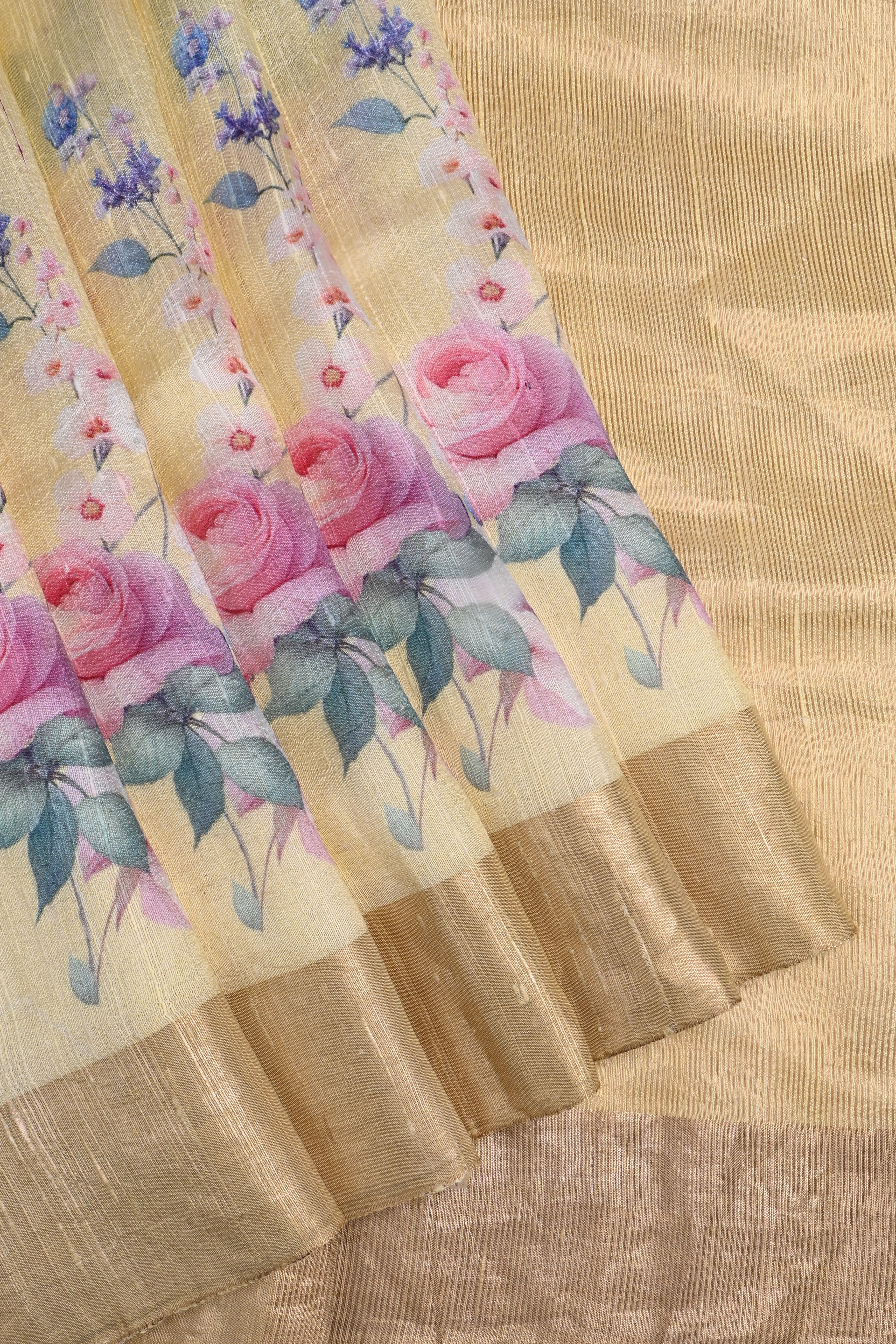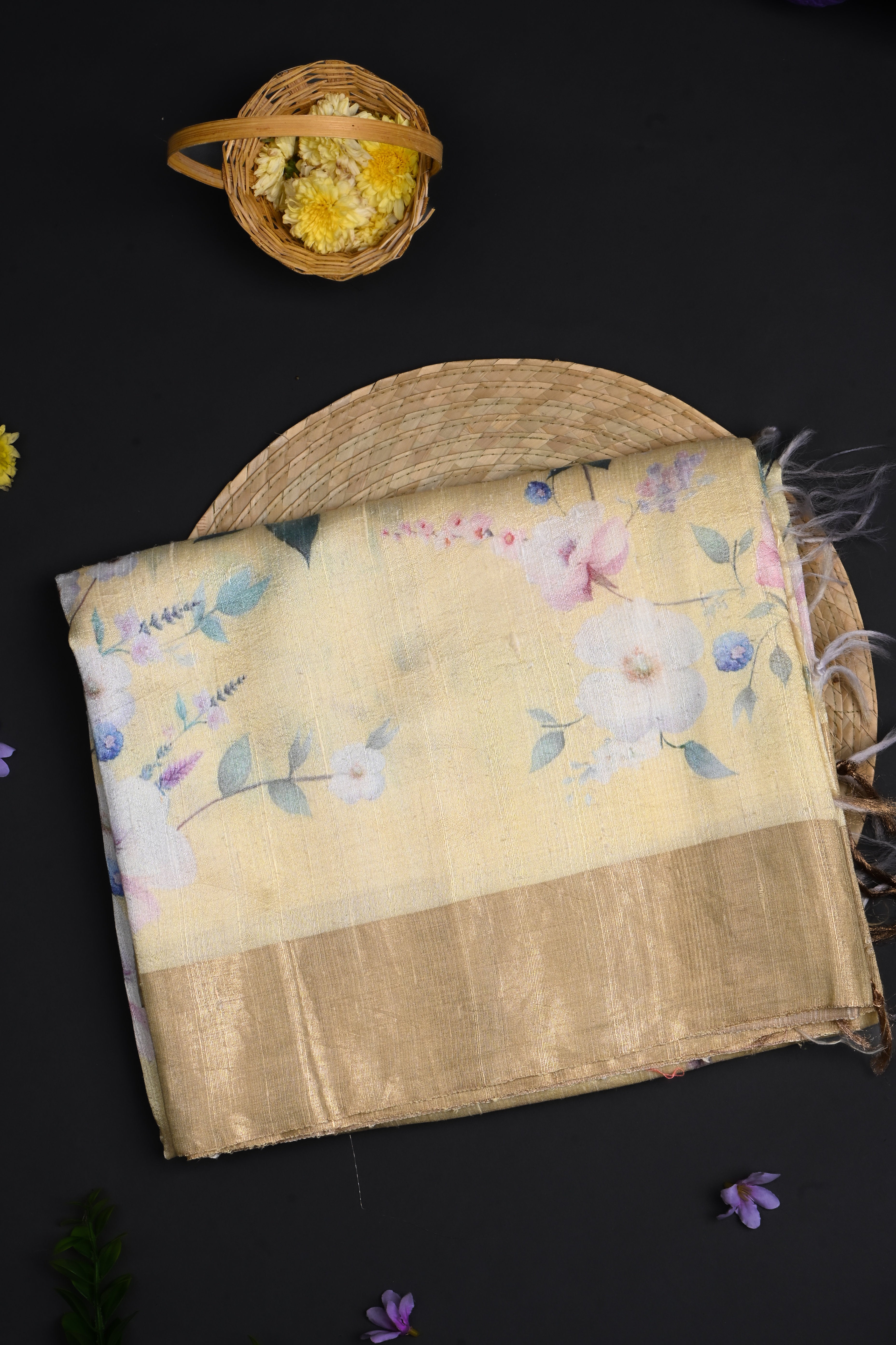 The pastel yellow floral printed dupion silk saree with golden zari border along with a matching blouse for a classy look with grace.