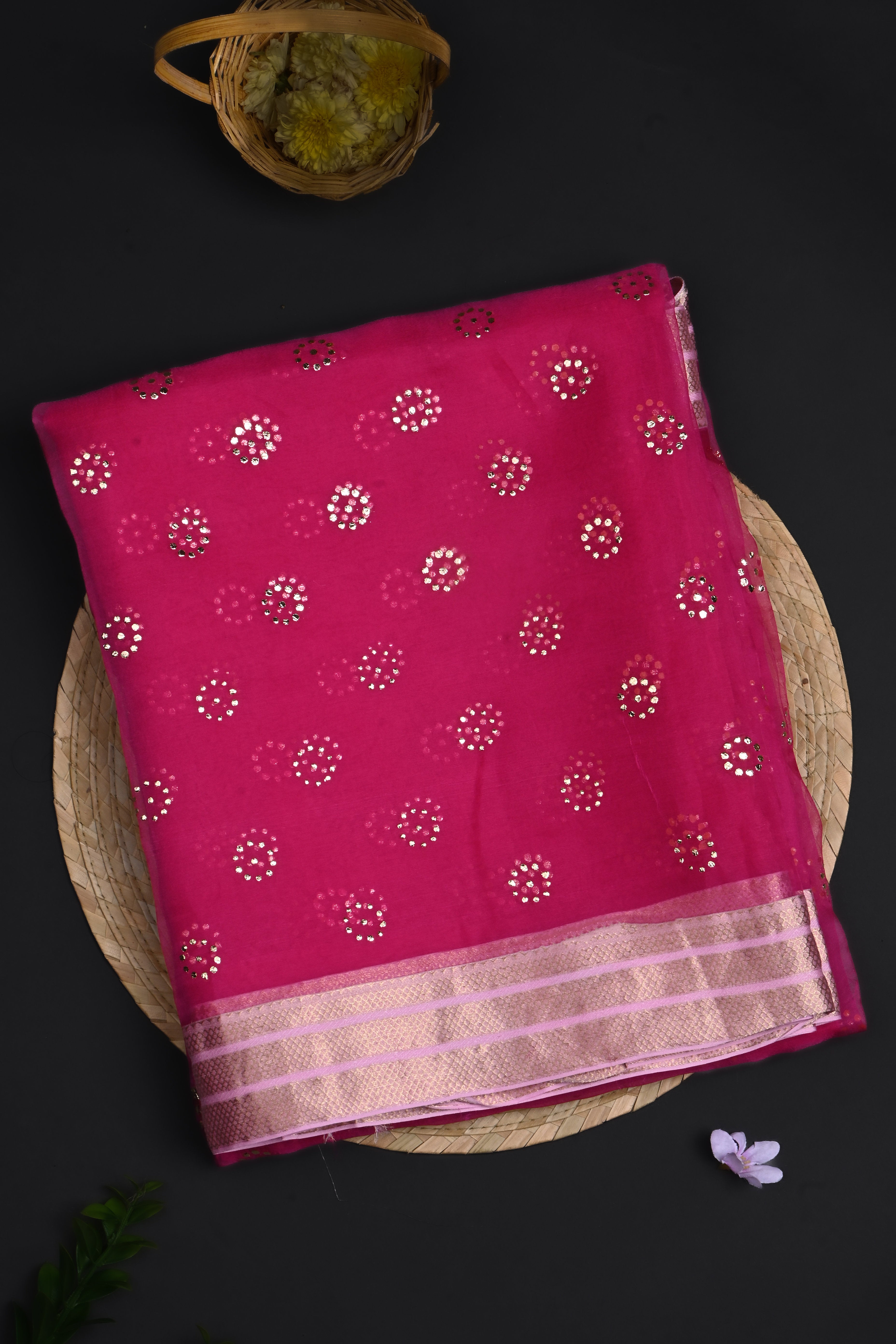 The pink foil printed organza saree with floral foil prints and zari border for a modern look with ethnic touch giving it a blend of perfect look.