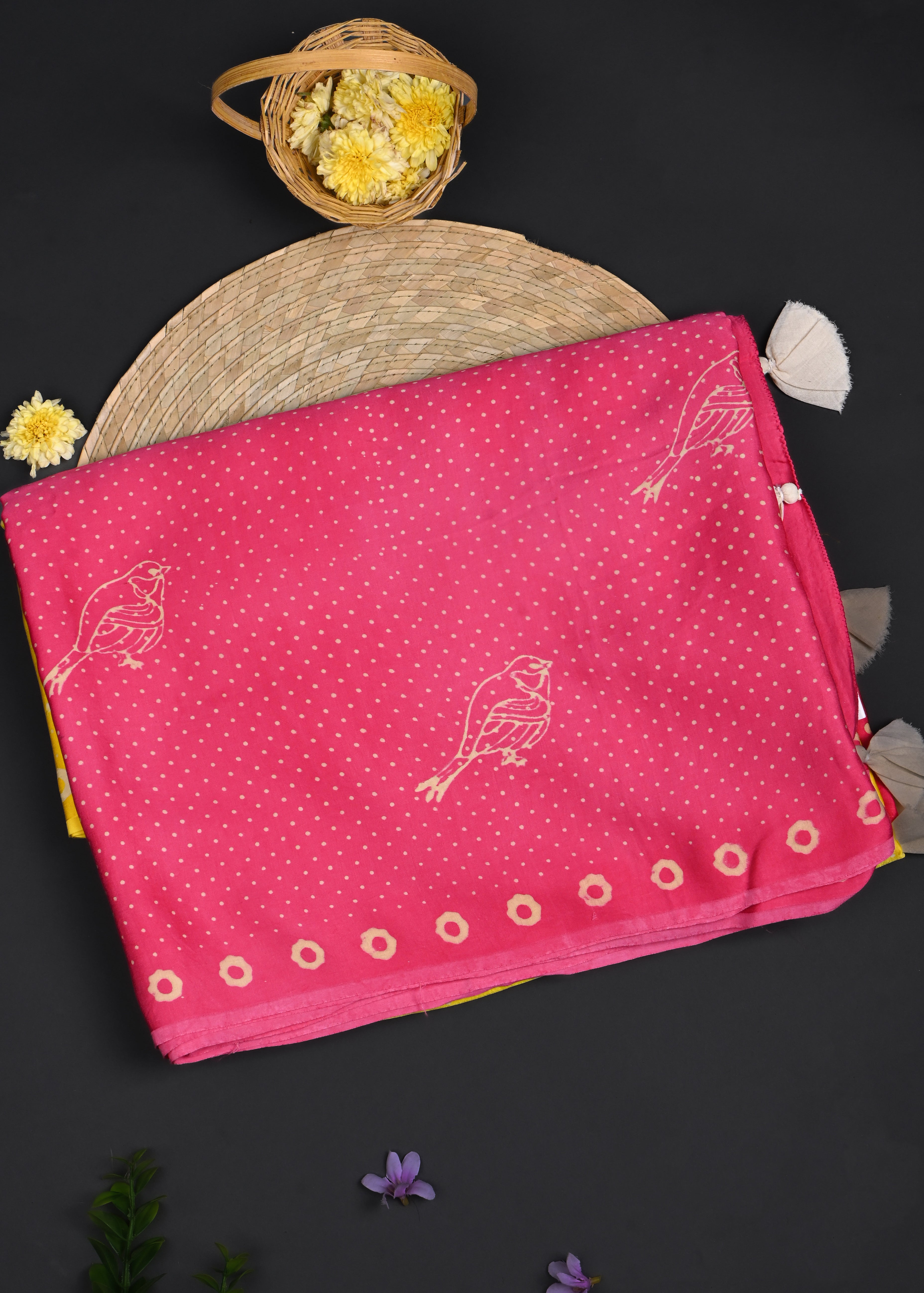 Yellow And Pink Bird Printed Satin Saree