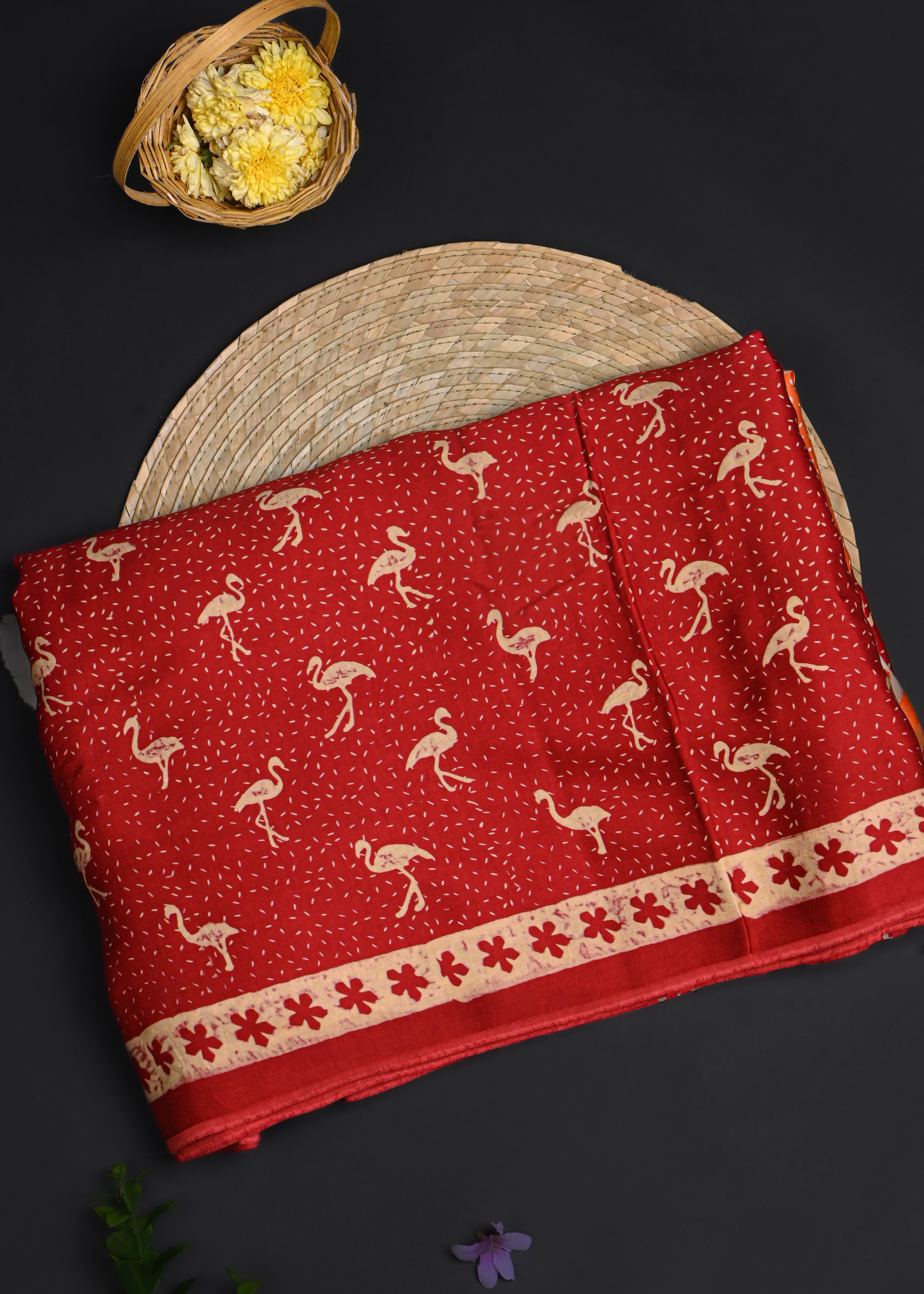 Dark Red And Orange Printed Satin Saree