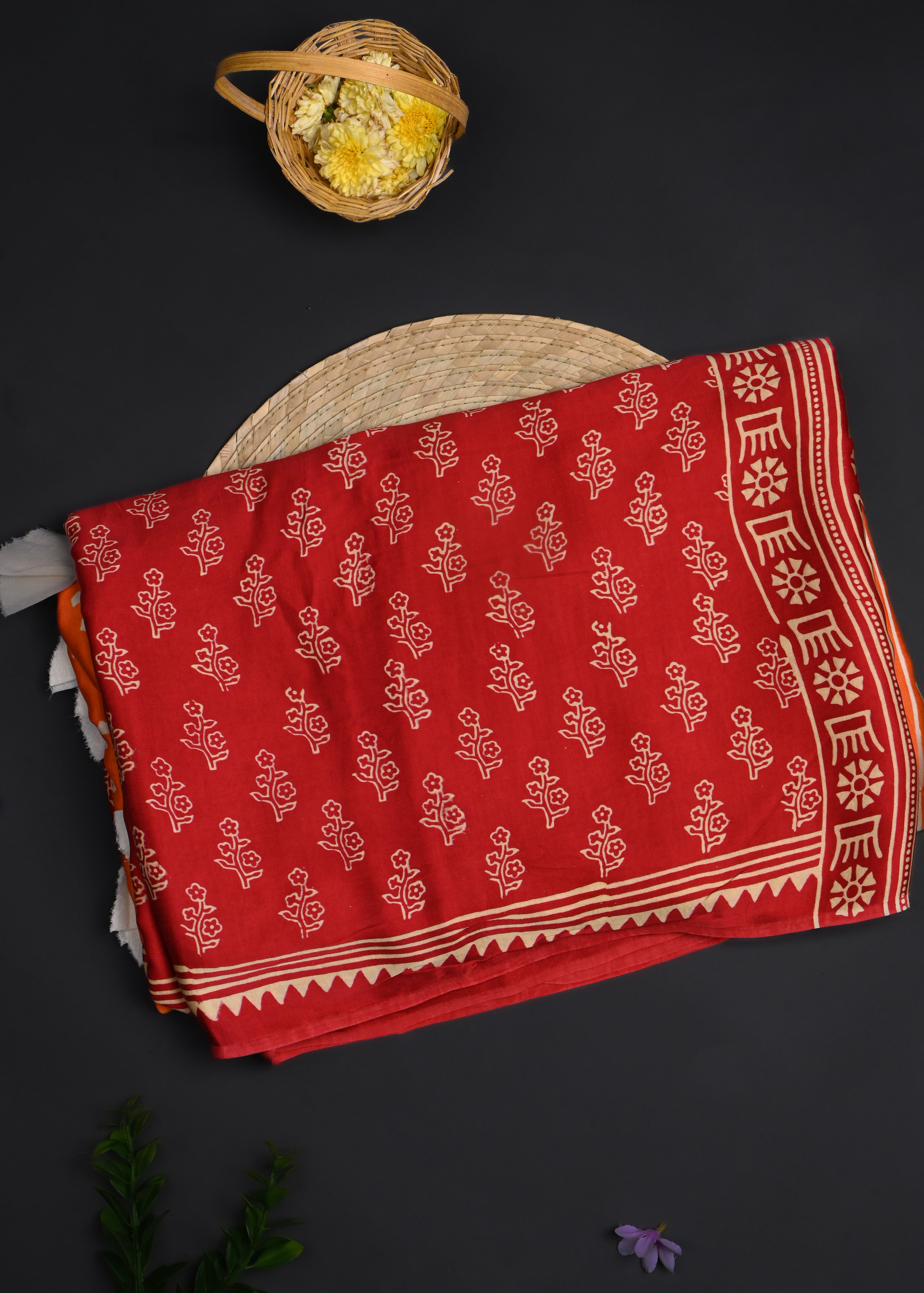 Red And Orange Printed Satin Saree