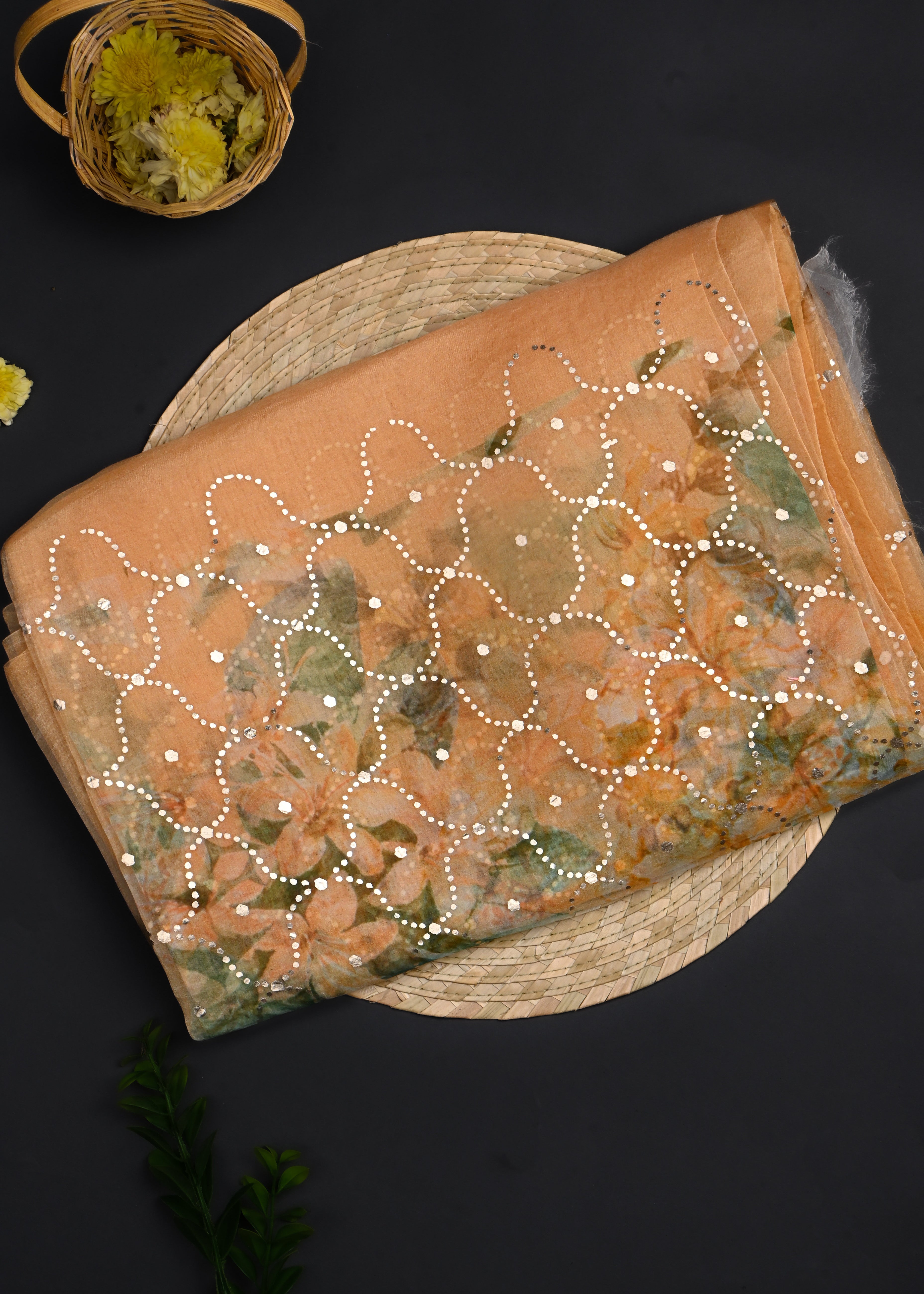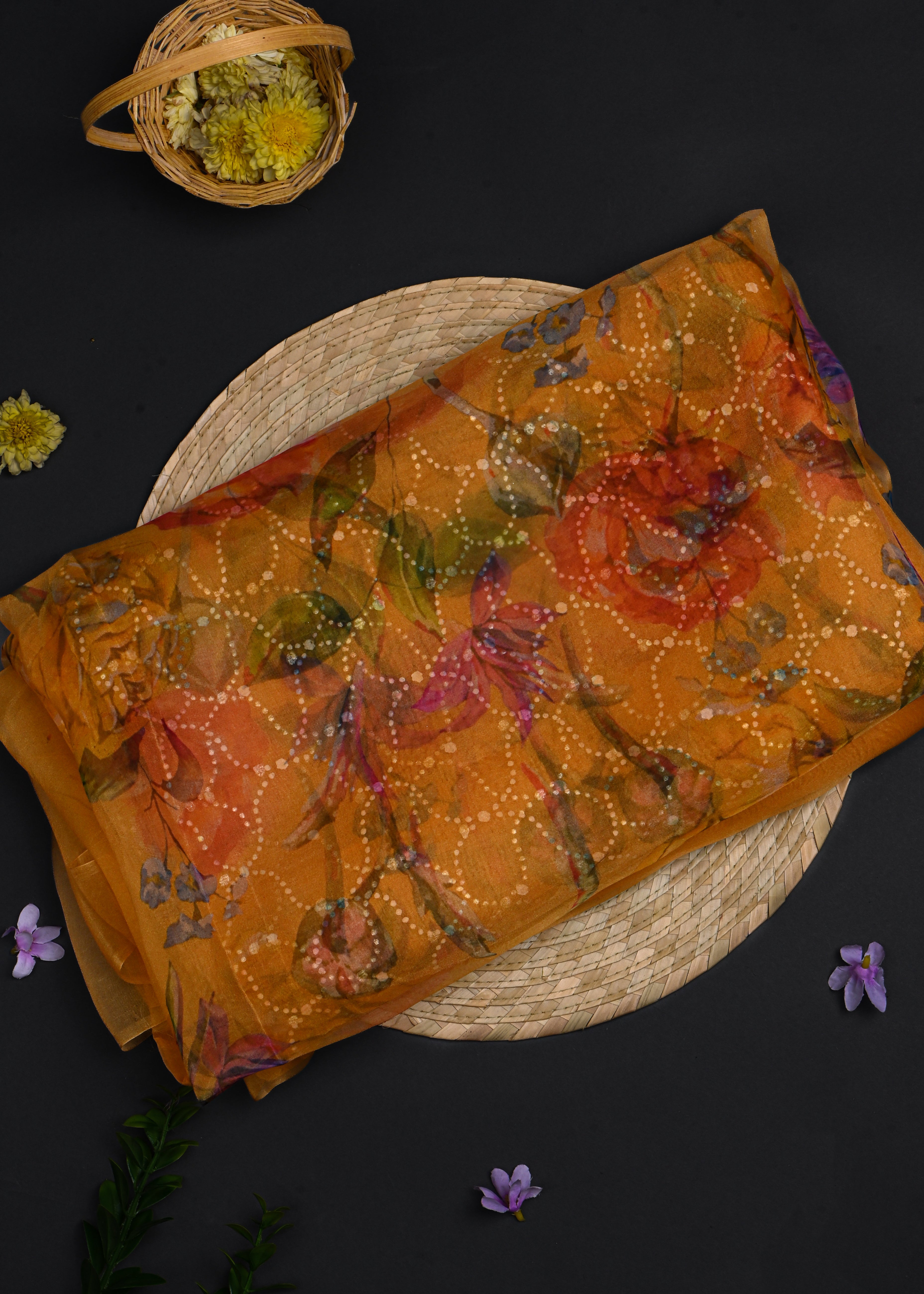 Deep Yellow Printed Organza Saree