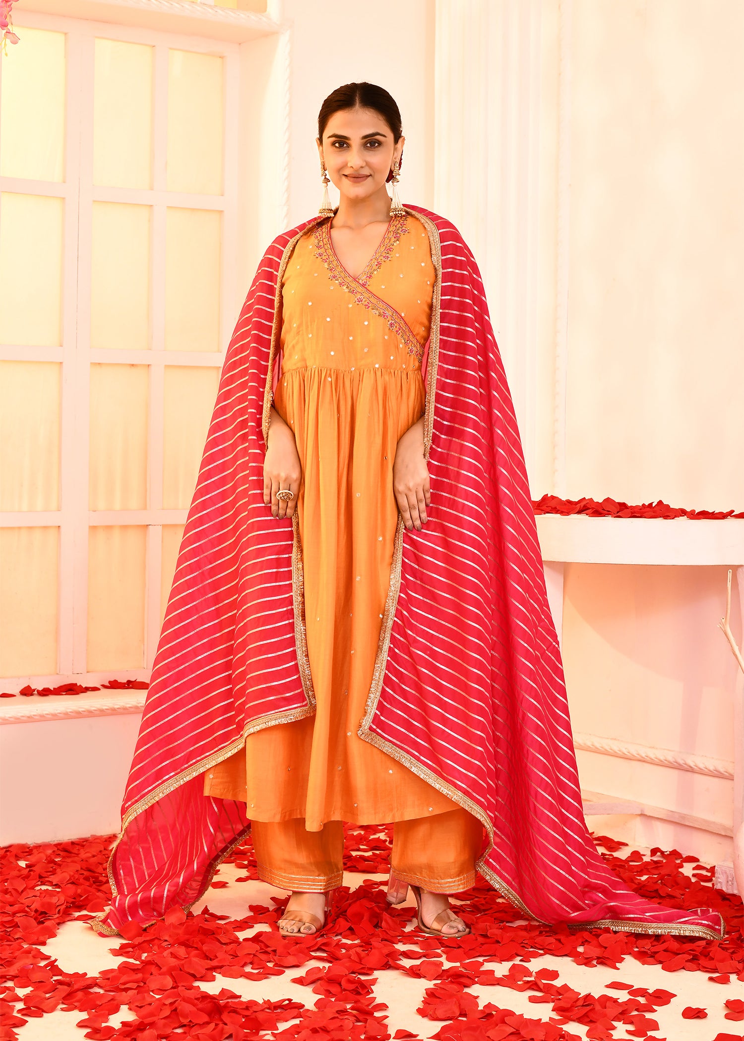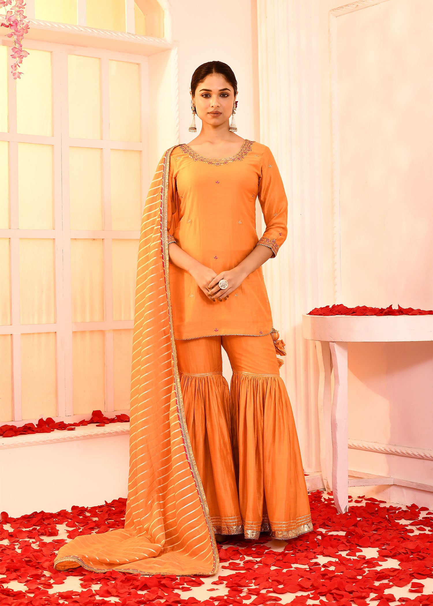 Orange Hand Embroidered Kurta And Palazzo Set