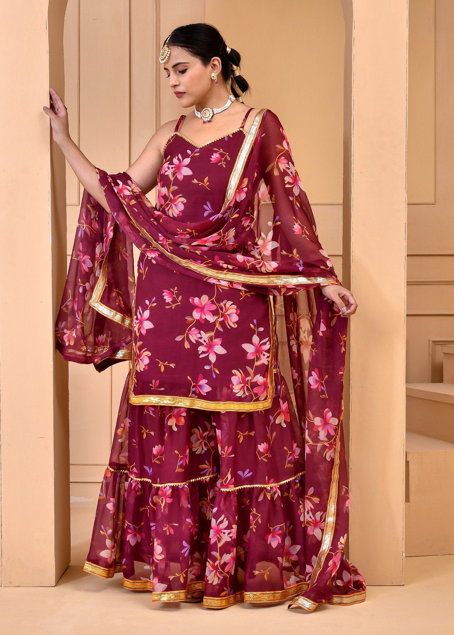 Strawberry Pink Georgette Anarkali Set With Floral Prints