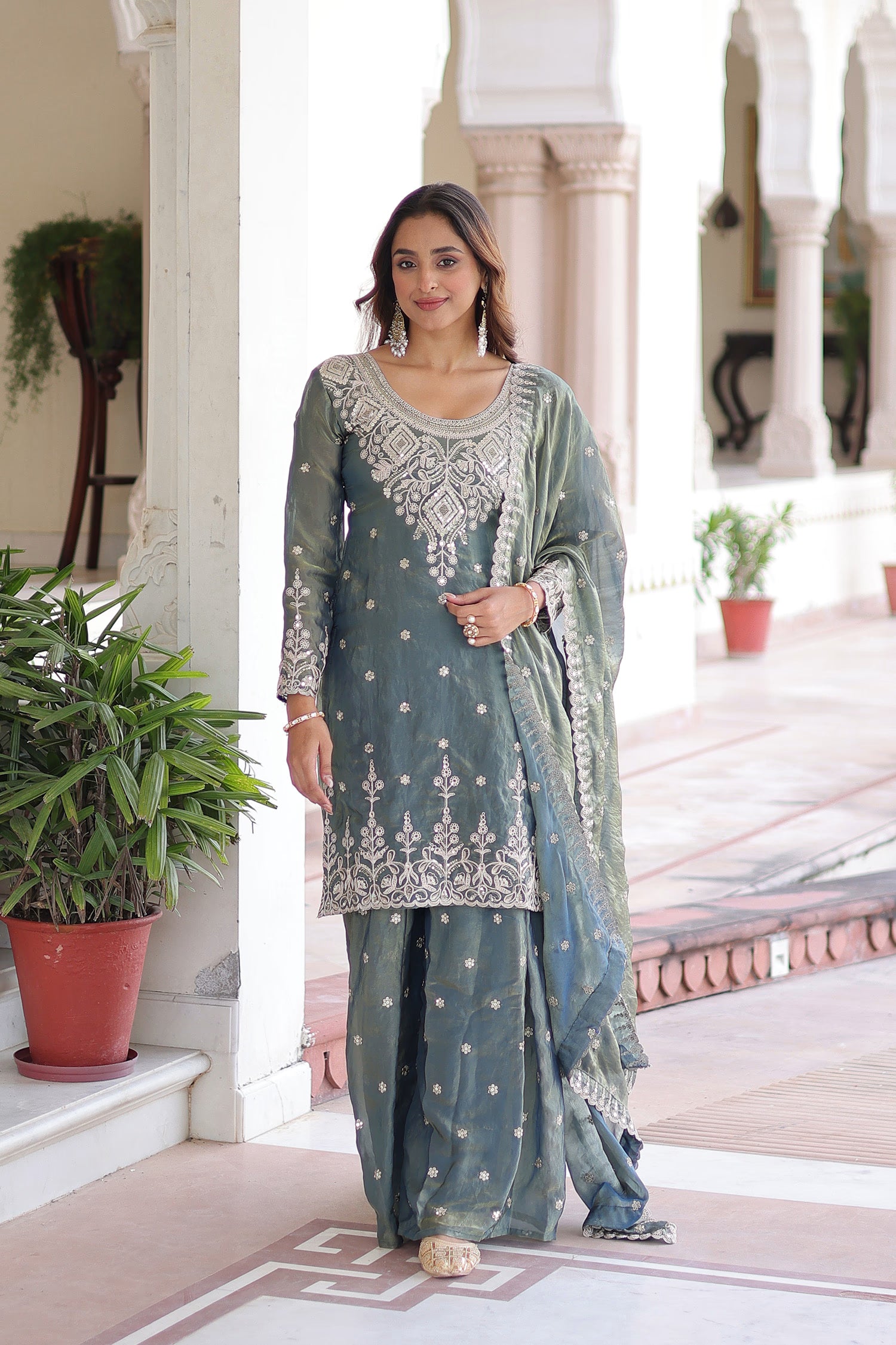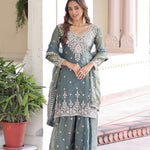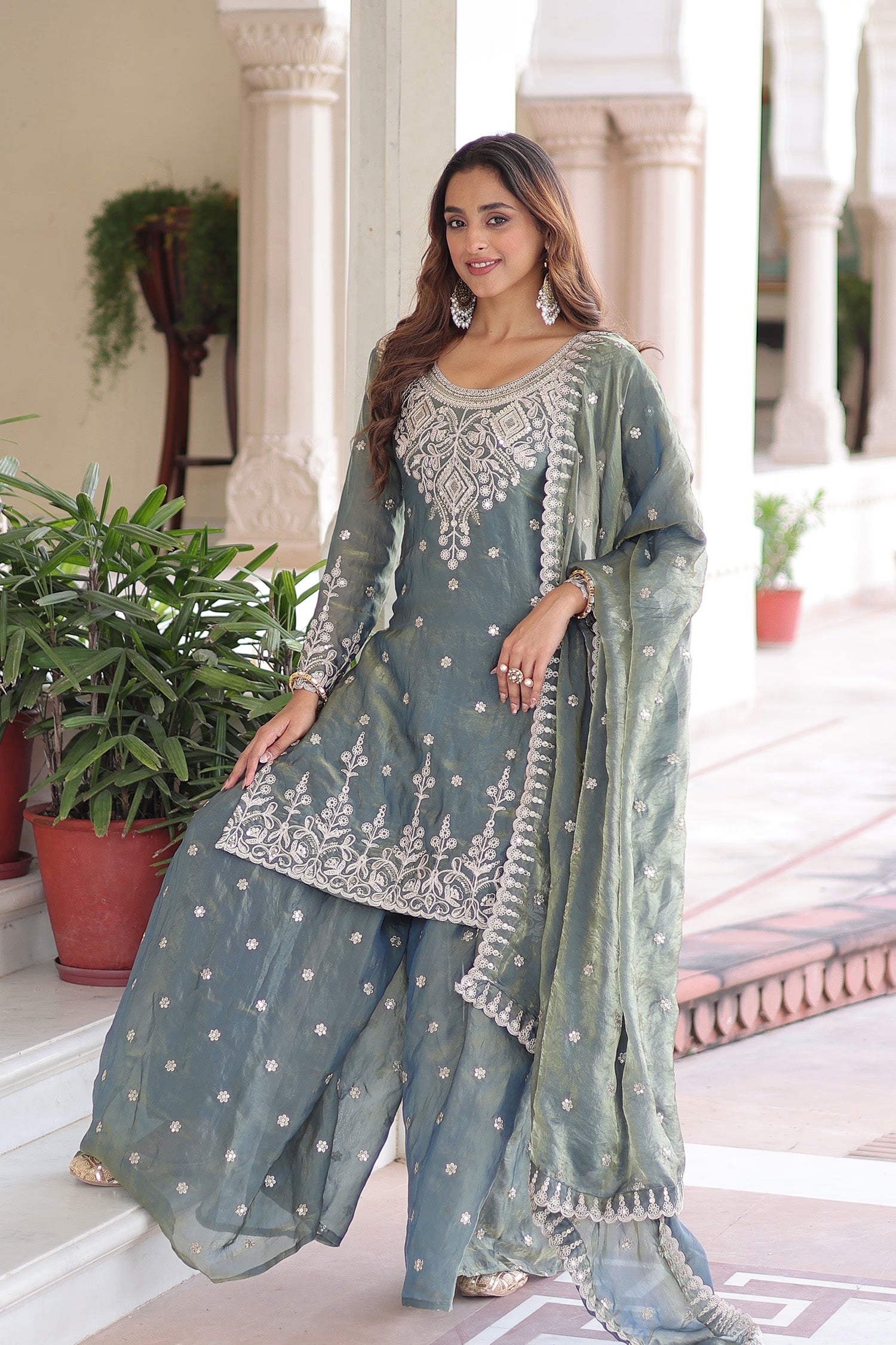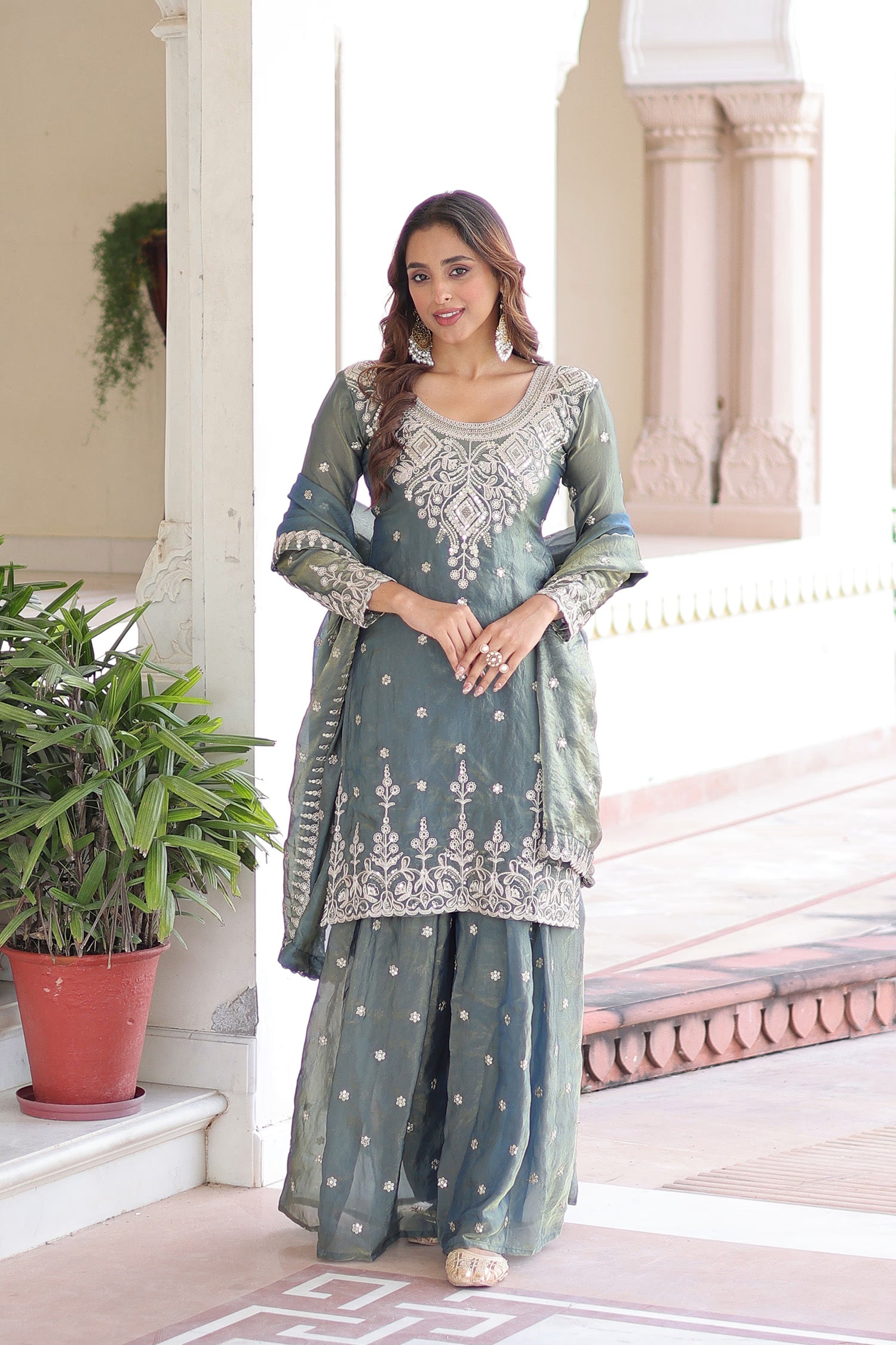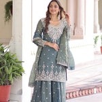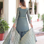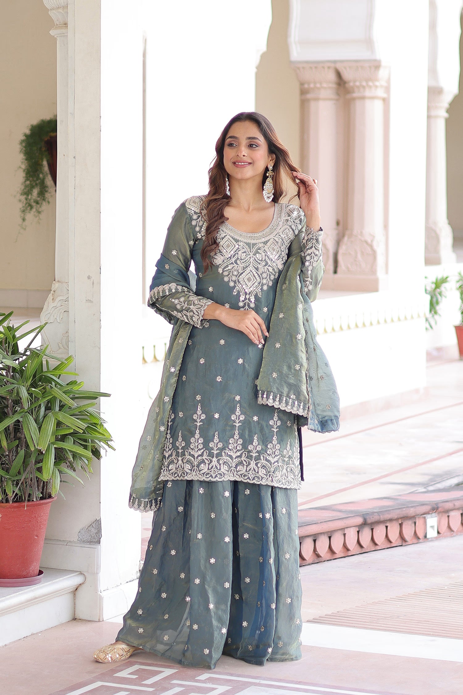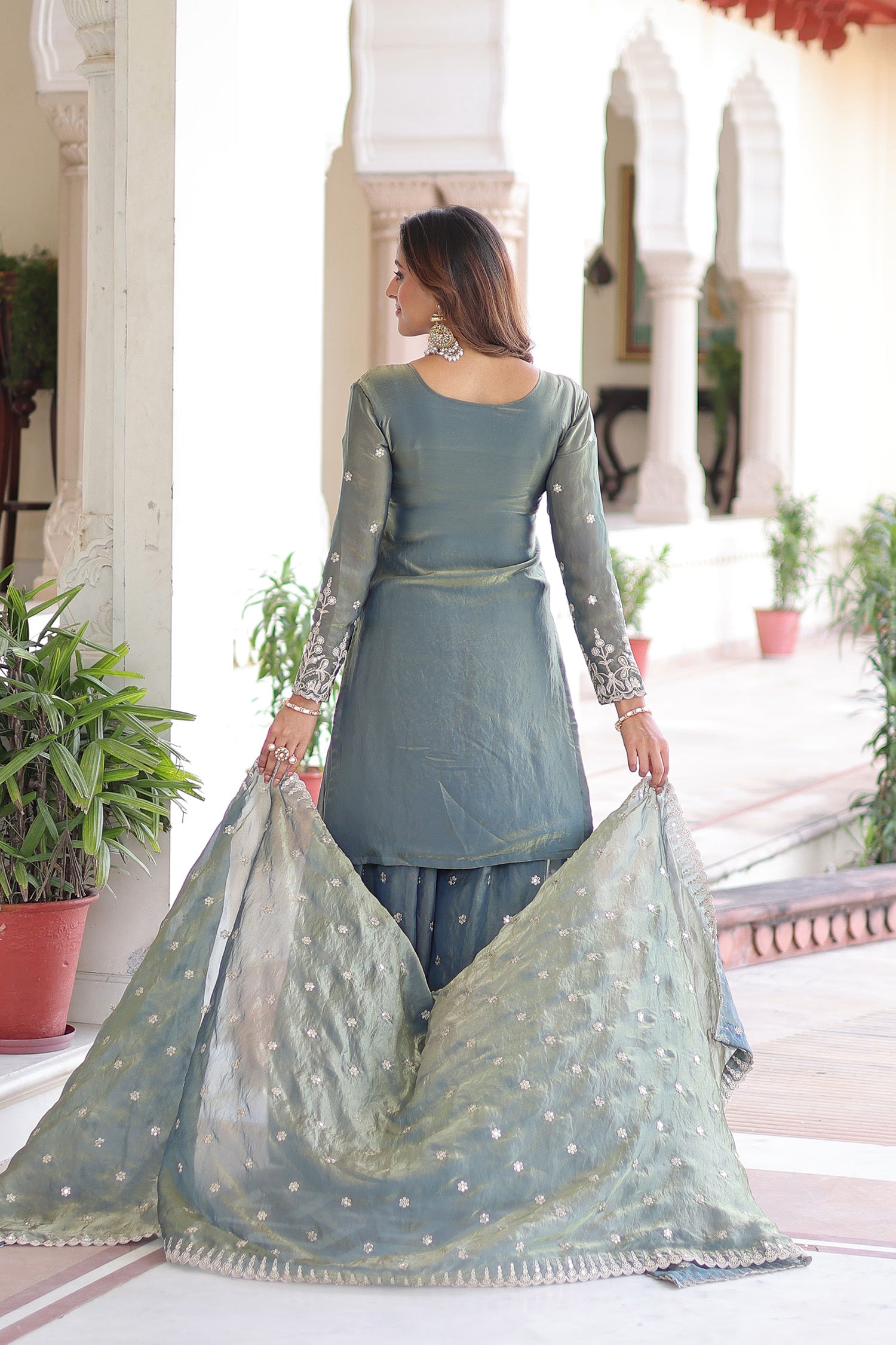 The round neckline of the kurta along with elbow length sleeves adorned with intricate embroidery and sequins work complemented with sharara pants and scallop border dupatta