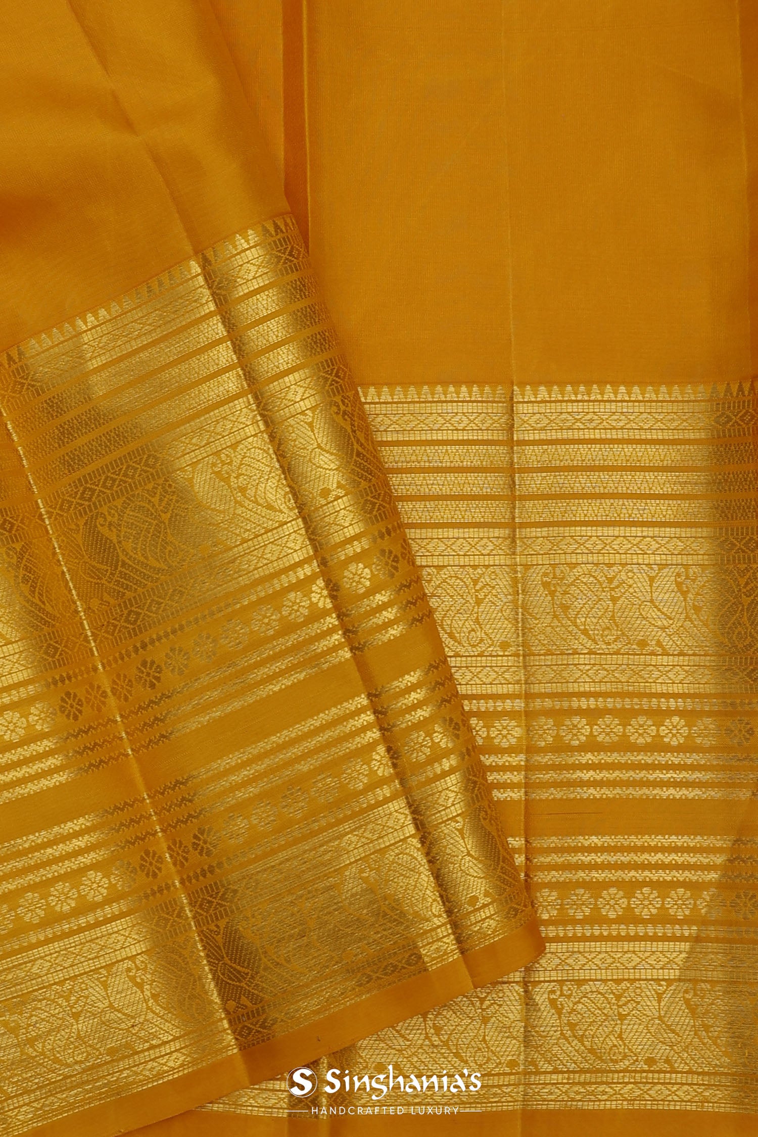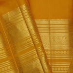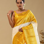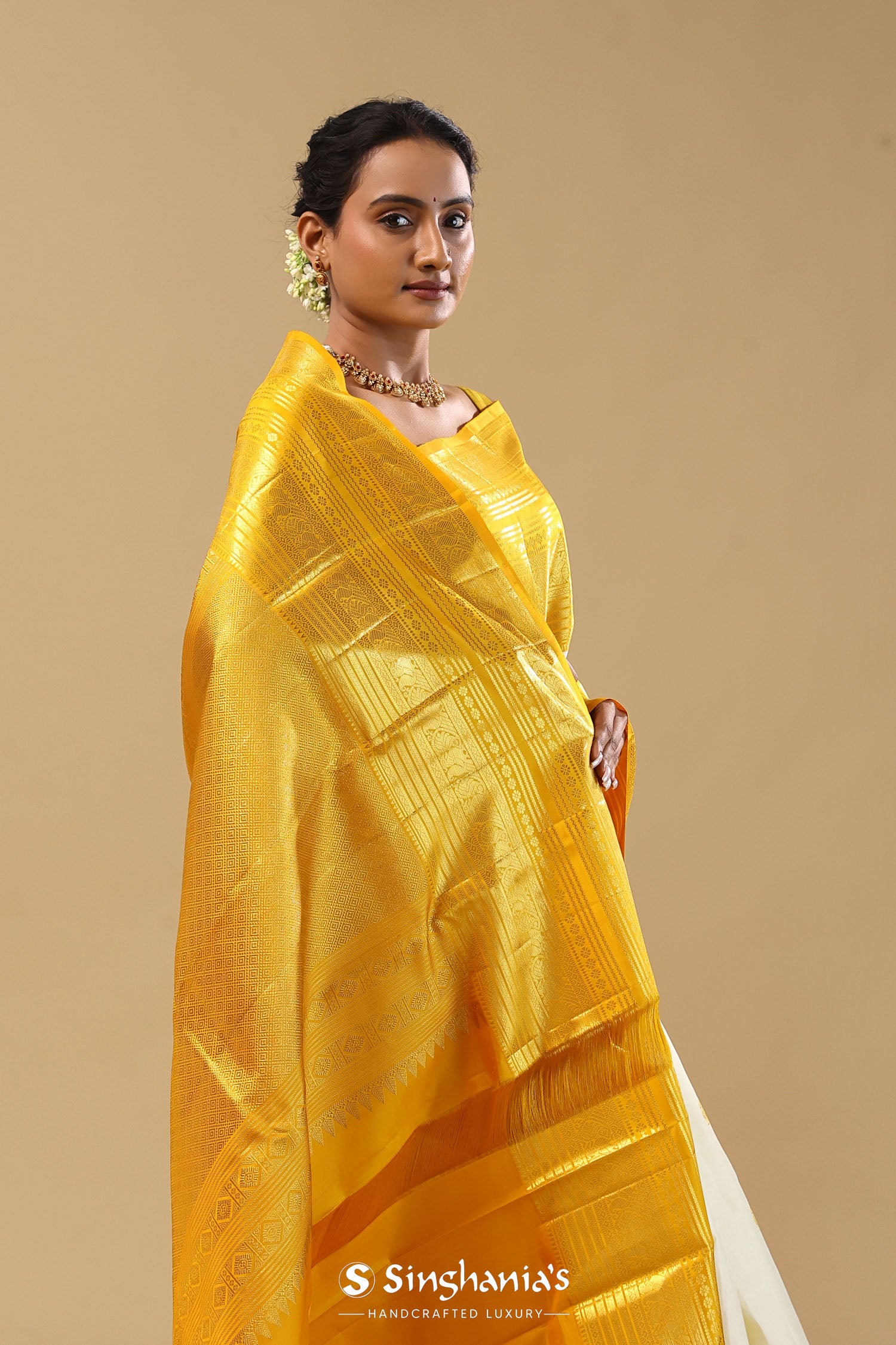 The peacock motifs woven with gold zari on the body of Off-white kanjivaram silk saree complemented with yellow border adorned with gold zari making it every moment festive.