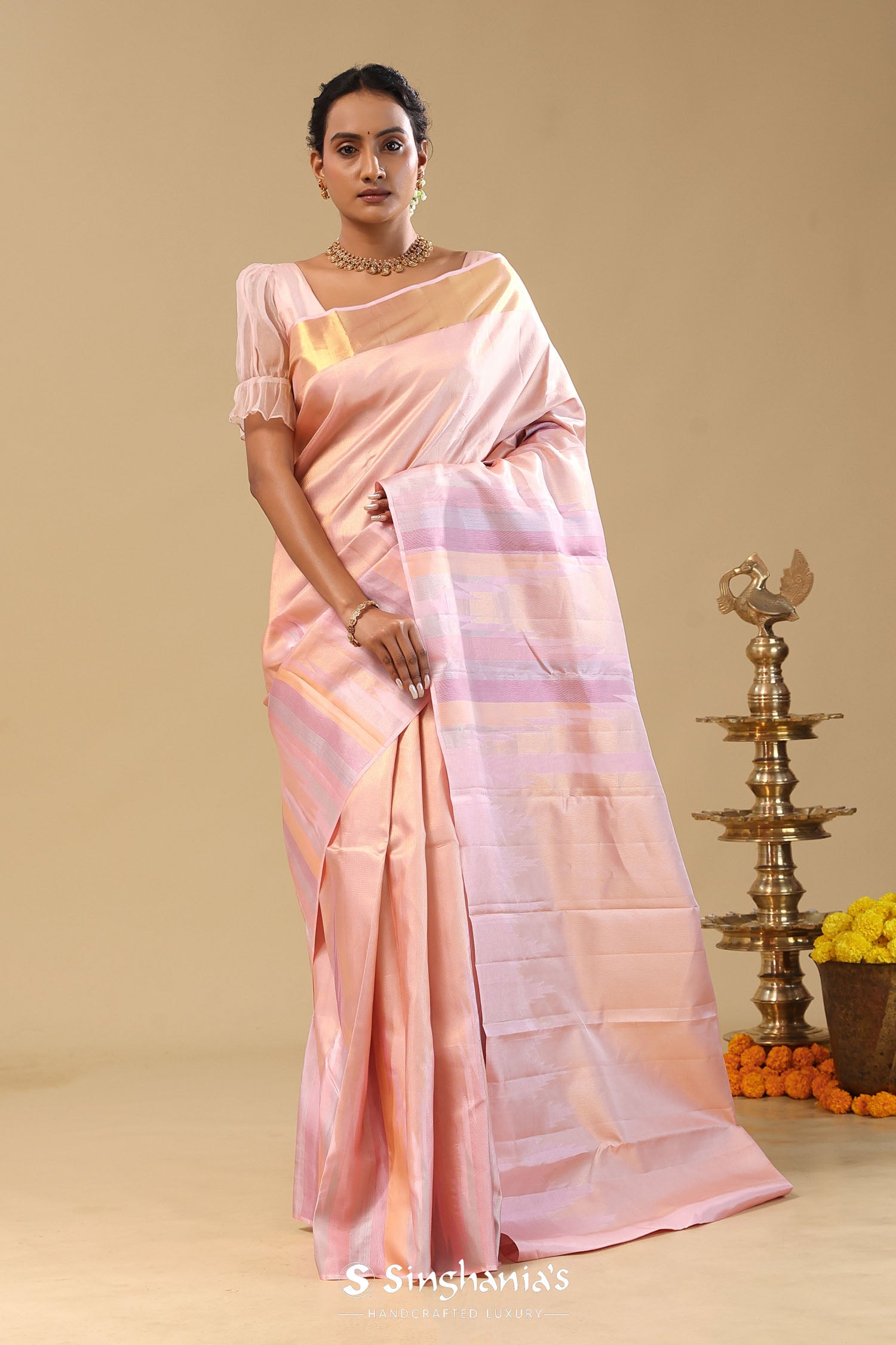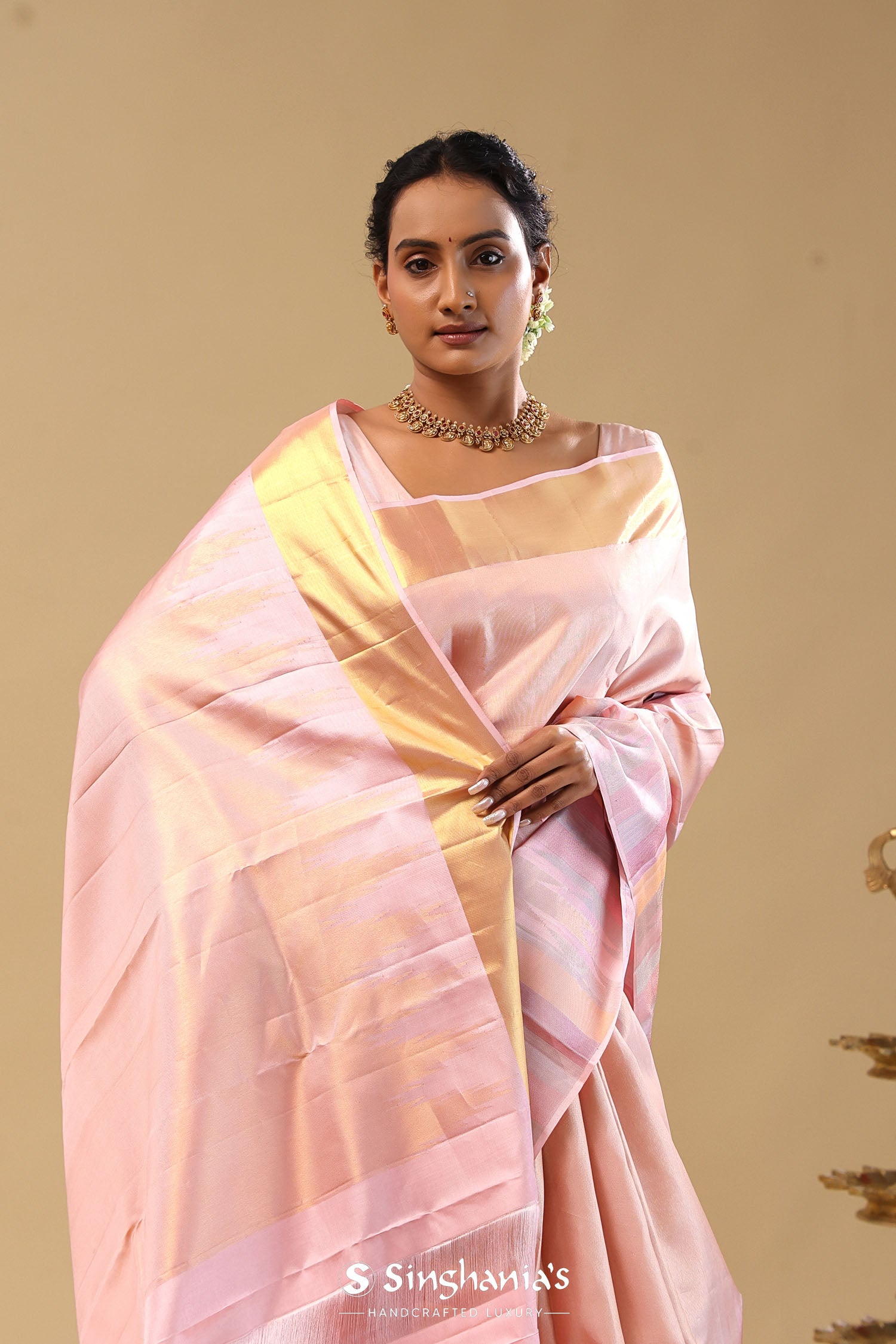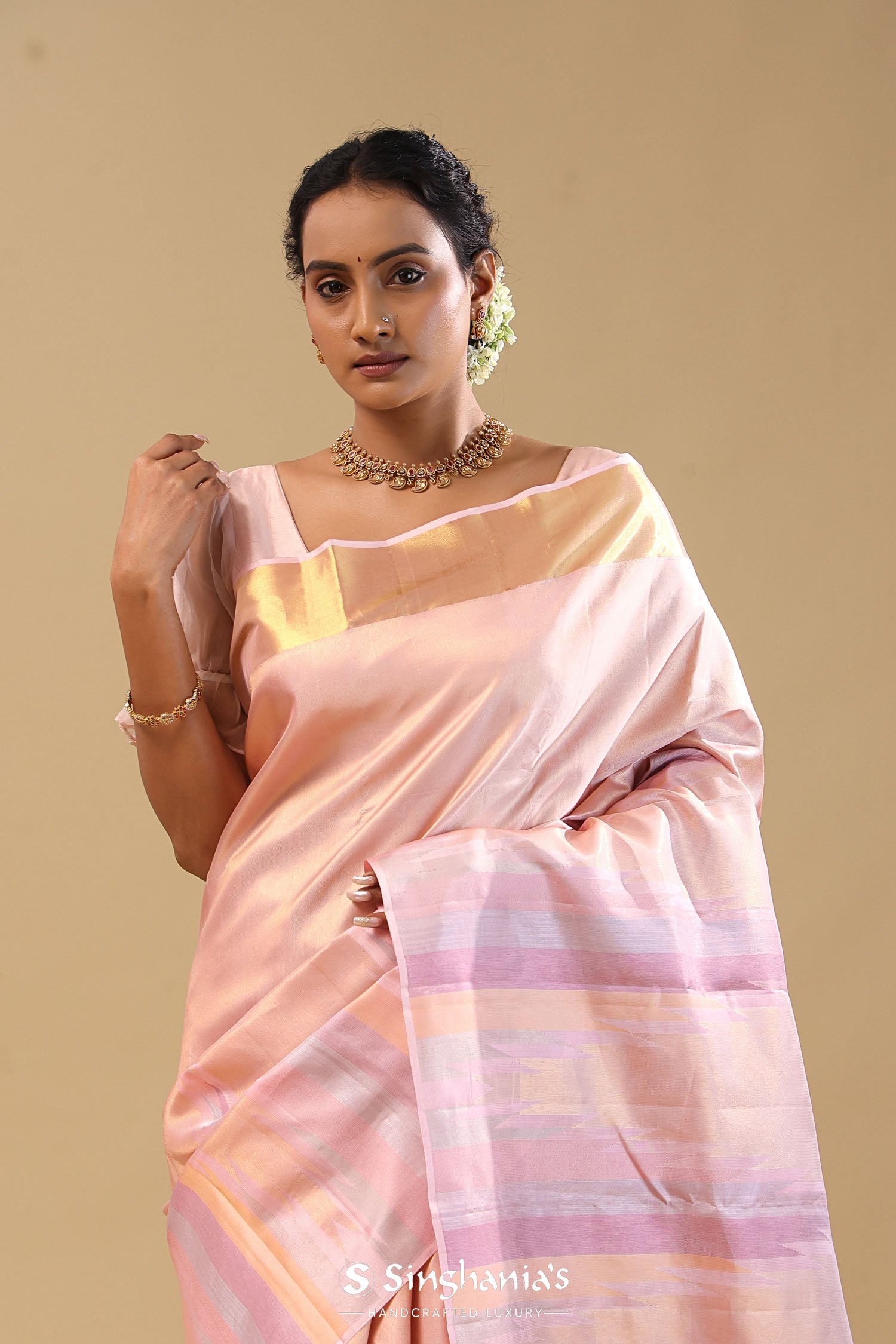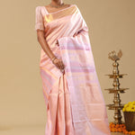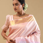 This Peach kanjivaram silk saree is timeless piece with silk as a base along with gold zari border, temple border and unstretched blouse .Where weaving reflects royalty and richness.Perfect for traditional occasions.