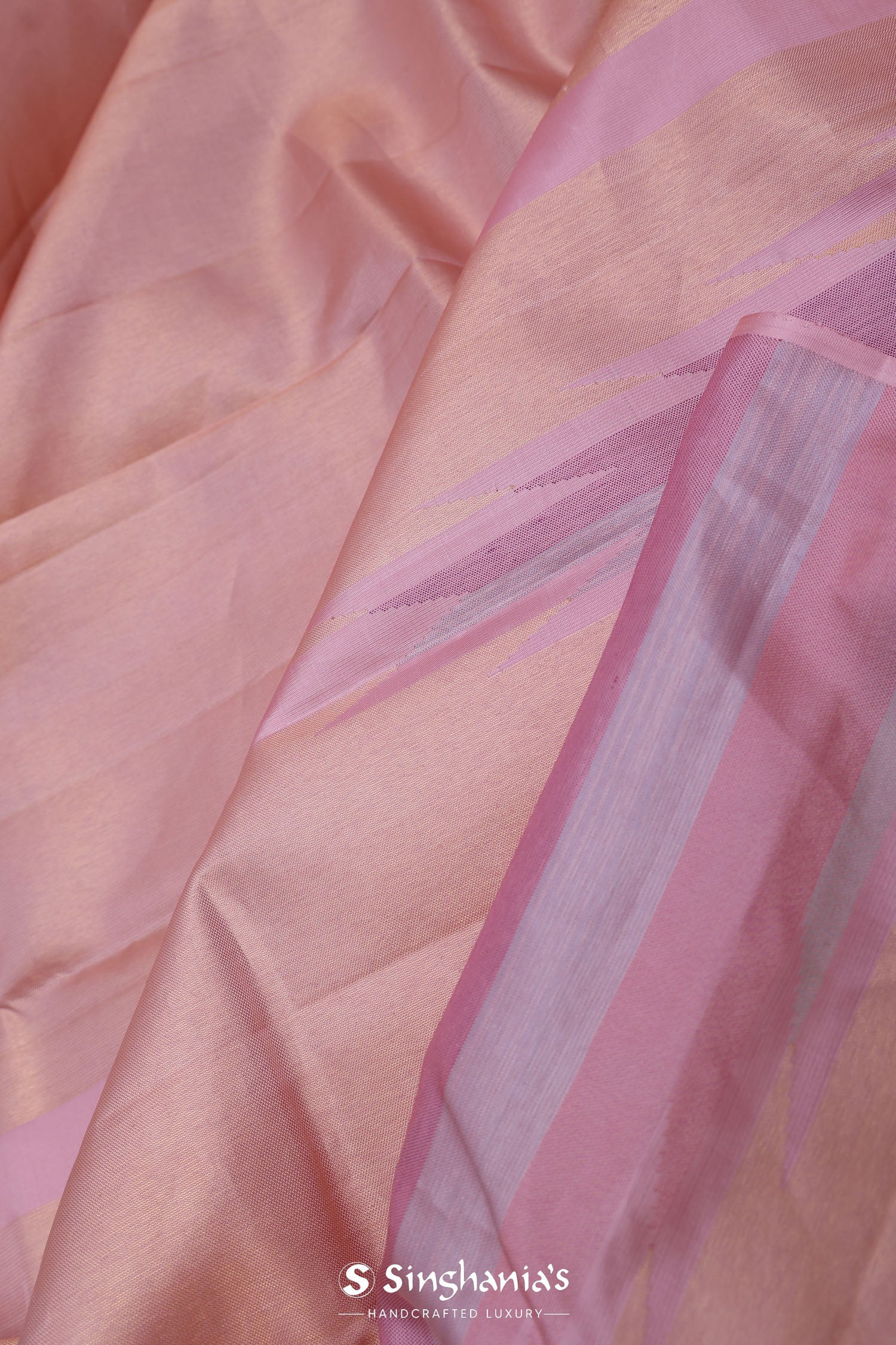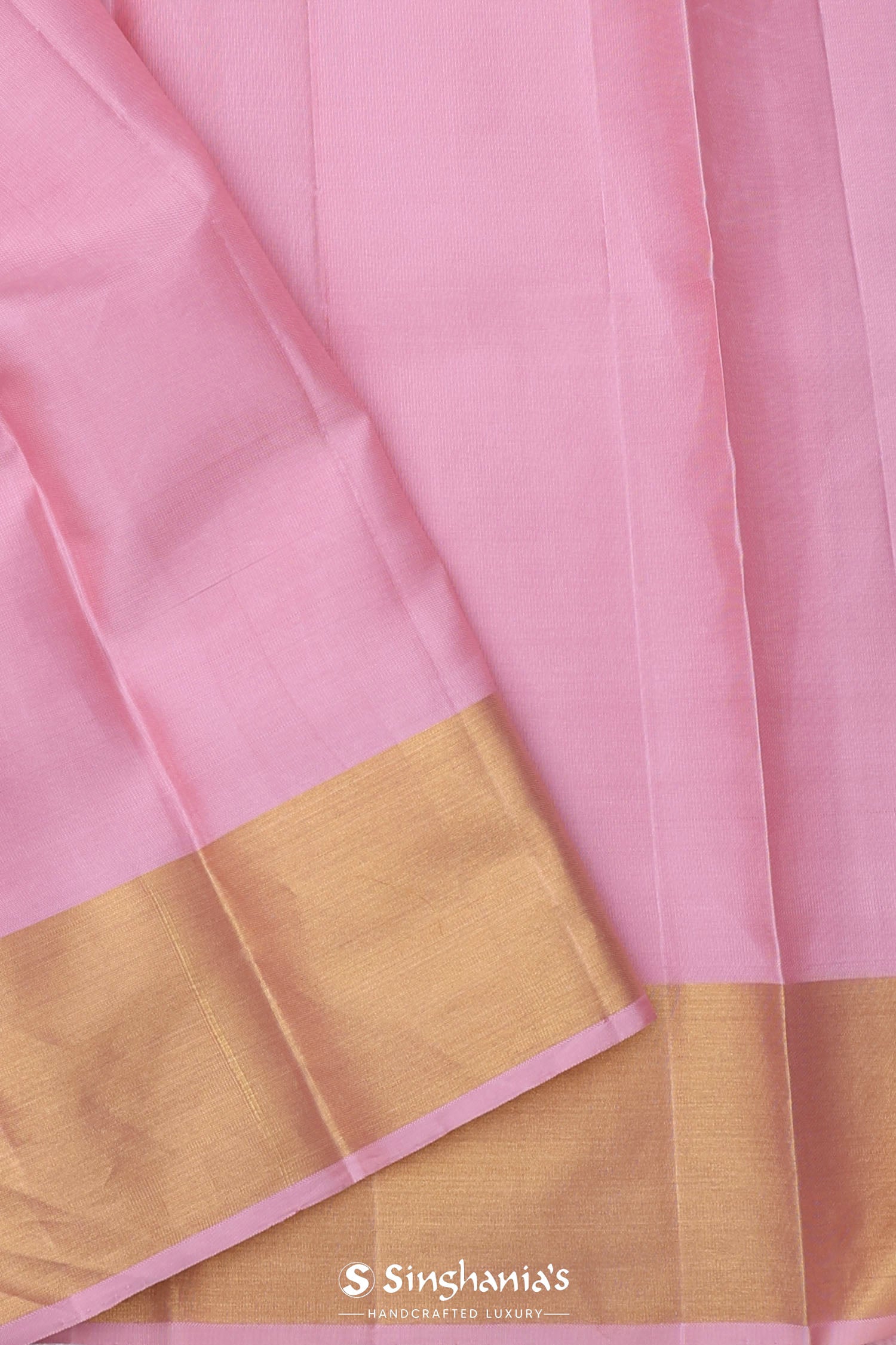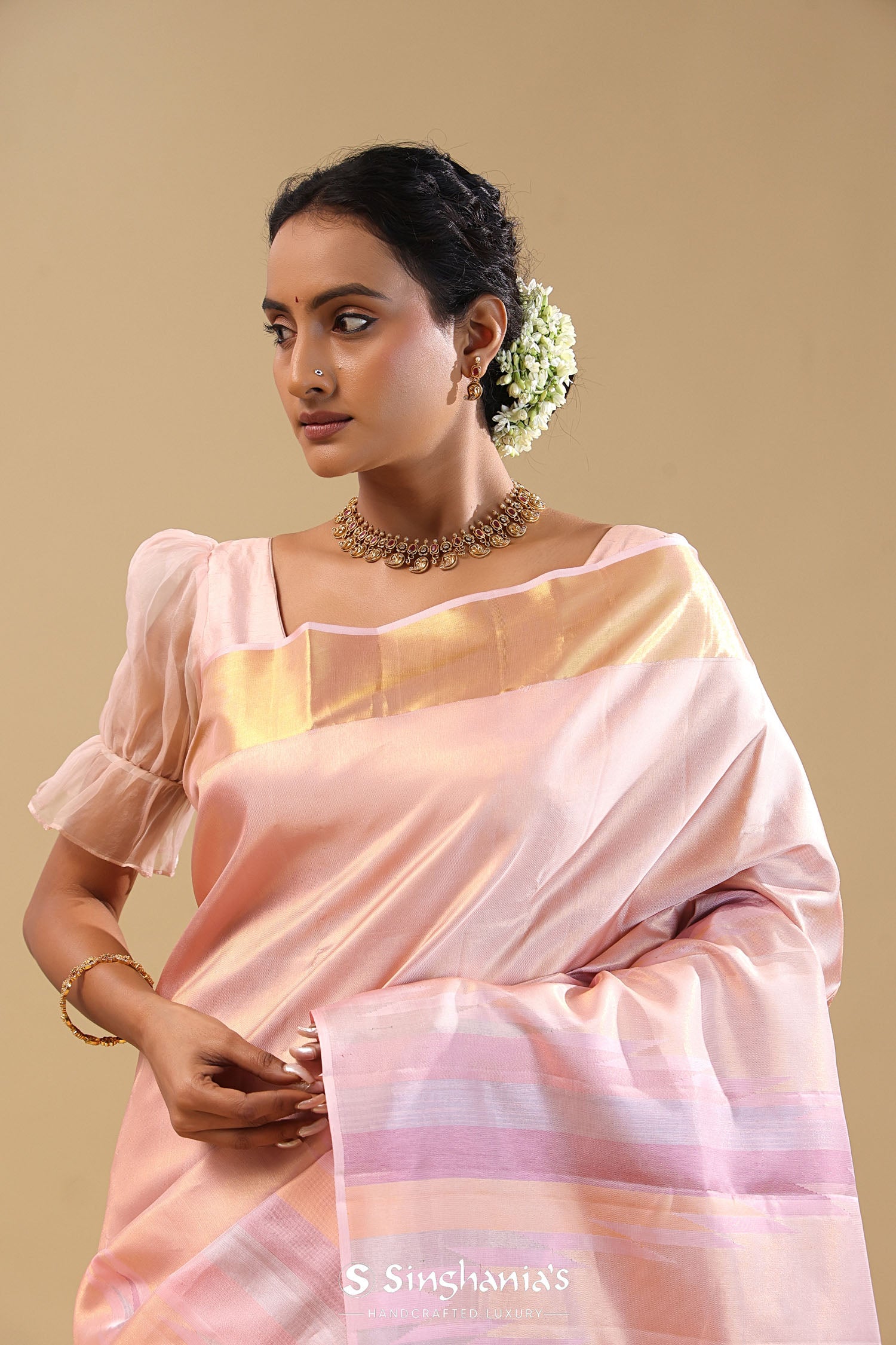 This Peach kanjivaram silk saree is timeless piece with silk as a base along with gold zari border, temple border and unstretched blouse .Where weaving reflects royalty and richness.Perfect for traditional occasions.