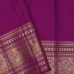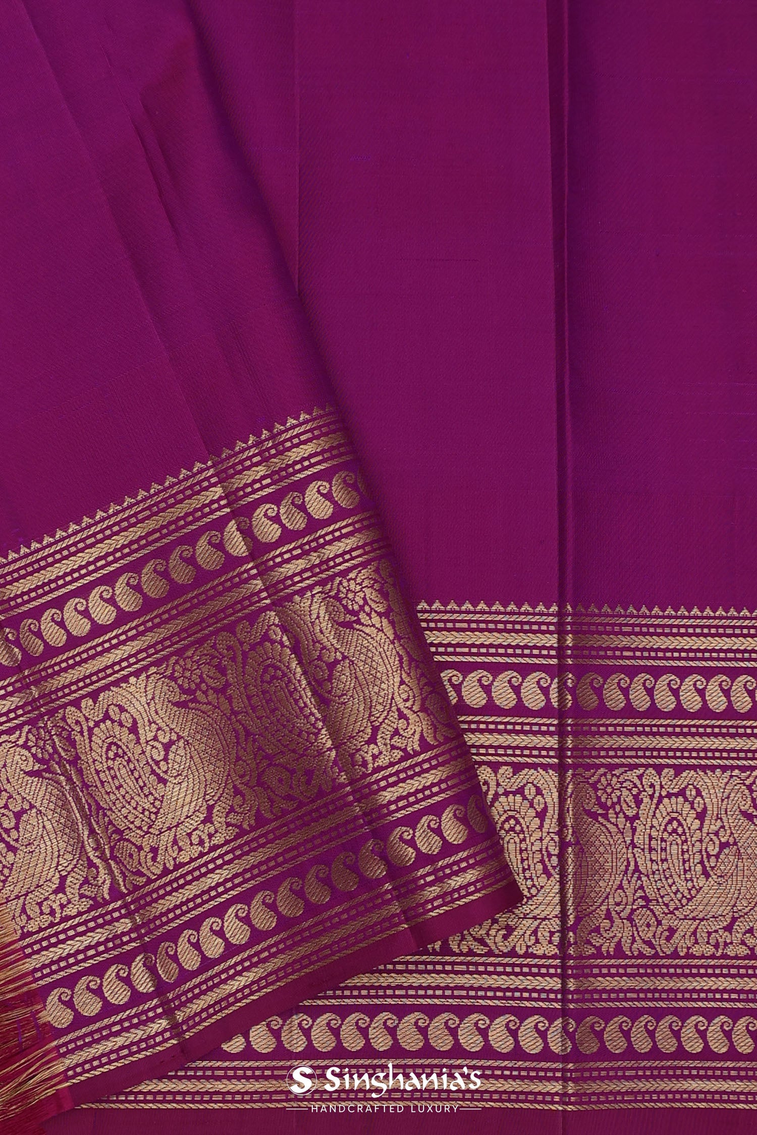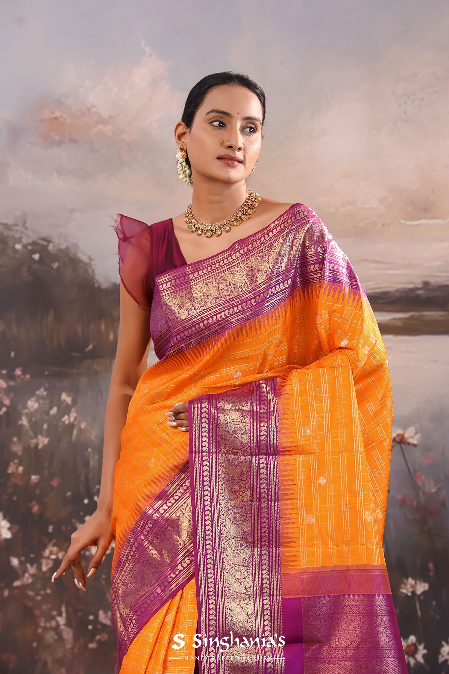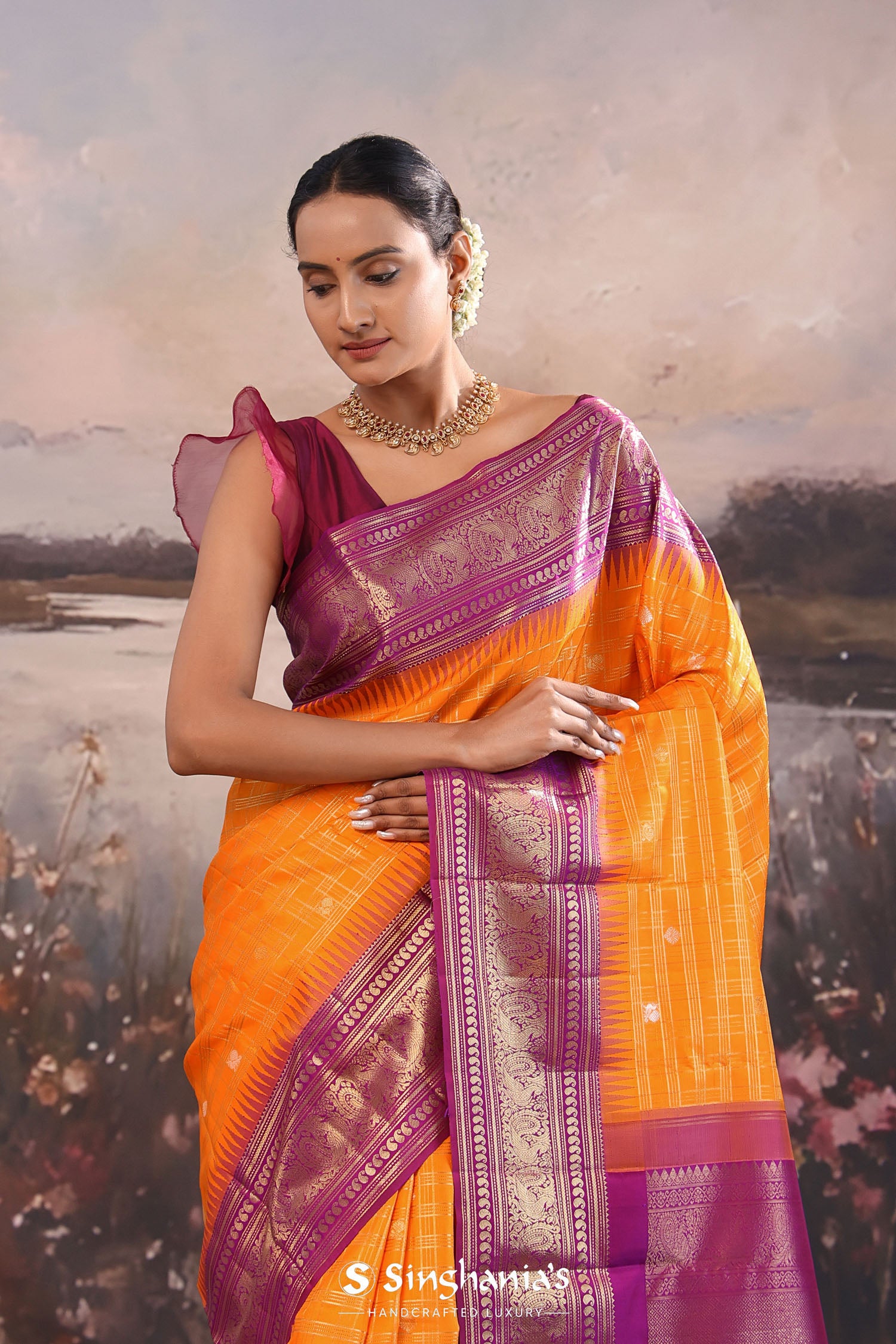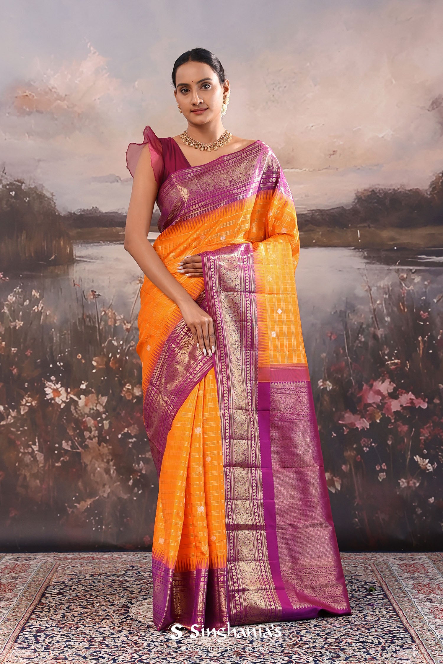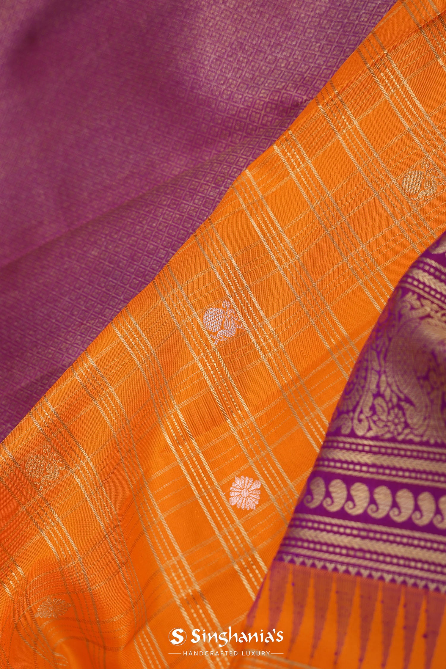 The checks pattern woven with gold zari along with peacock motifs woven in silver zari on the body of Pumpkin orange kanjivaram silk saree complemented purple border