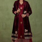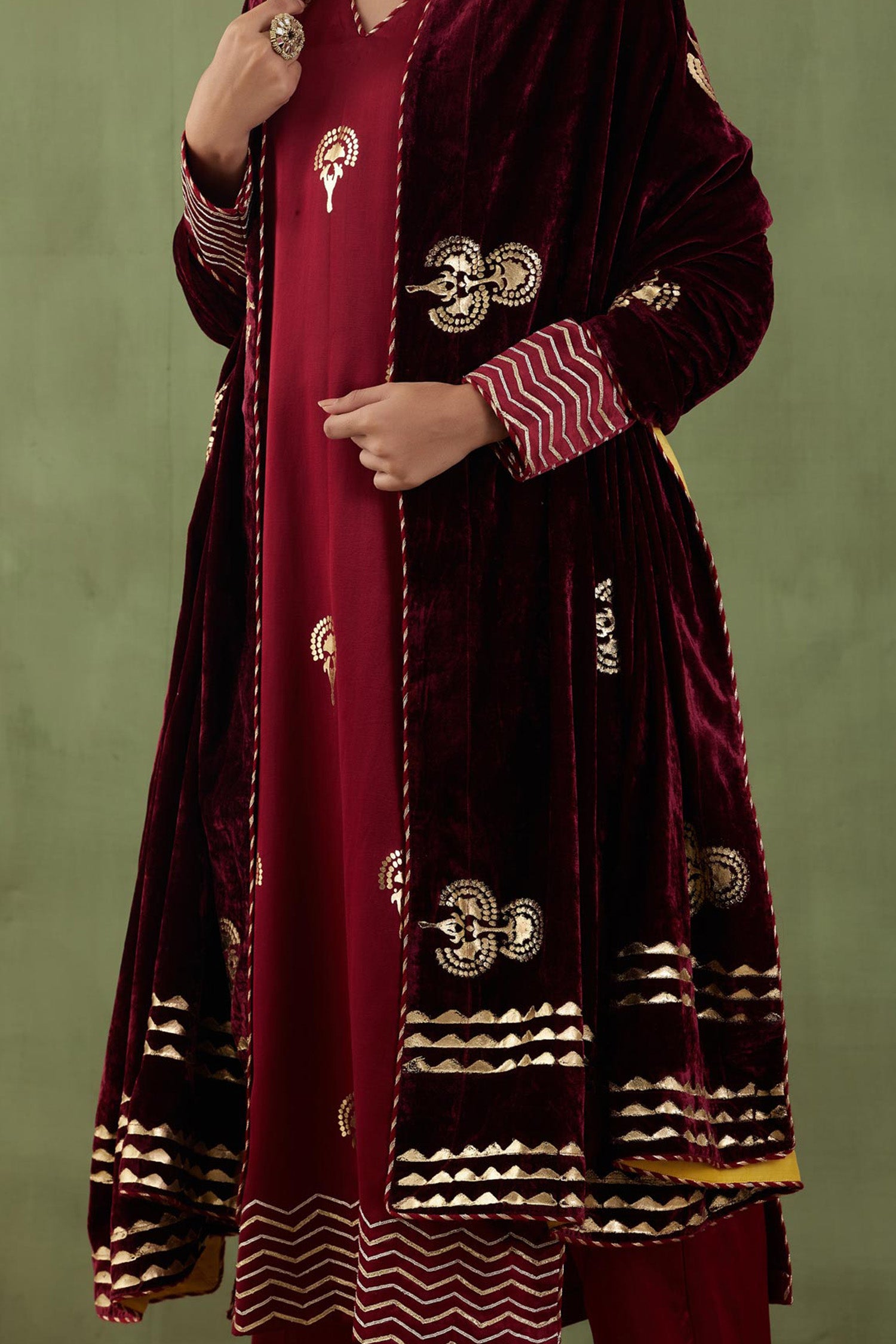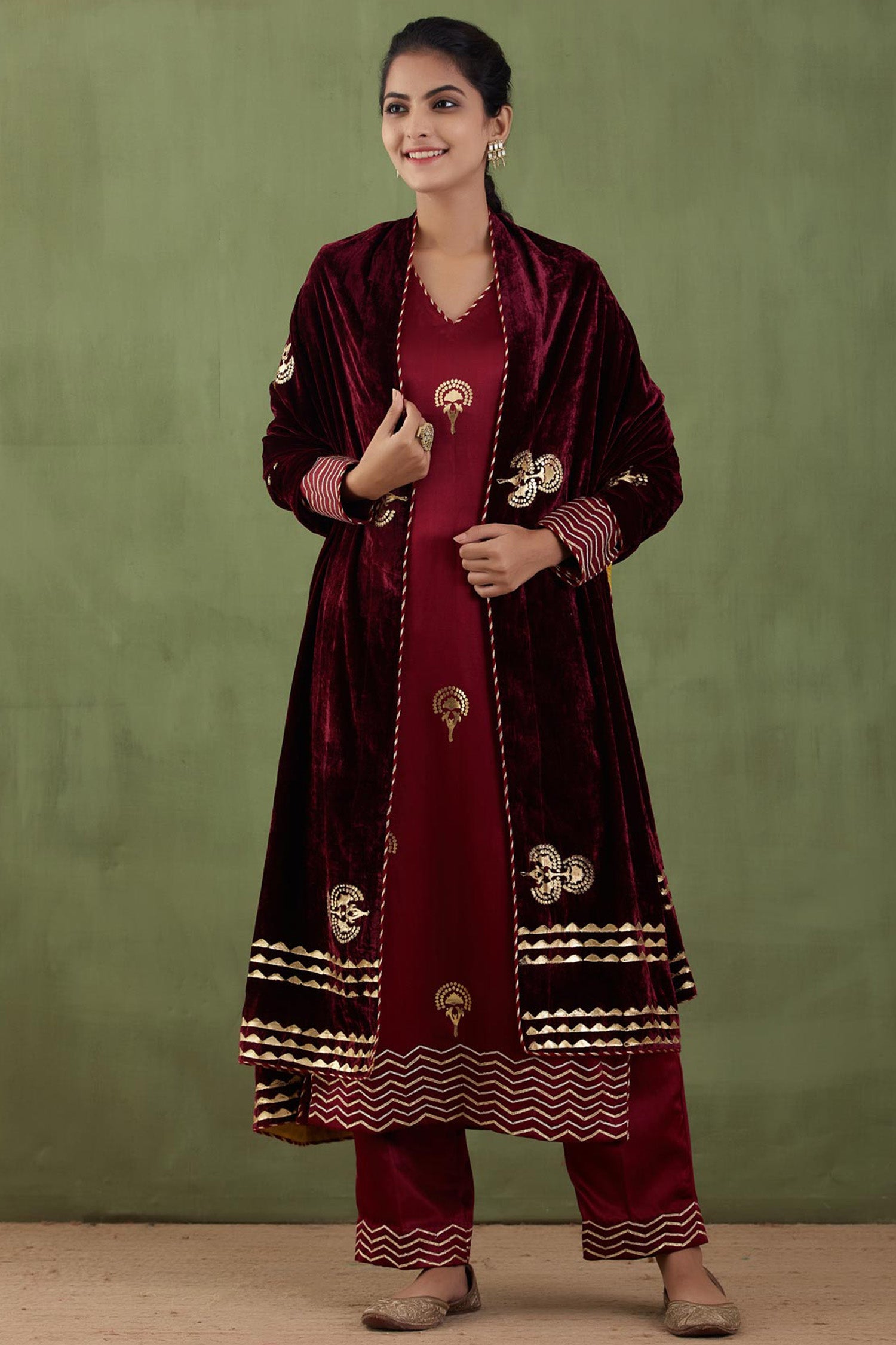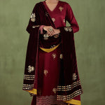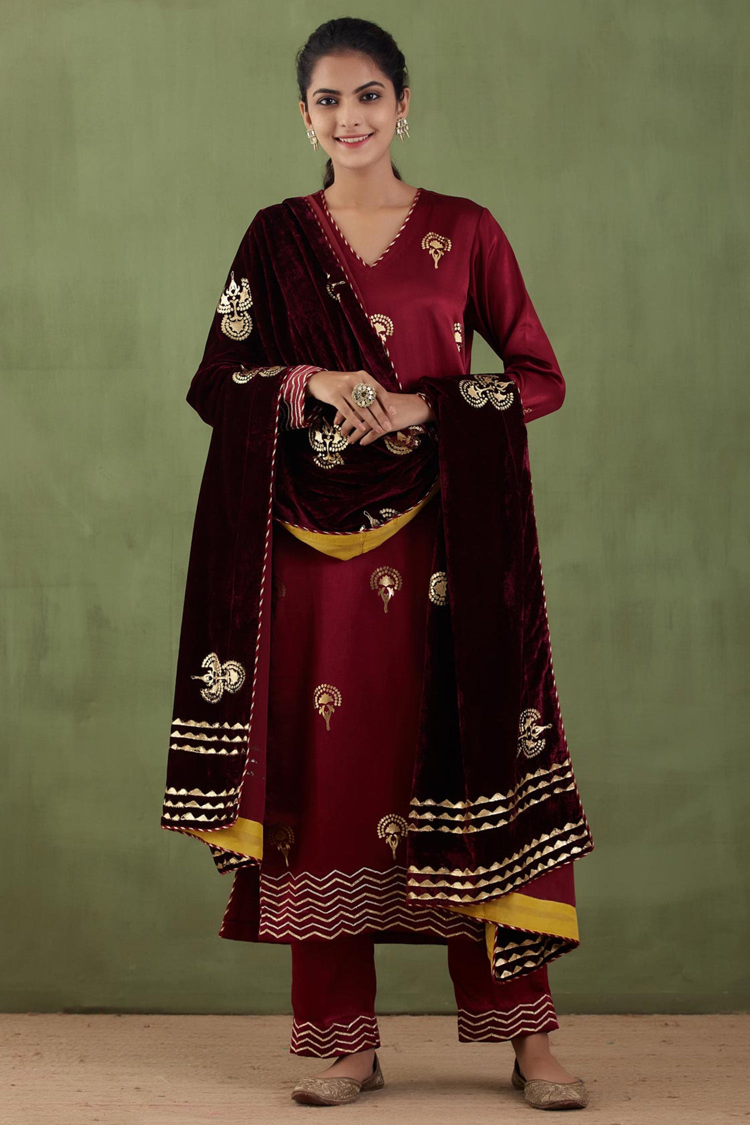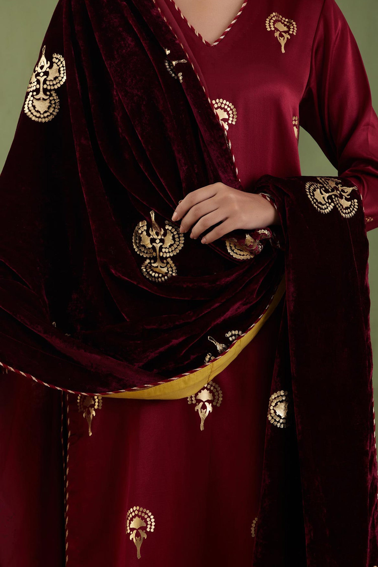 The dark maroon mashru silk straight kurta set with the matching pants and a velvet dupatta set along with the foil printed design for a rich look in casual and festive occasions.
