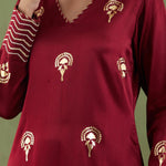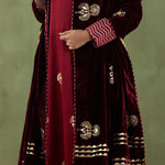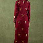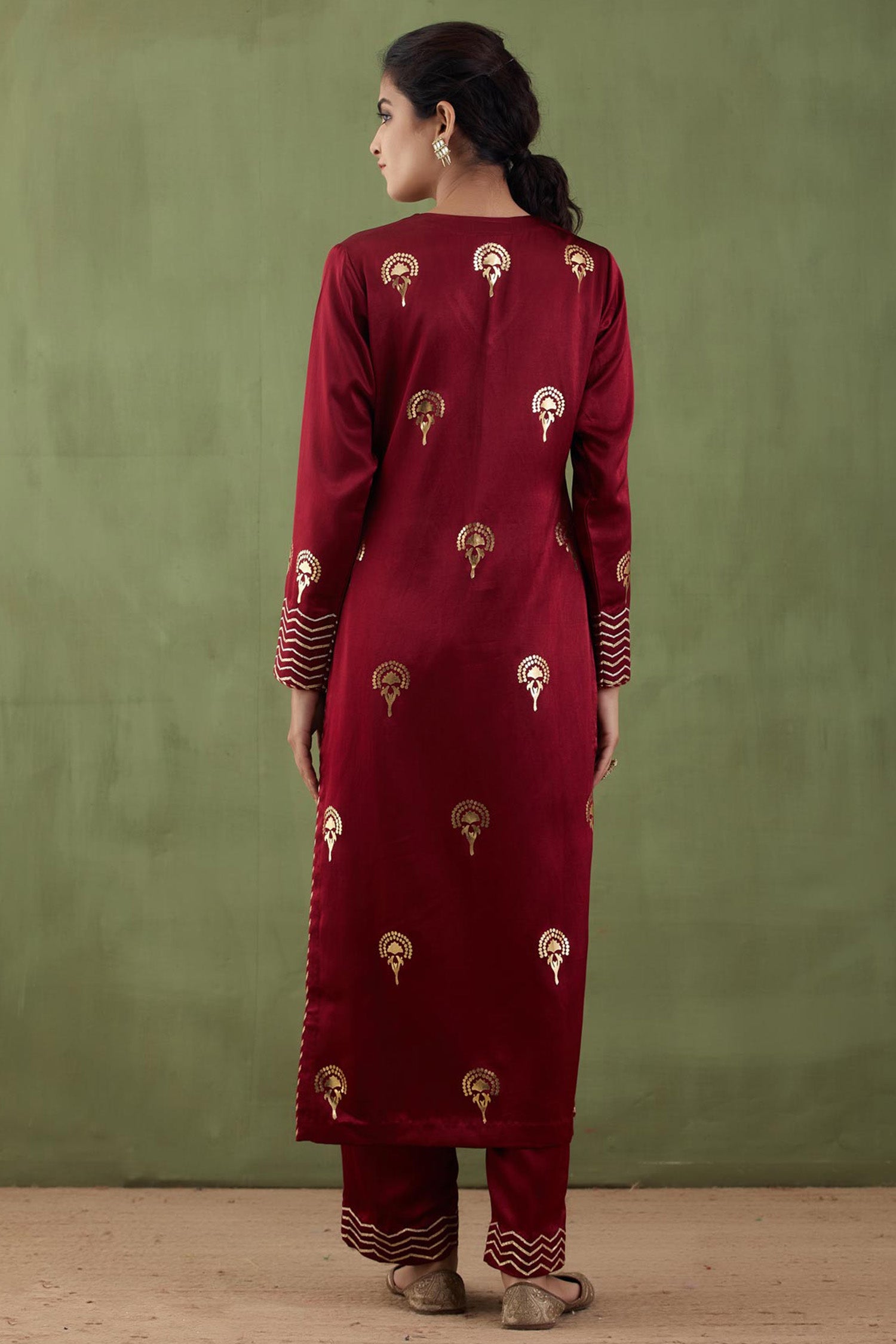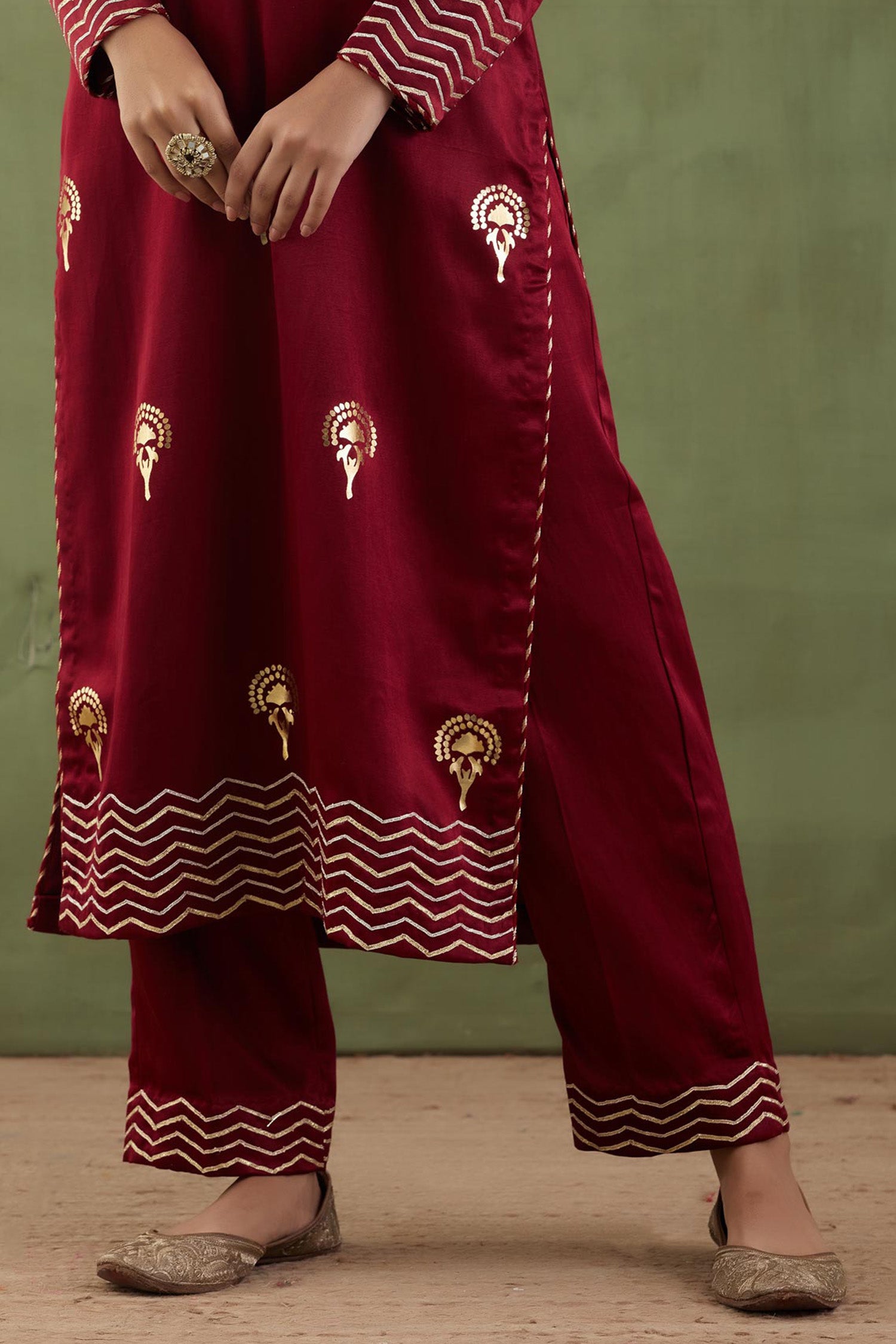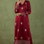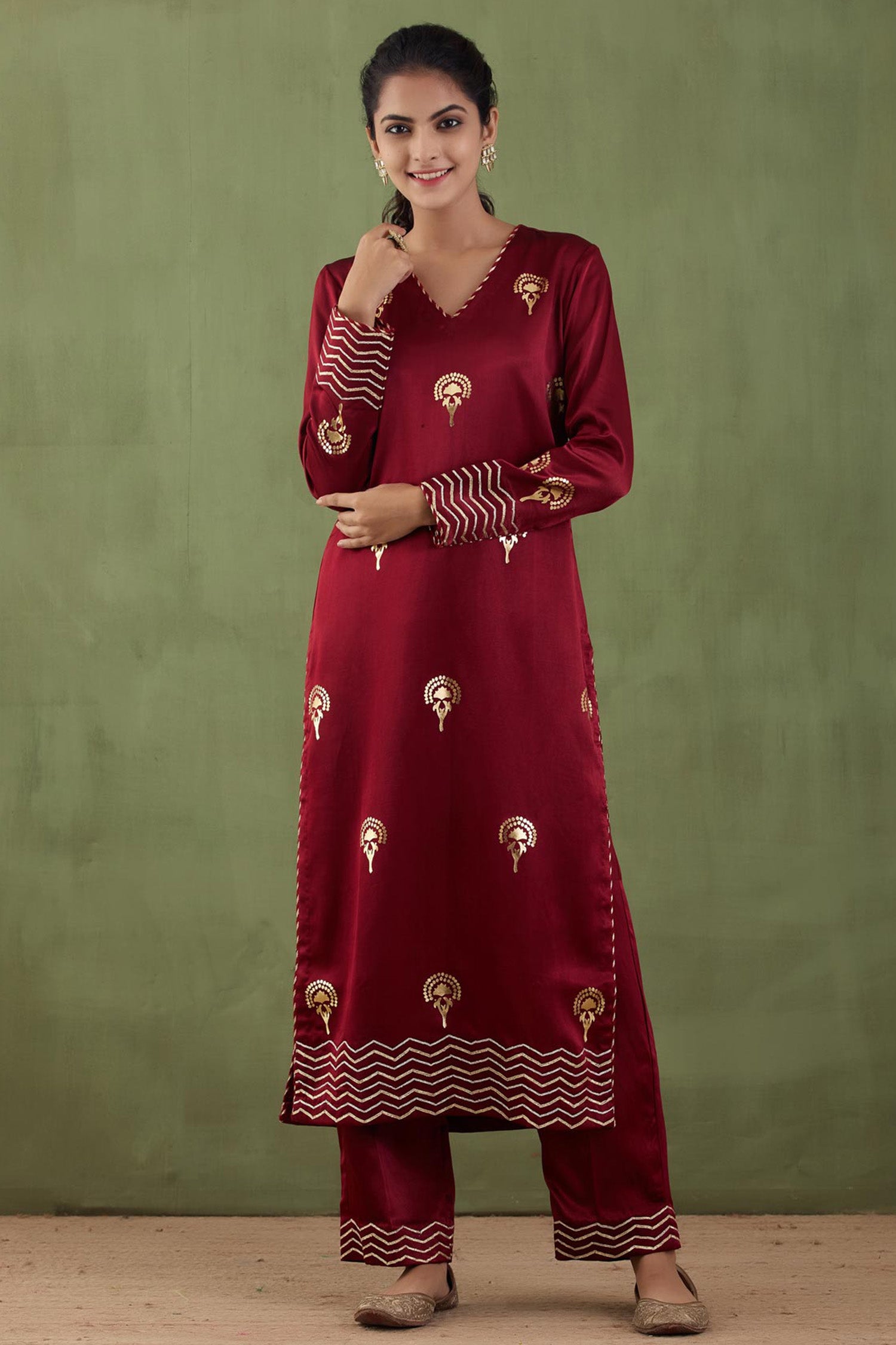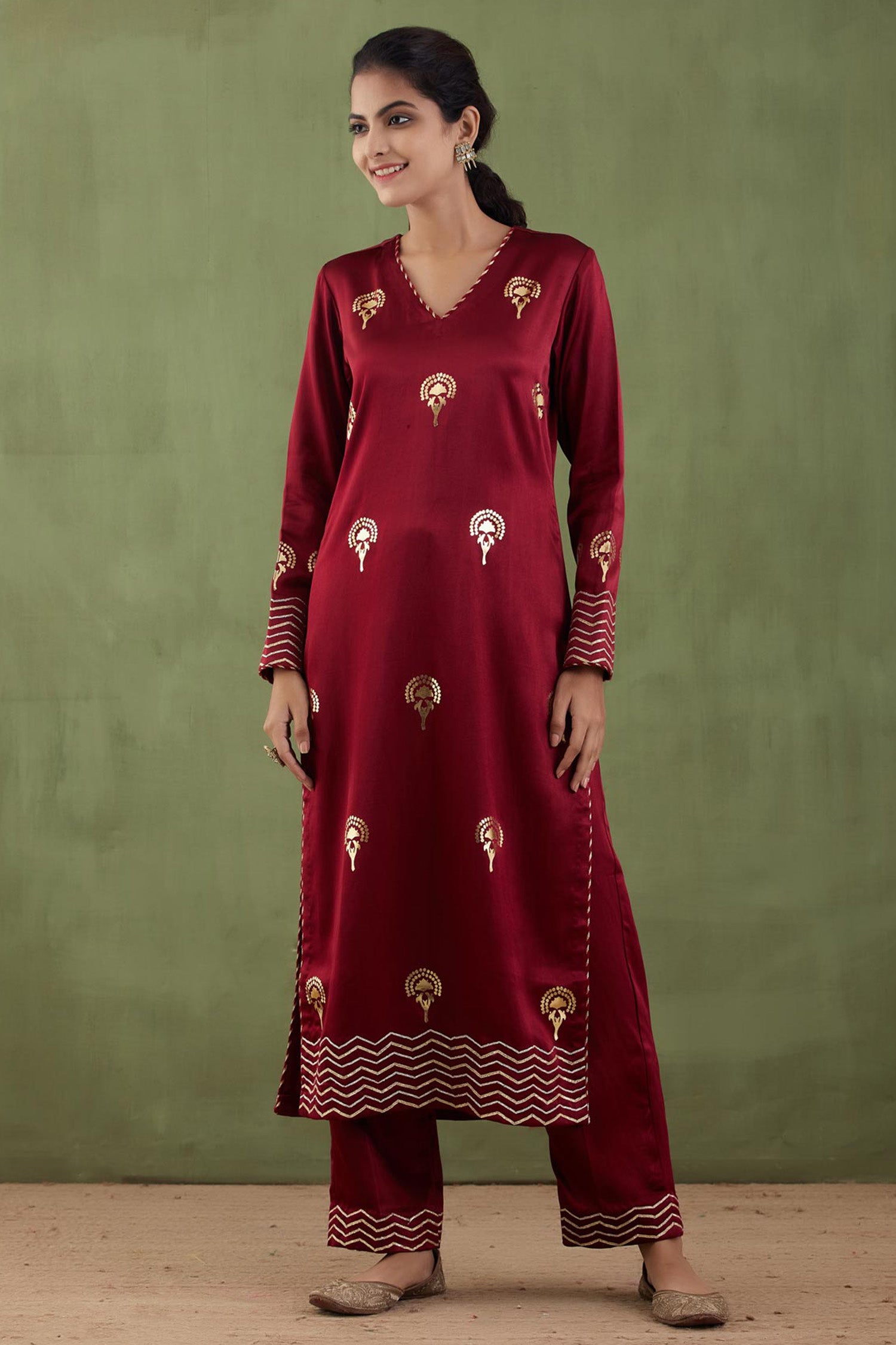 The dark maroon mashru silk straight kurta set with the matching pants and a velvet dupatta set along with the foil printed design for a rich look in casual and festive occasions.