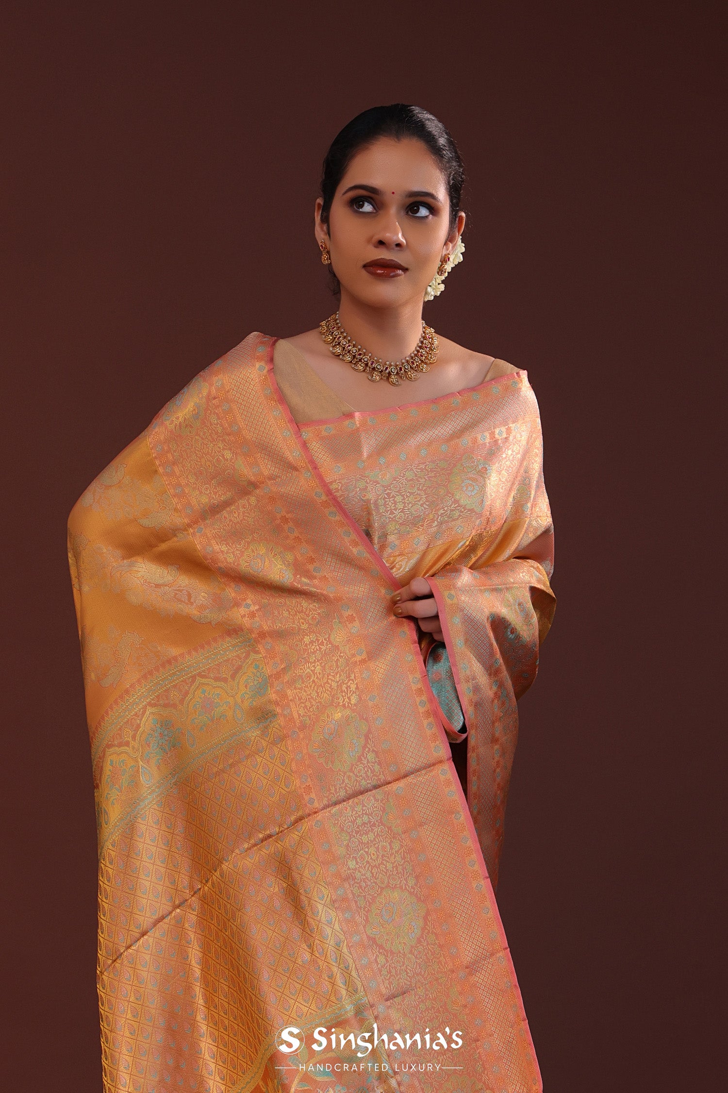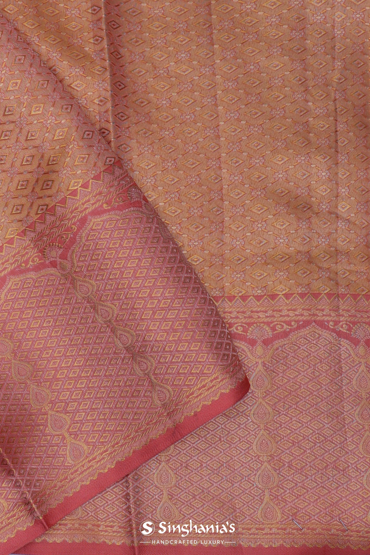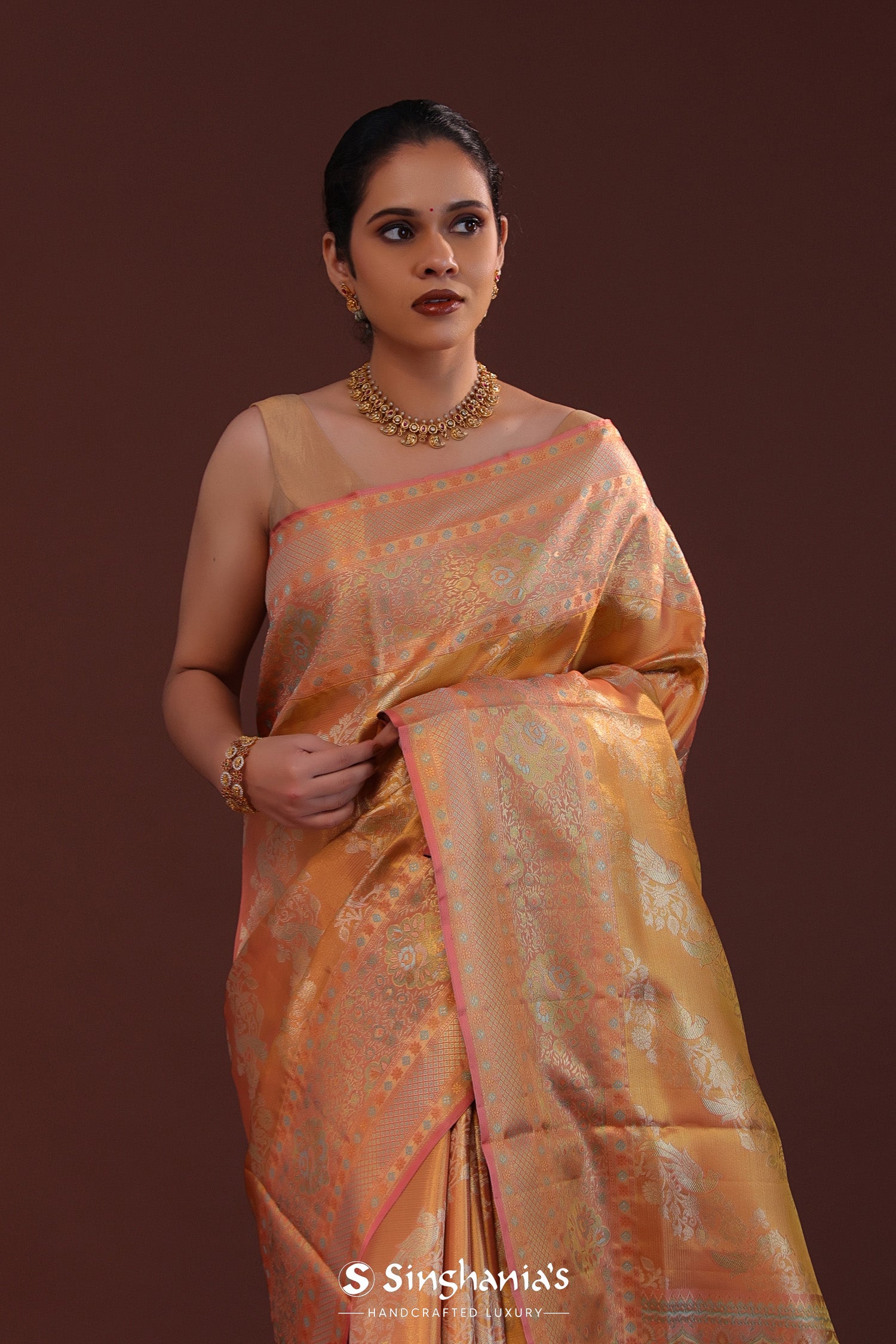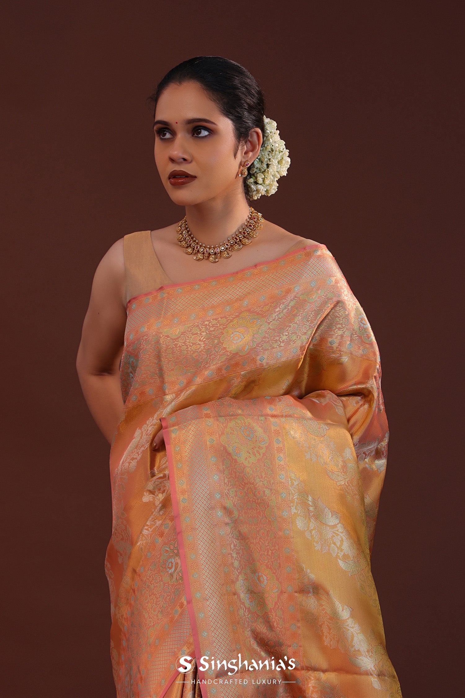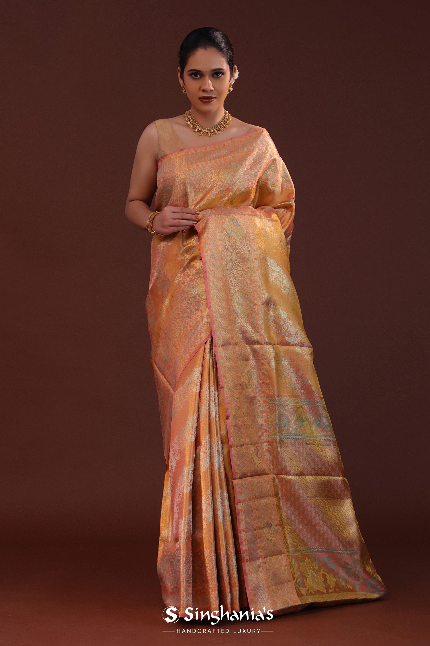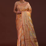 Dark Peach Kanjivaram Tissue Saree With Floral Weaving
