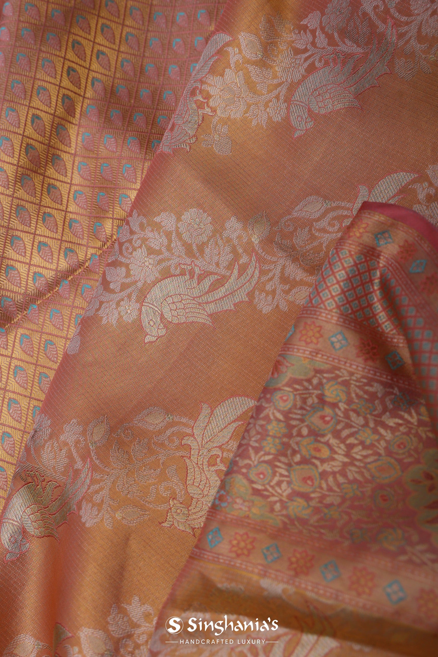 The diagonal floral and avian design woven on entire body of the Dark peach kanjivaram tissue saree complemented with meenakari border and unstitched blouse